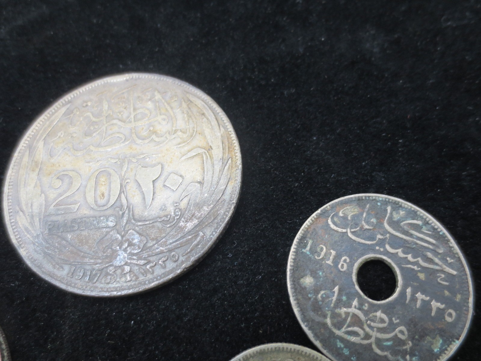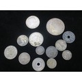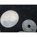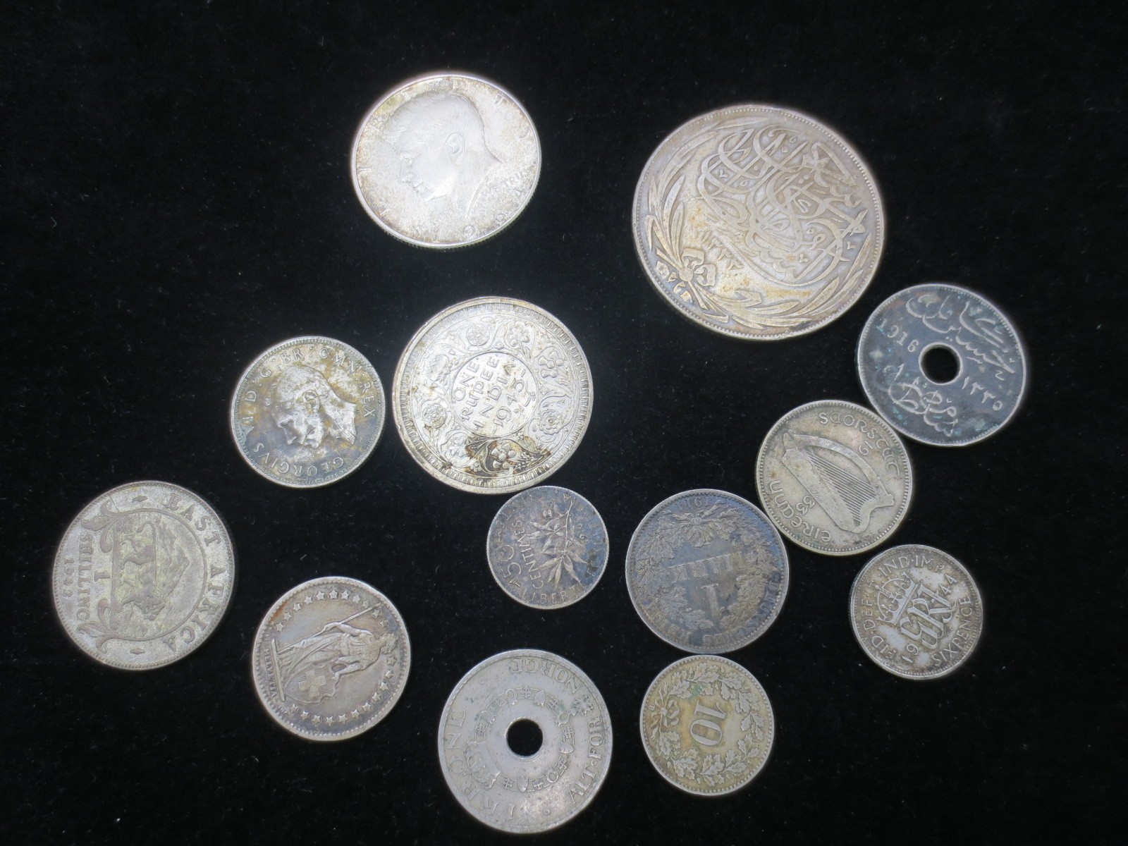 A small assortment of silver coinage including a 1917 Turkish 20 piastres, Irish shilling, WW1 French francs, 1964 Kennedy 1/2 dollar etc, as per photographs