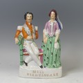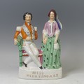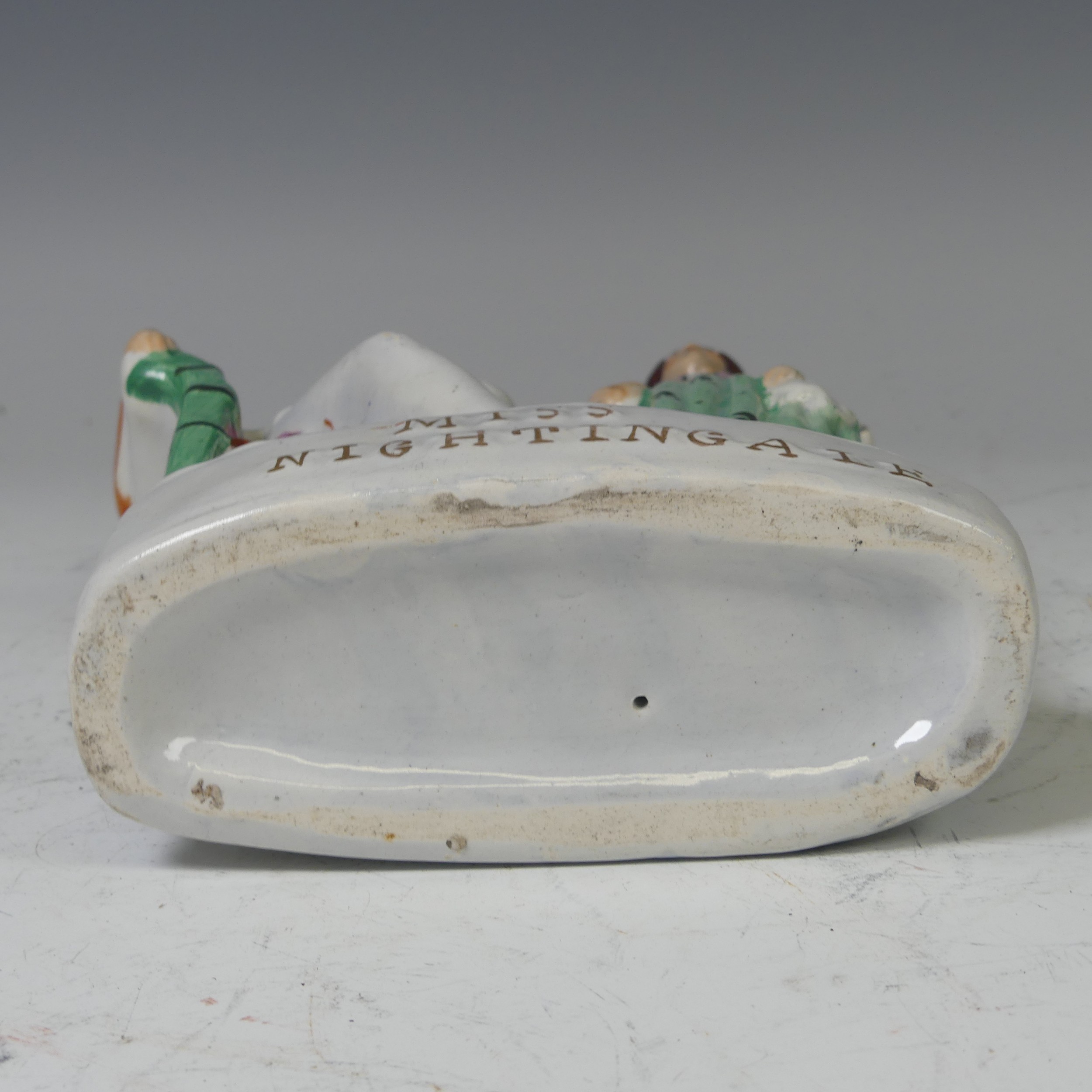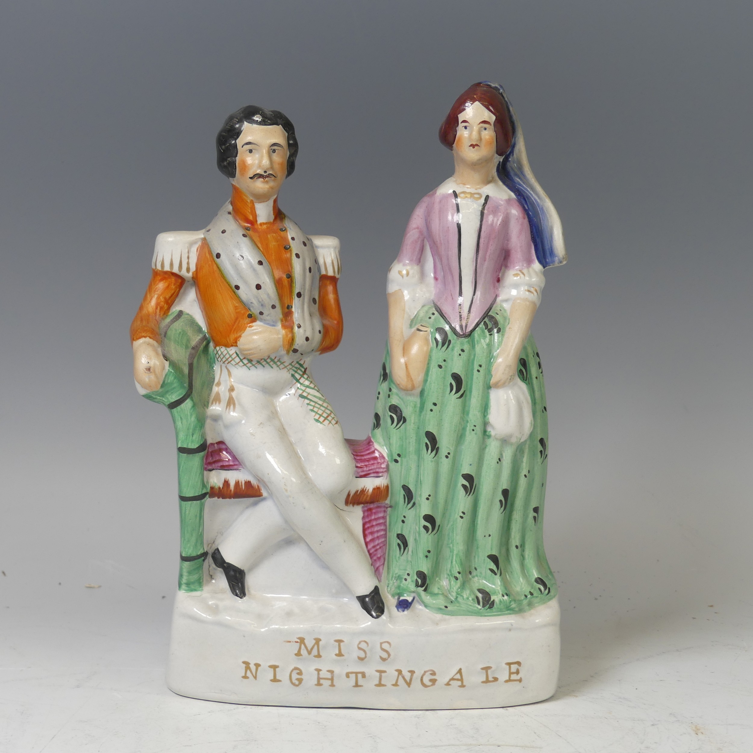 A mid-19th century Staffordshire pottery flatback figural group, Miss Nightingale, circa 1855, modelled as Florence Nightingale standing beside an officer seated with his arm in a sling, titled plinth, 26cm high.