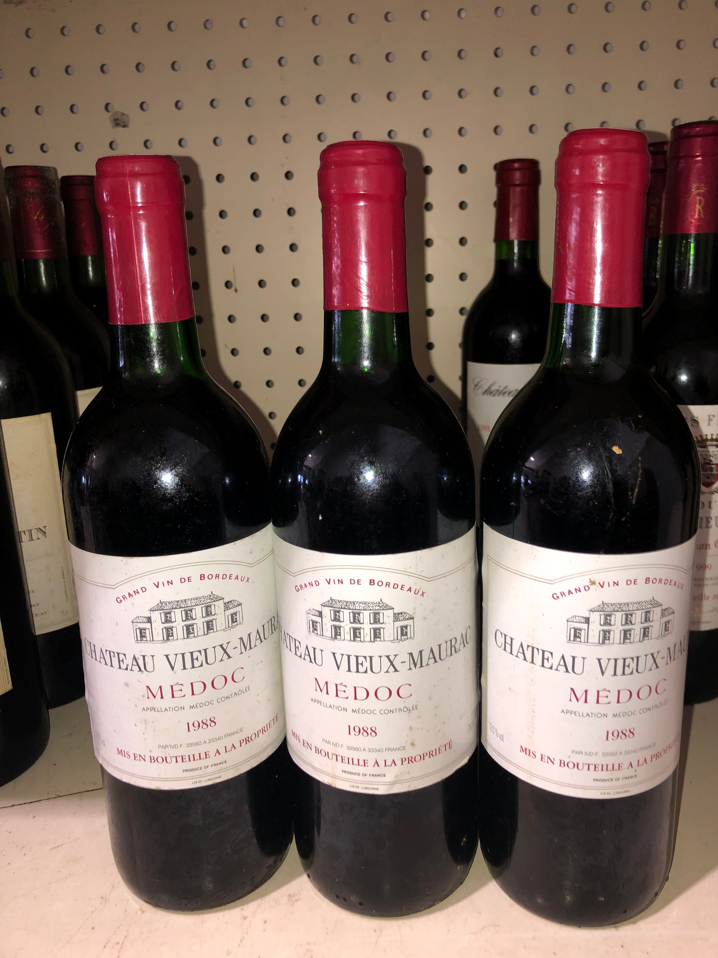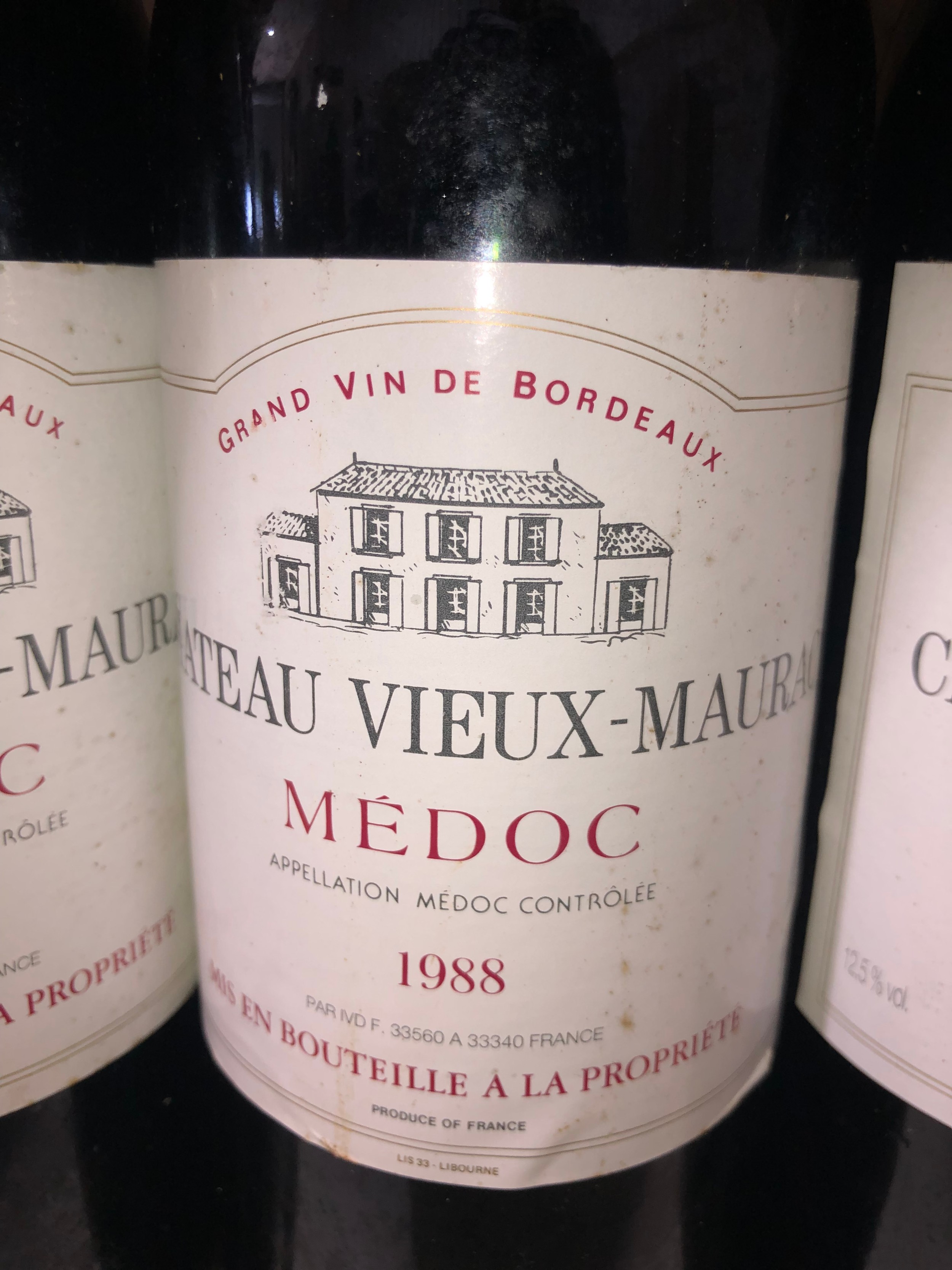 3 bottle of 1988 Chateau Vieux-Maurac, Bordeaux, France. Stored in a temperature and humidity controlled environment whilst aging. See lot 151 for pictures of gauges.