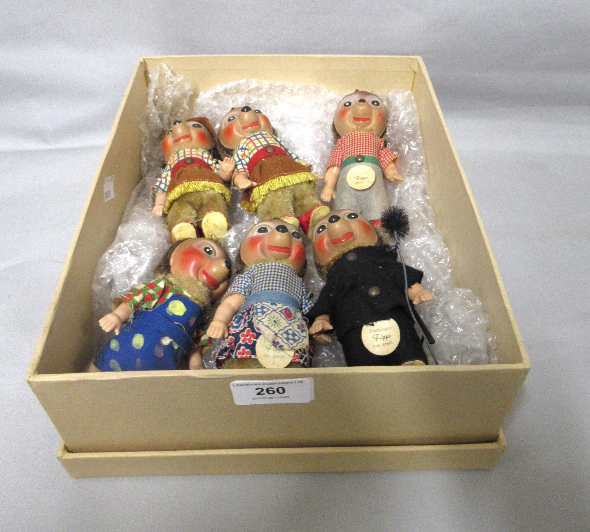 Group of six 1930s Steiff clockwork hedgehogs, including chimney sweep etc.