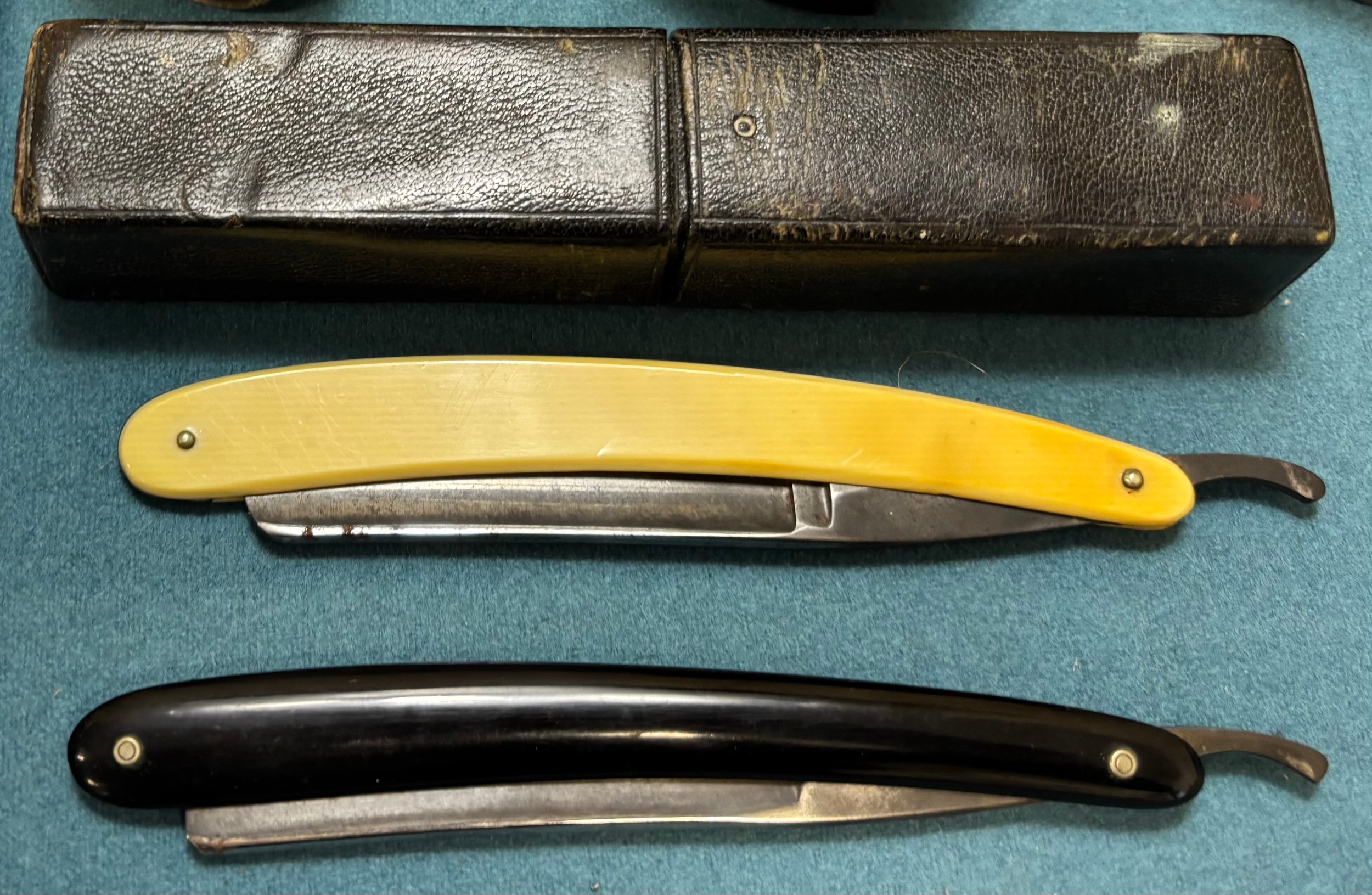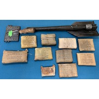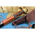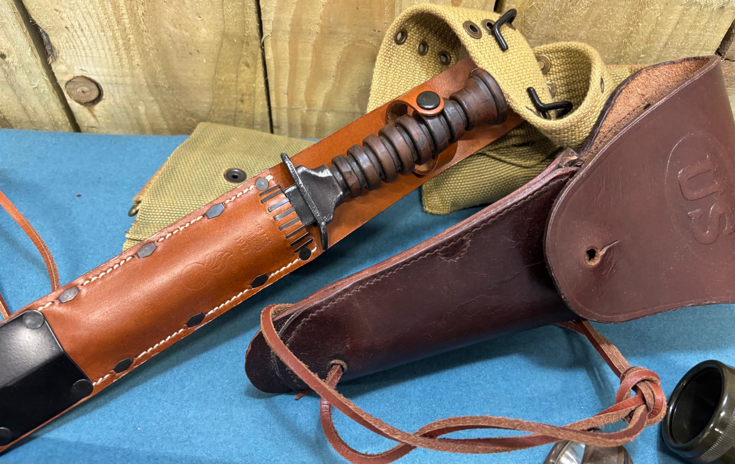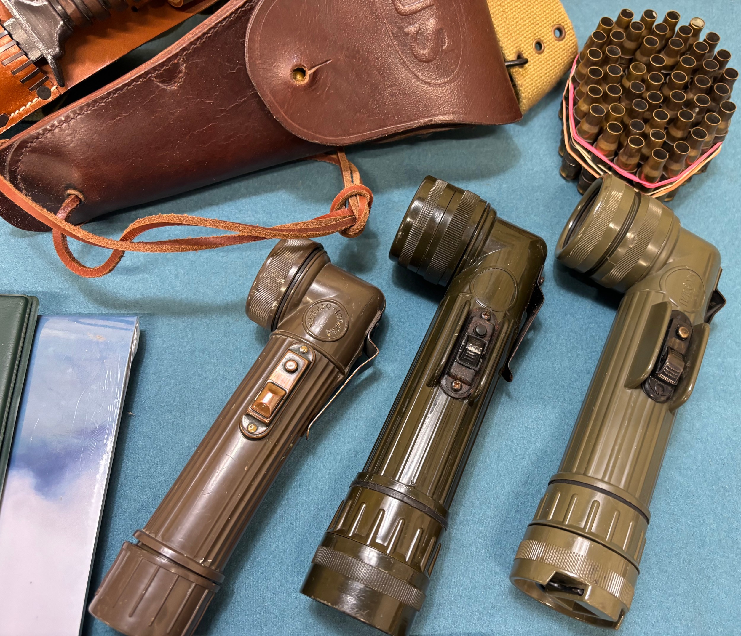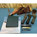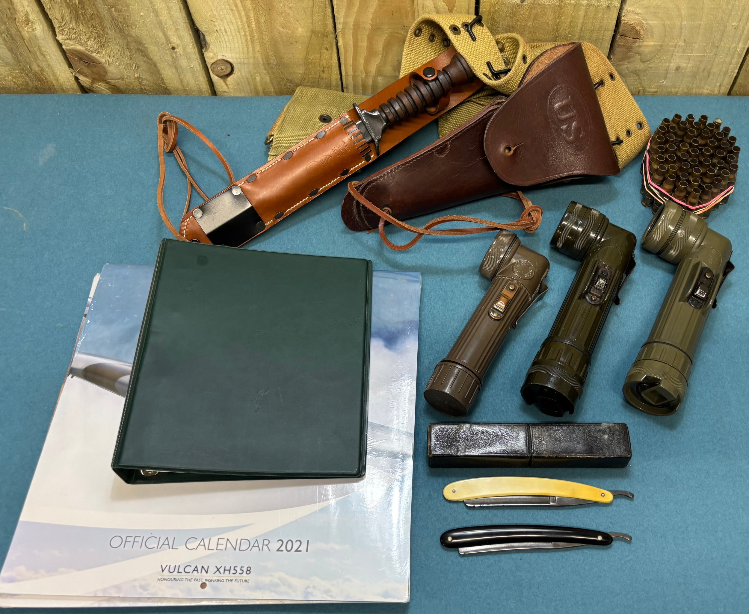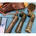 A Collection of military collectables; British Army Falklands era round belt, 19th century Morroco leather open razor case containing two cut throat razors, Three military torches, Military belt, holster and knife holder containing fake knife