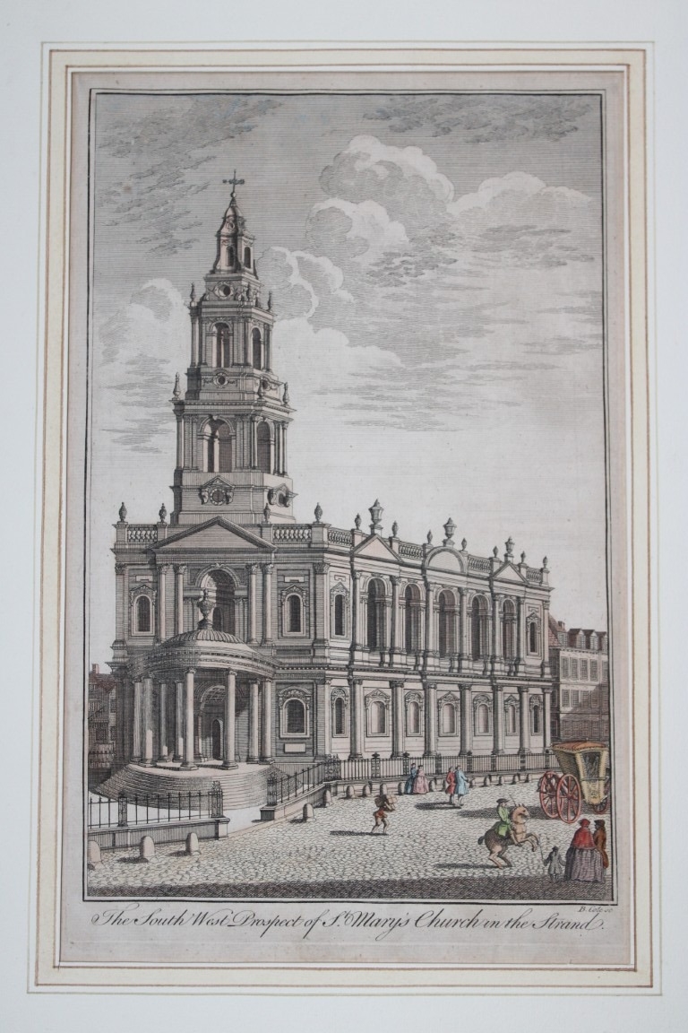 B Cole - South West Prospect of St Mary's Church in the Strand 1756.. This hand coloured engraving of The South West Prospect of St Mary's Church in the Strand is by Benjamin Cole. Published by T Osbourne & J Shipton, London 1756.