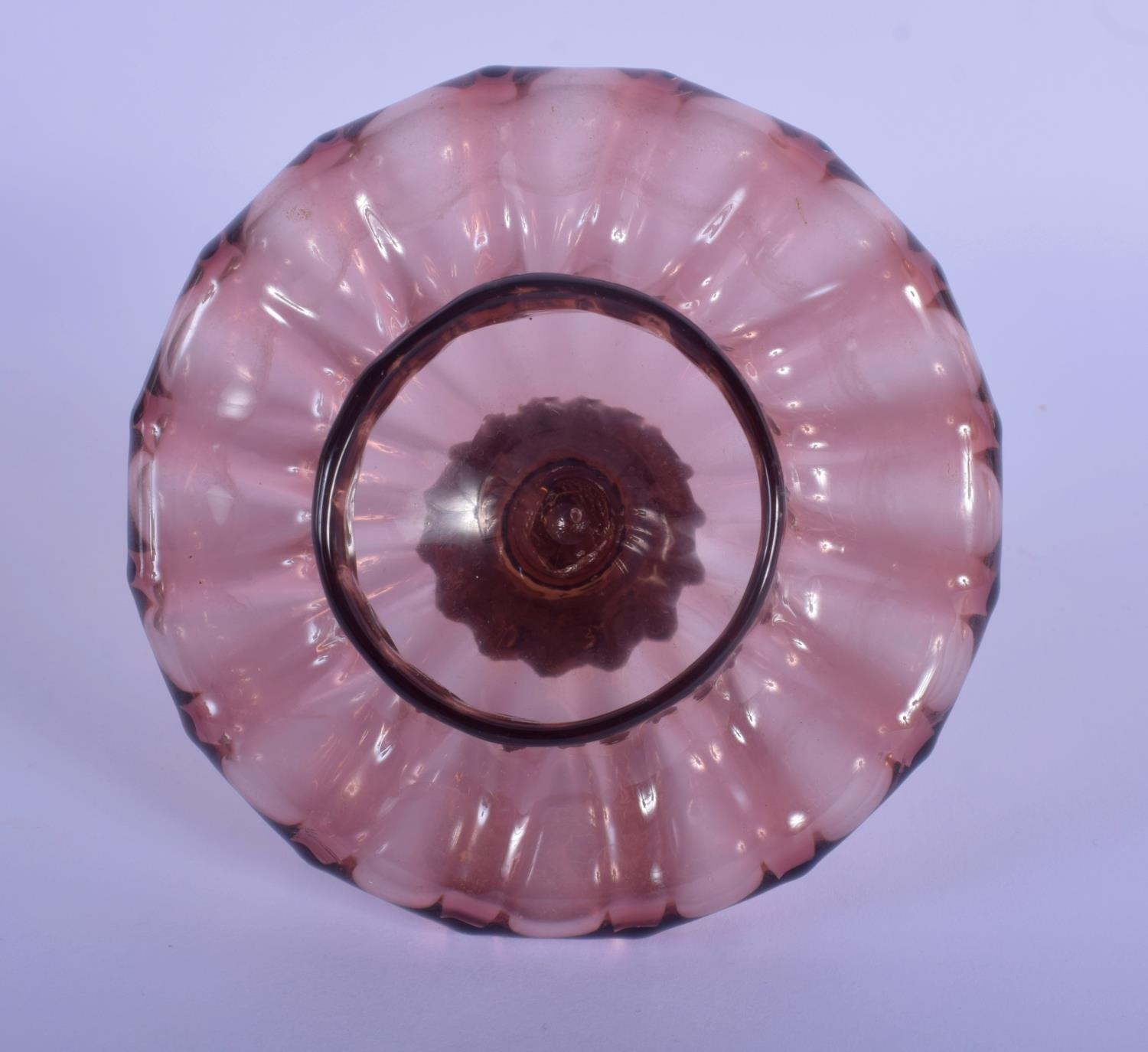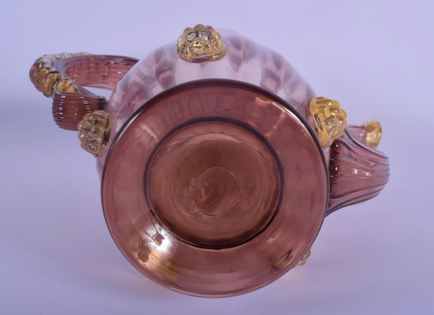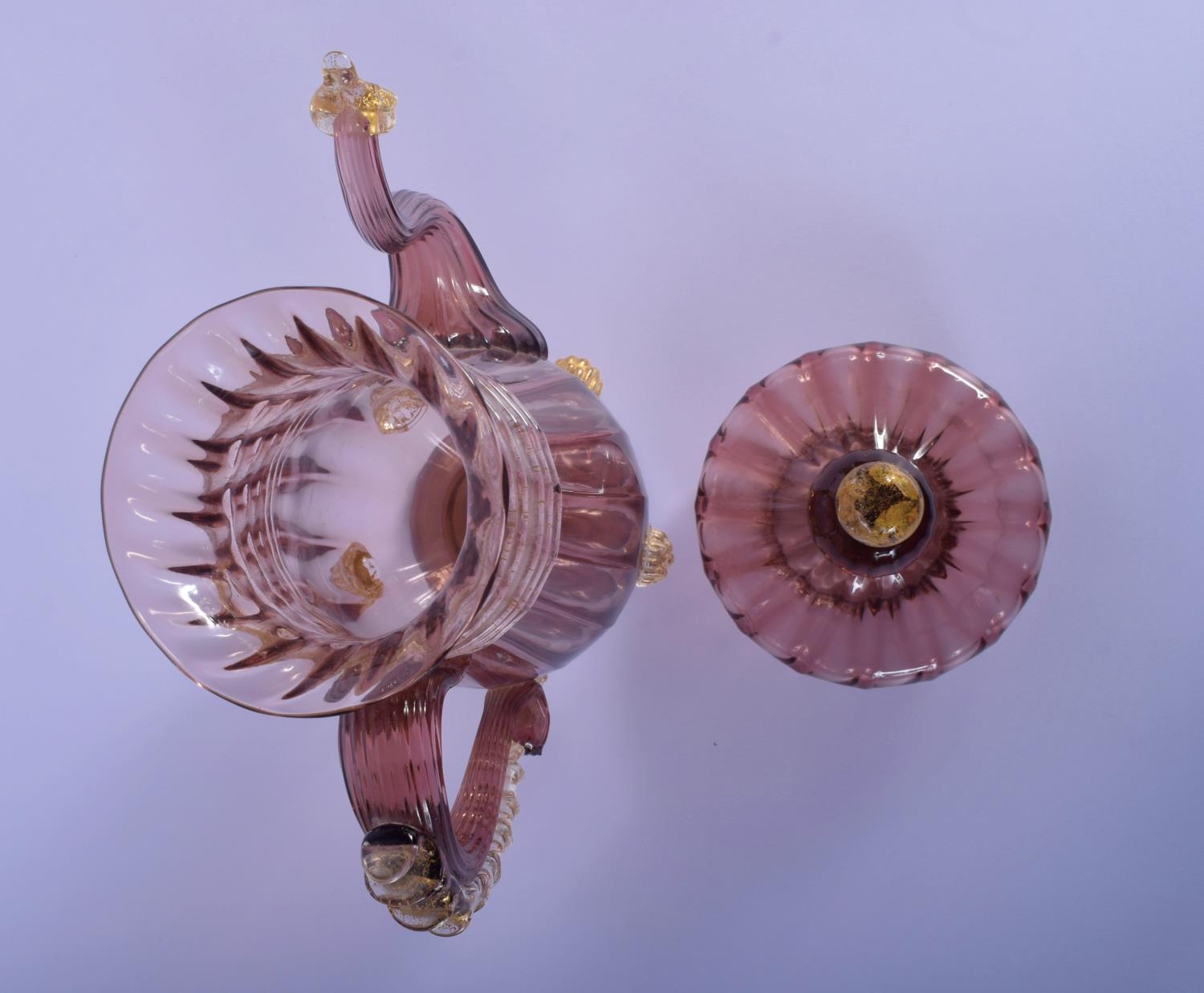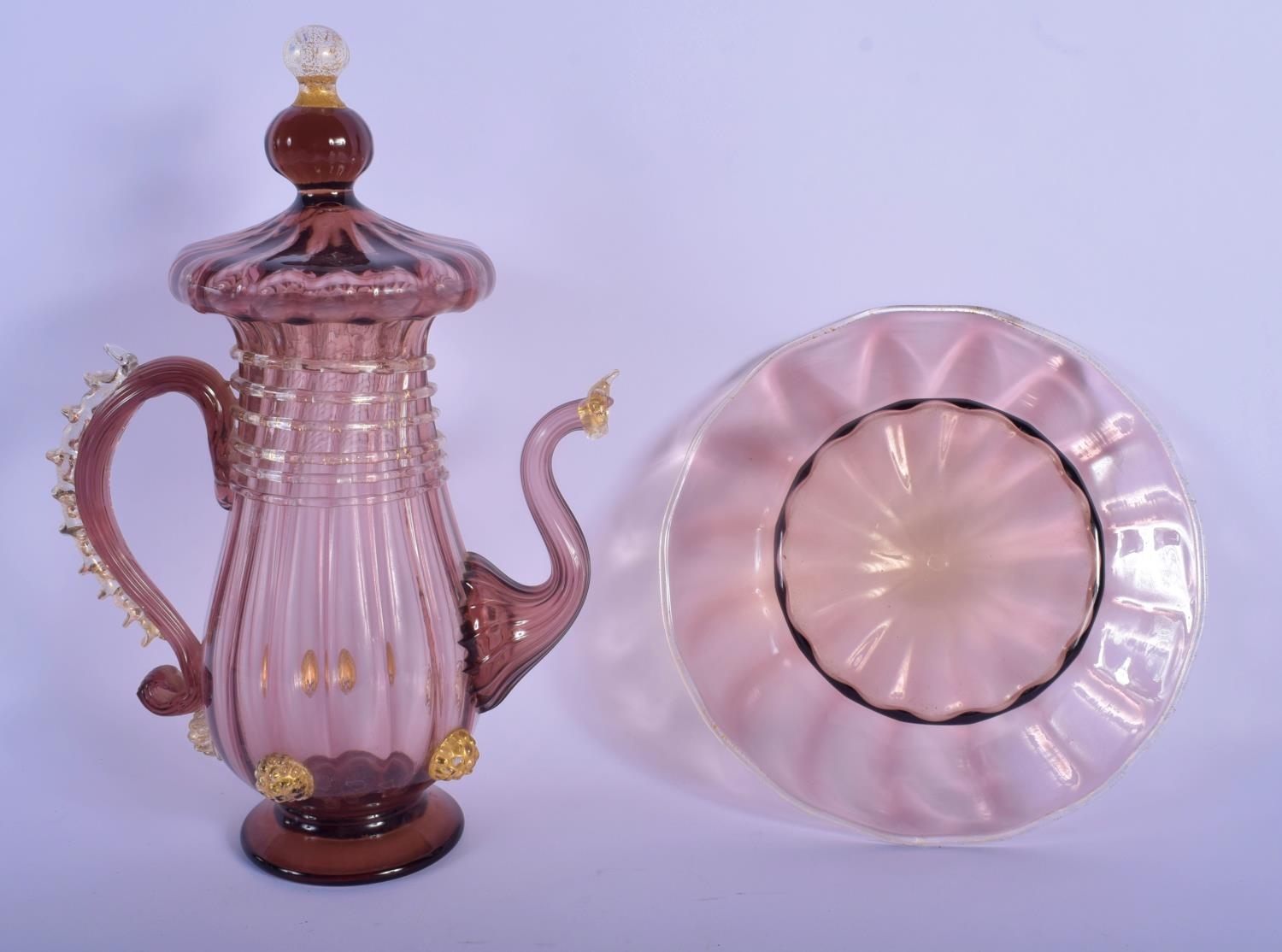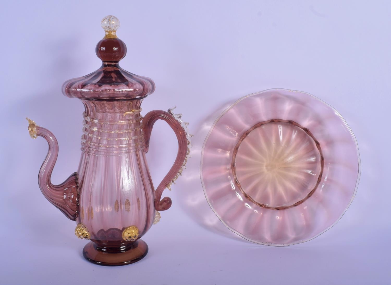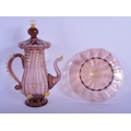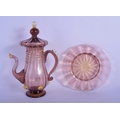 AN EARLY 20TH CENTRY ITALIAN VENETIAN AUBERGINE GLASS EWER AND COVER upon a matching stand. 28 cm x 13 cm.