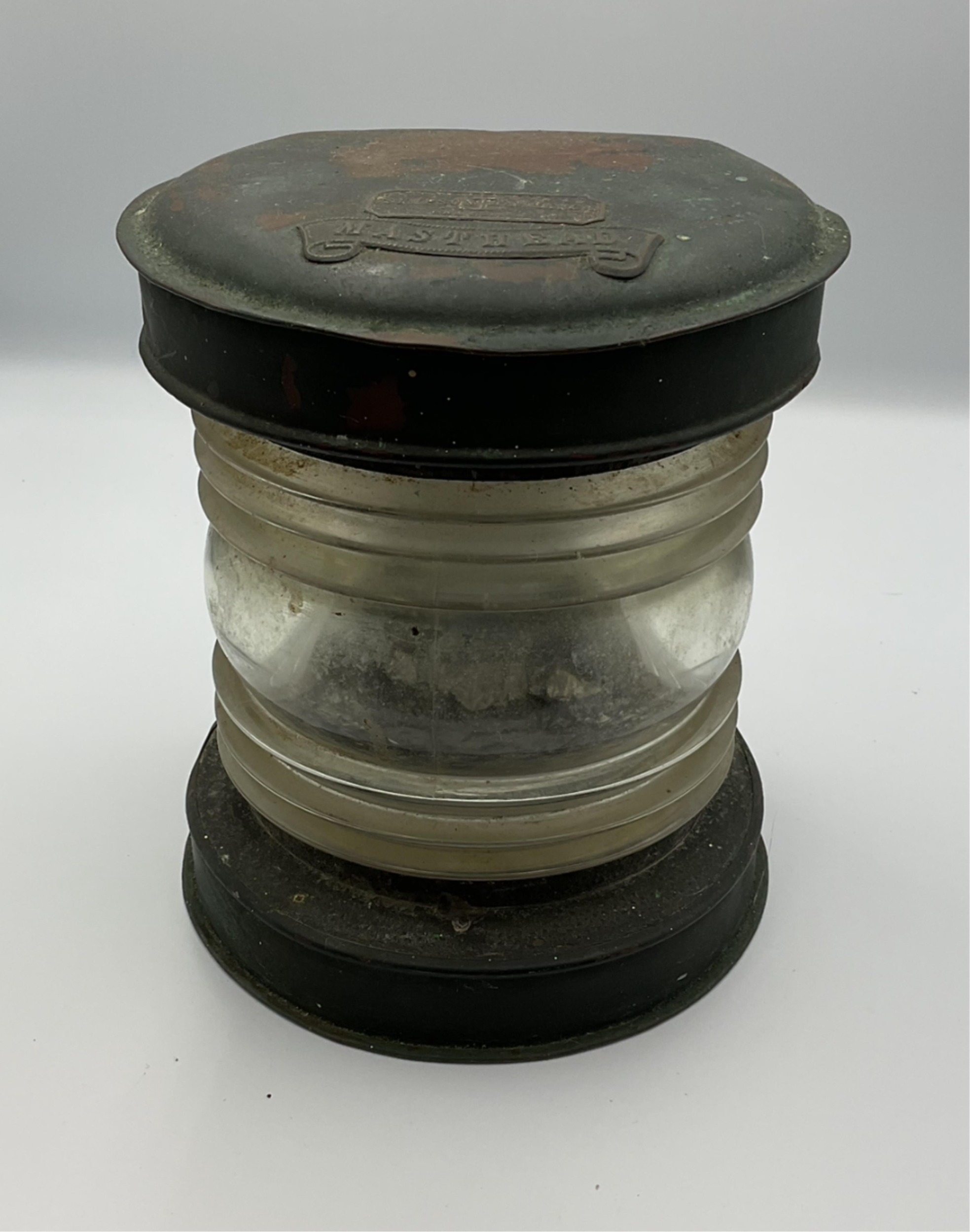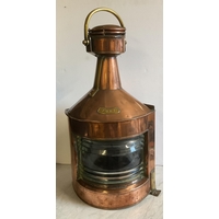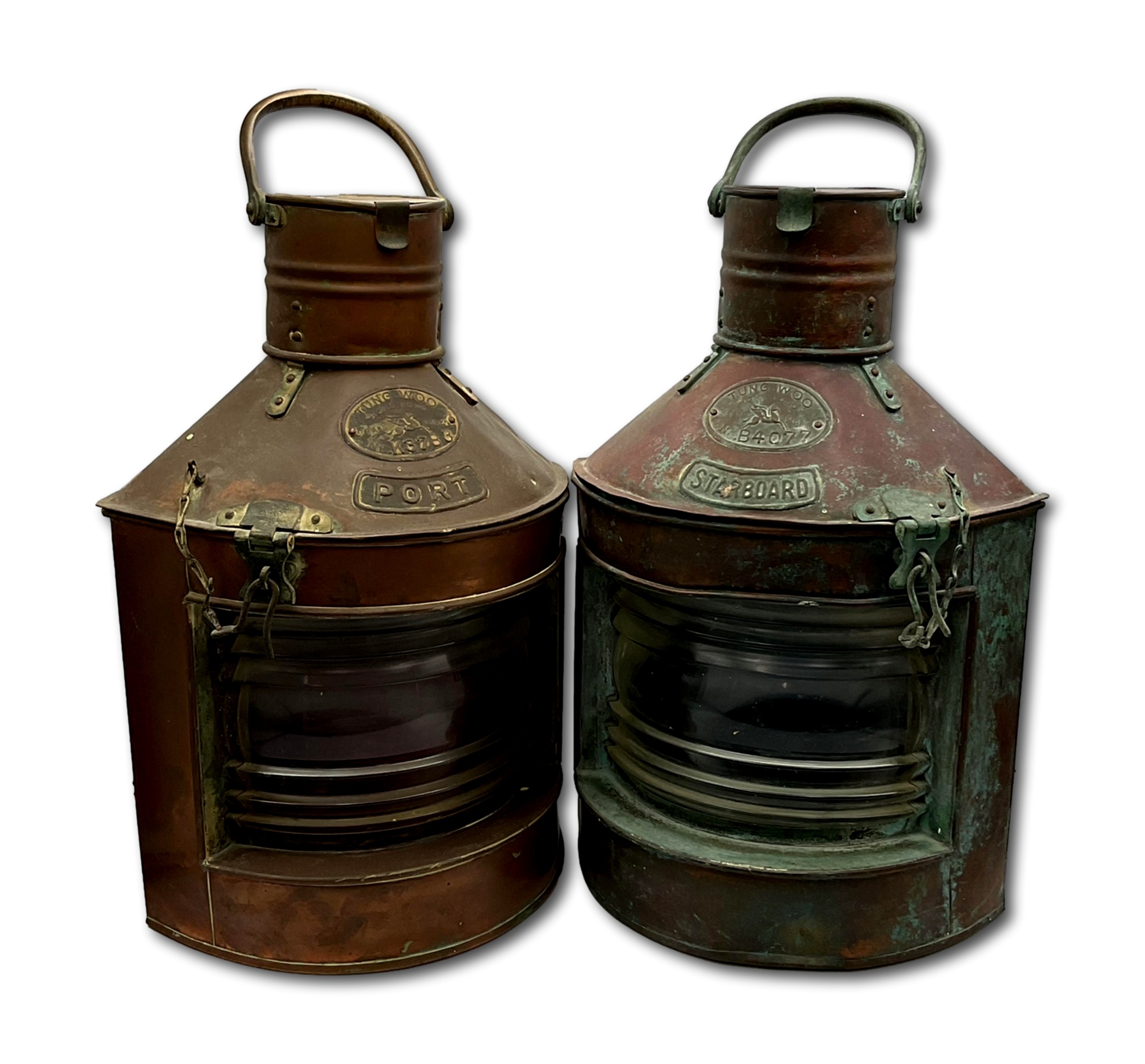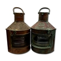 A pair of early 20th century Tung Woo (Hong Kong) copper and brass port and starboard lamps, numbered B4077 & K3783, 39cm. high without handle, together with a Masthead lamp by Simpson Lawrence. (3)