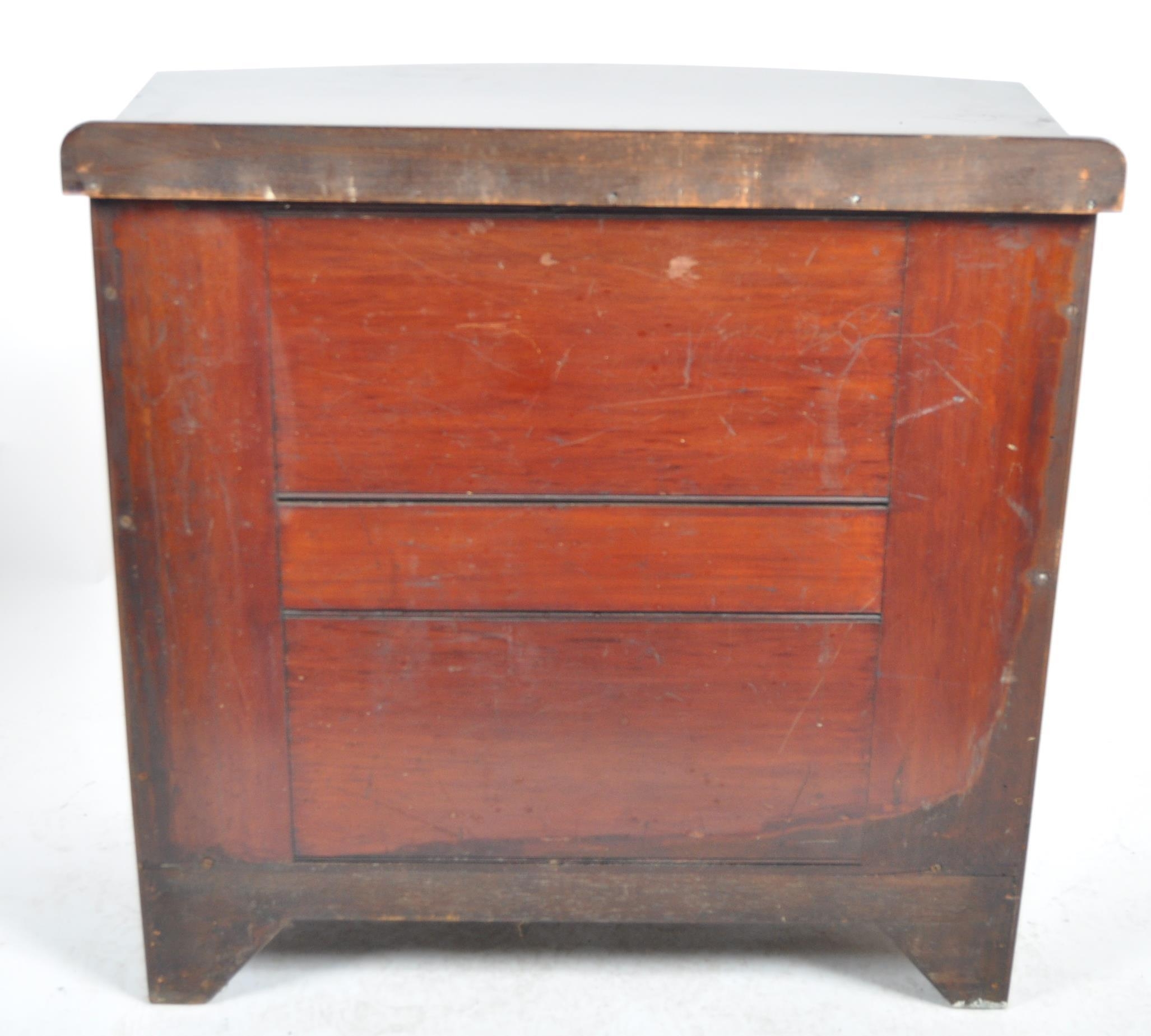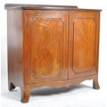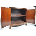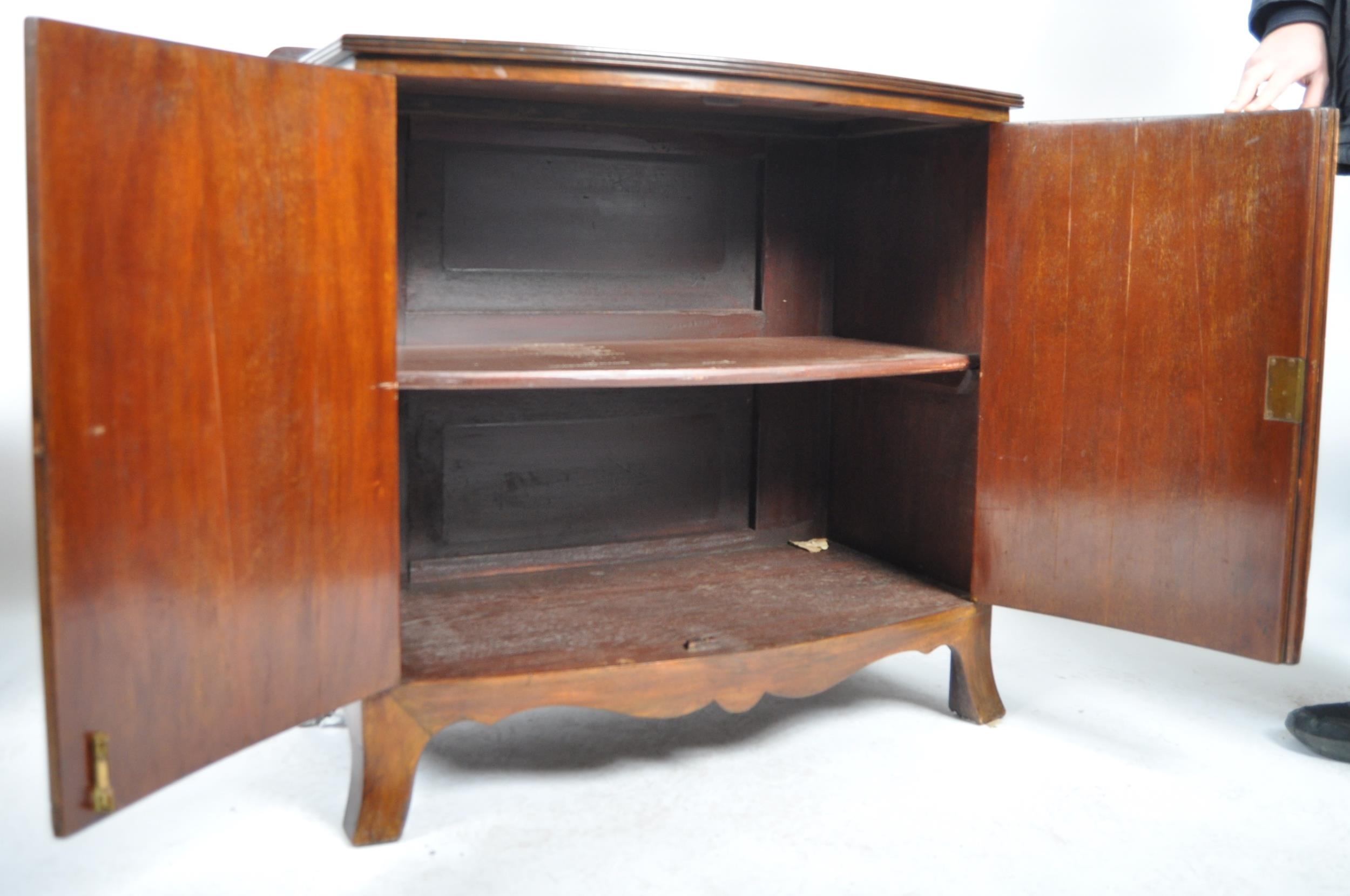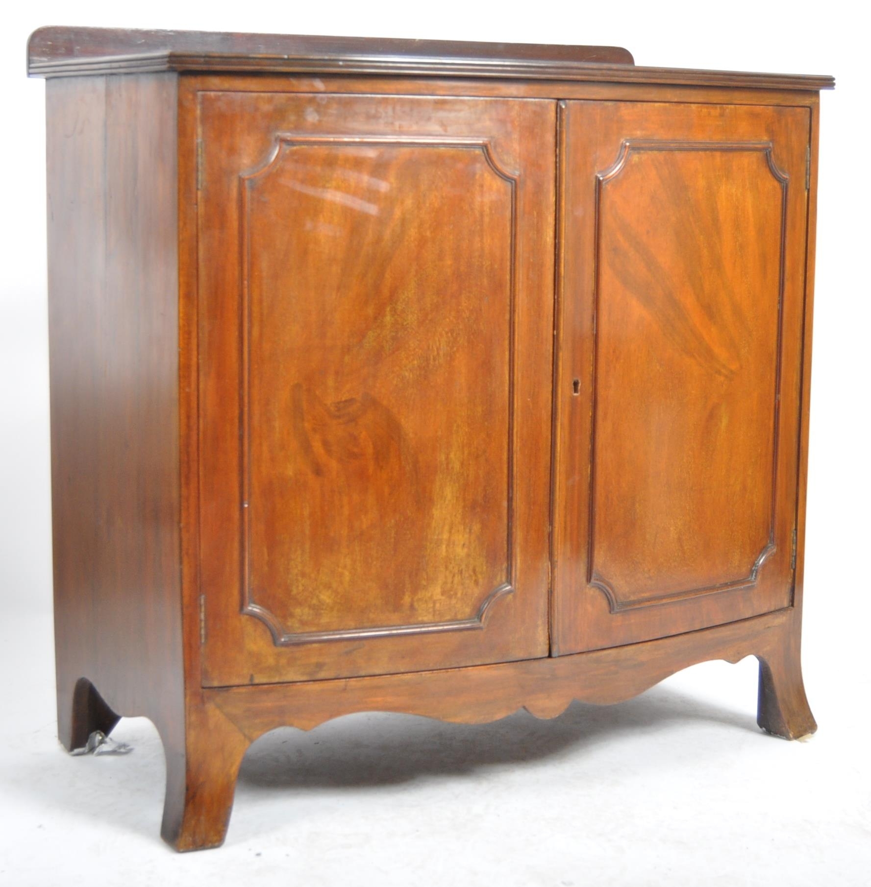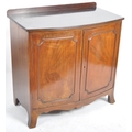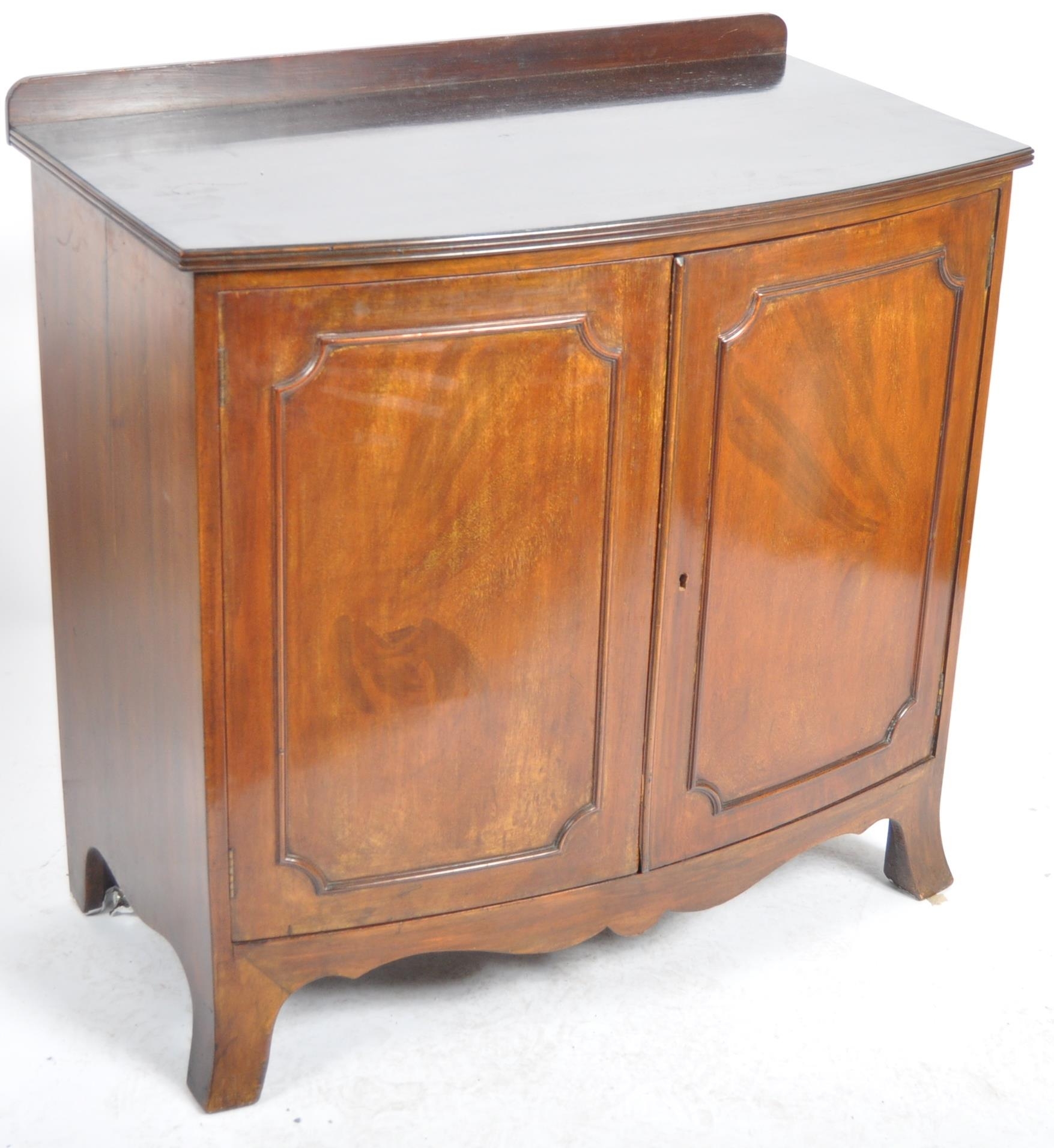 An Edwardian mahogany bow fronted sideboard cabinet. Raised on bracket feet with a bow fronted body having twin fielded panel doors housing shelf within. Reeded edge caddy top above.