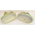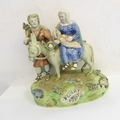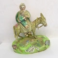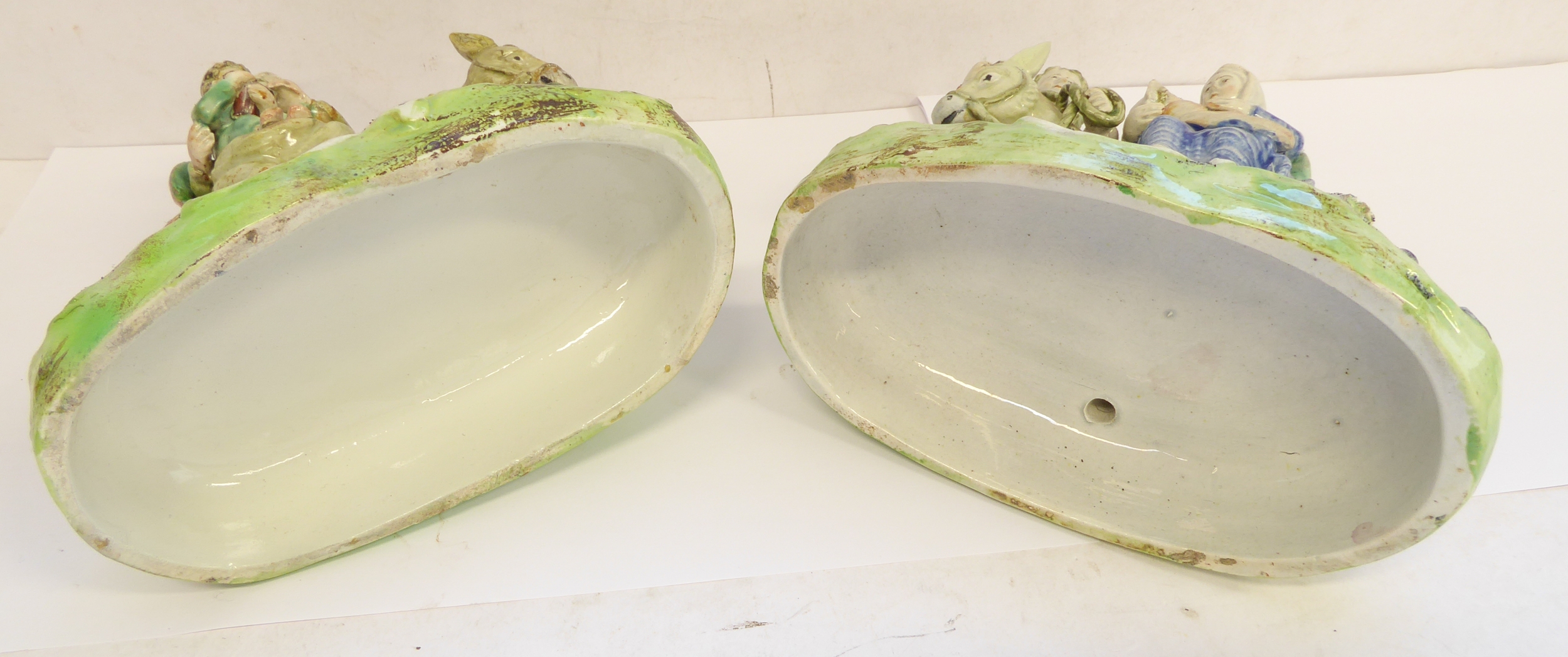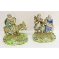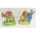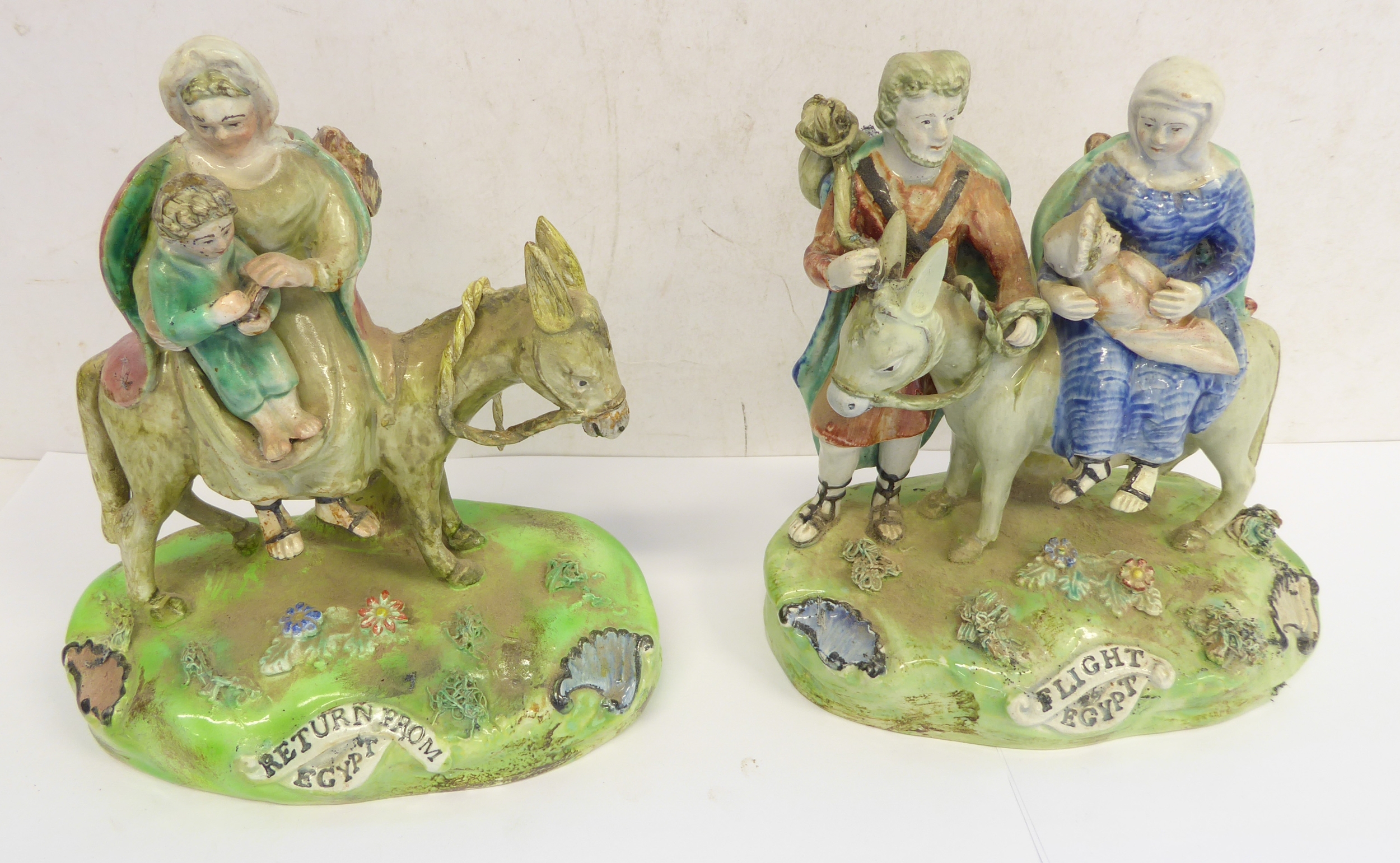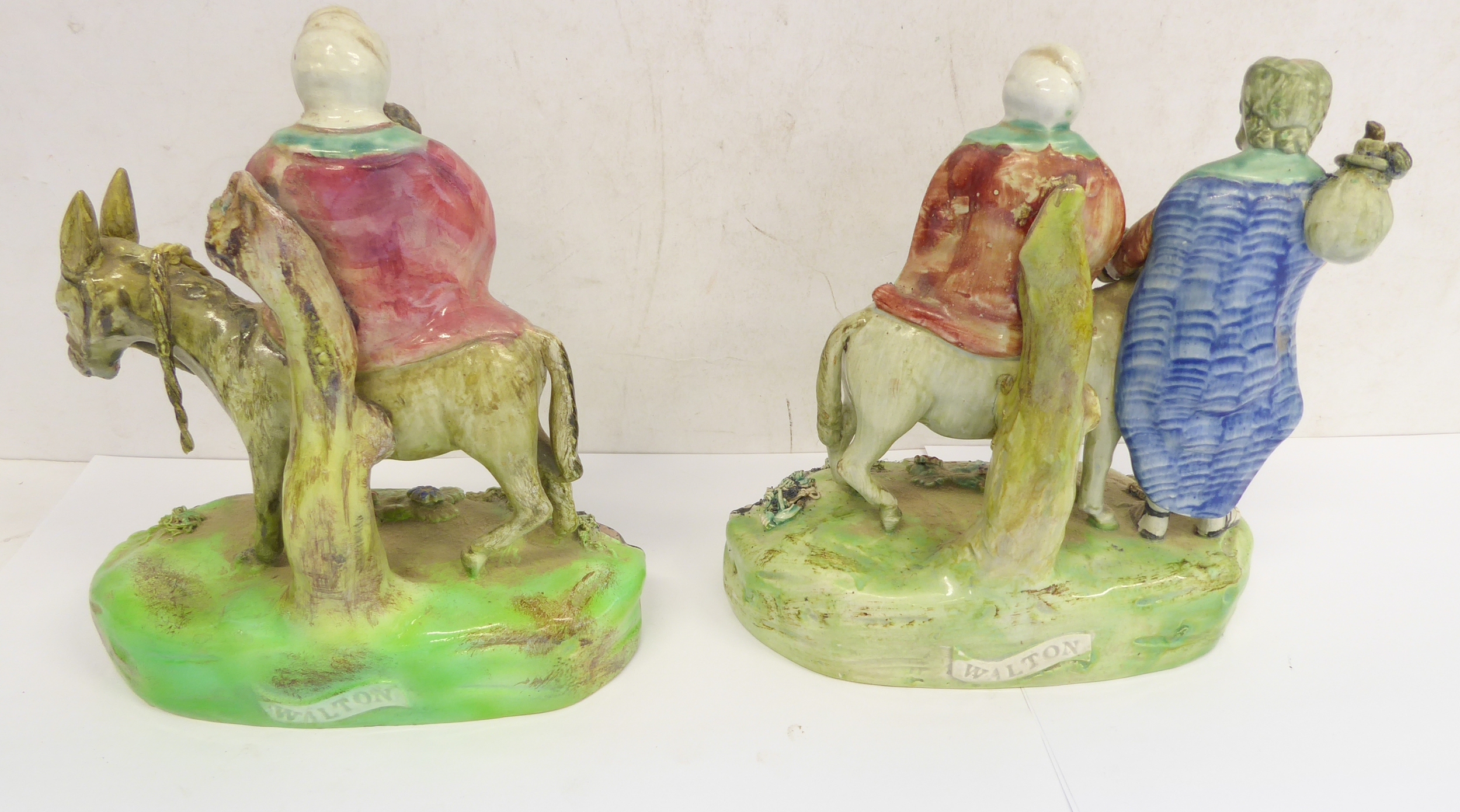 A pair of early 19th century Walton Staffordshire lead glazed earthenware religious figures, "Flight to Egypt" and "Return from Egypt". Both figures signed "WALTON" (verso) and titled (centre front). The figures of Joseph, Mary and Jesus decorated with blue, red and green enamels and the oval bases decorated with applied flowers and moss ware, c1820, (A/F - restored Mary's cape (on return), donkey's reigns, etc.), (2).