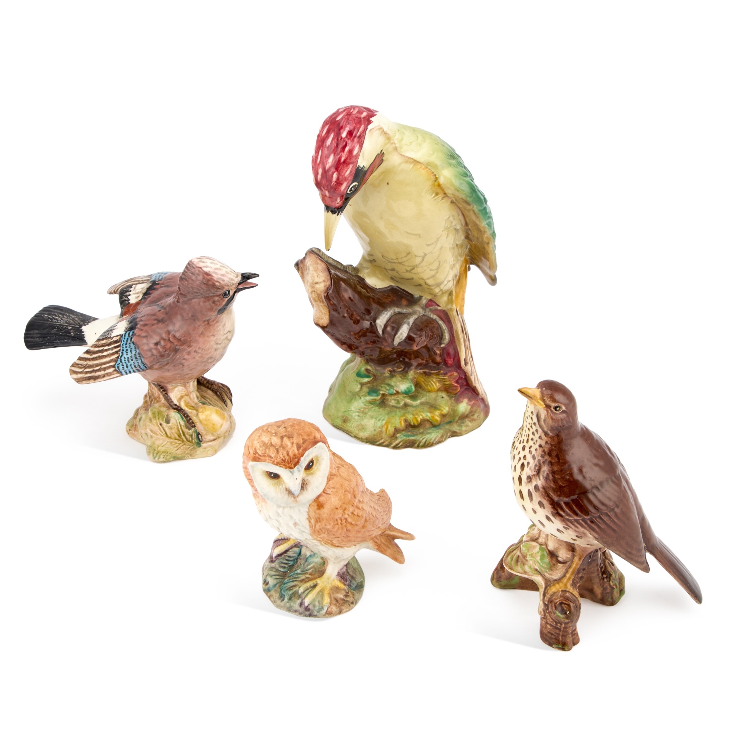 comprising a Woodpecker, 1218; Jay, 2417; Thrush, 2308; and Owl. (4) Tallest 21.5cm high