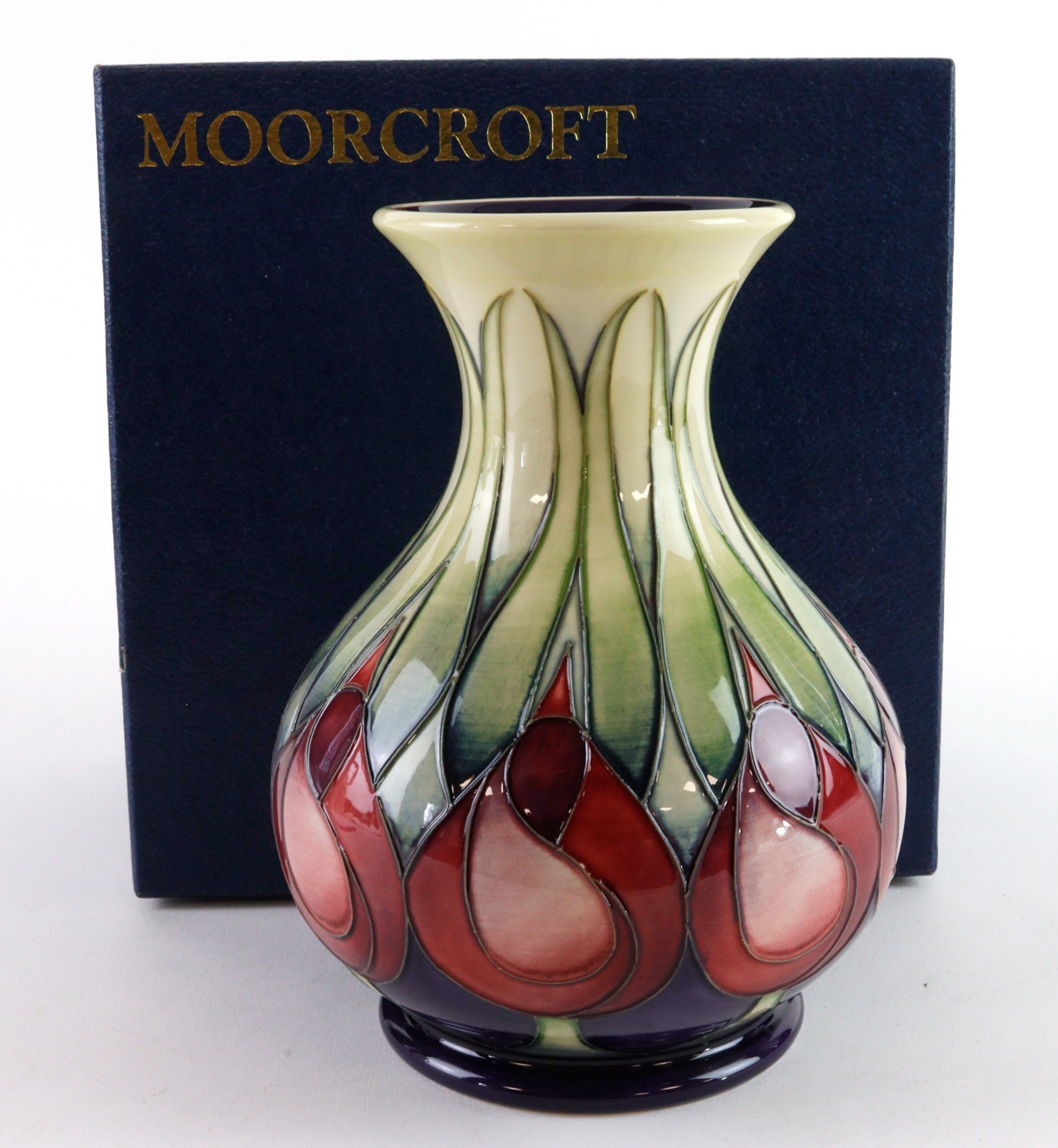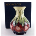 Moorcroft 'April Tulips' pattern vase, dated 2002, makers marks to base, height 15.5cm approx., contained in a Moorcroft box