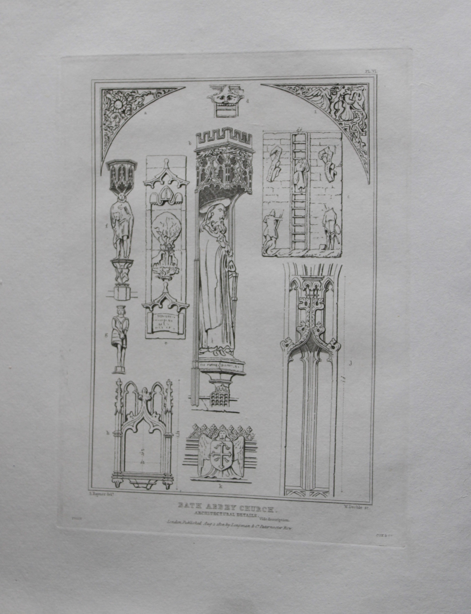 W Deeble - Bath Abbey Church details engraved by S Rayner 1824. Original engraving of Architectural Details in Bath Abbey Church by S Rayner after W Deeble. Published by Longman & co, London 1824.