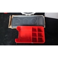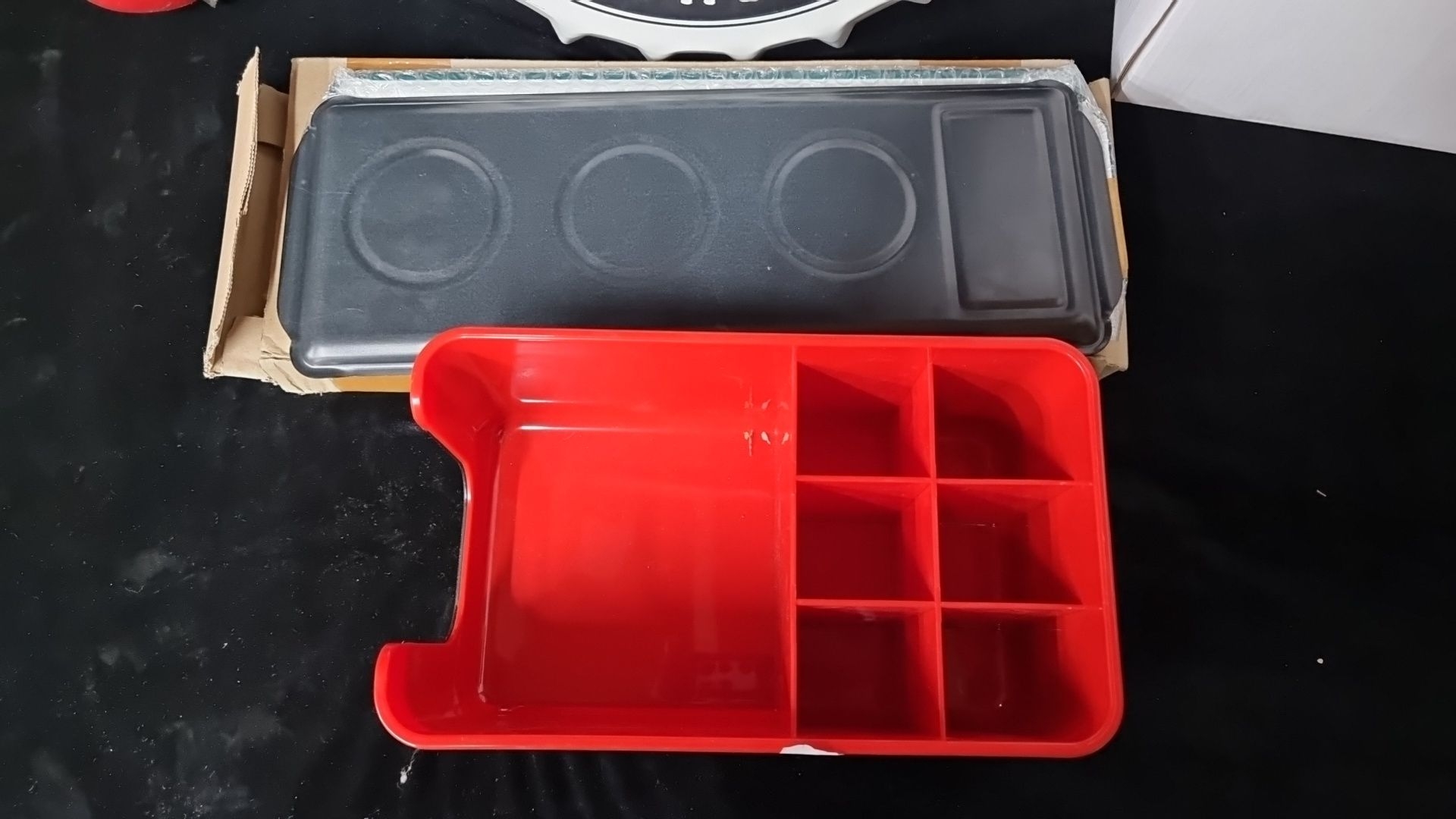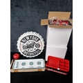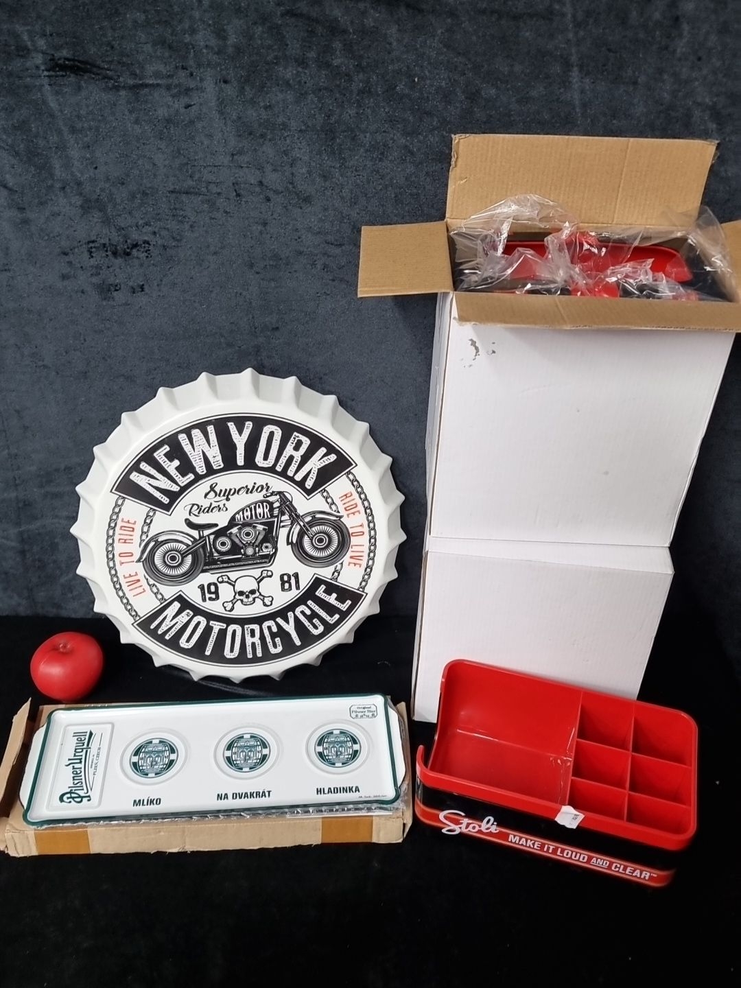 A mixed lot including a "New York Motorcycle" wall sign in the form of a bottle cap, a Pilsner Urquell beer tray, and five red Stoli merchandise organizers.