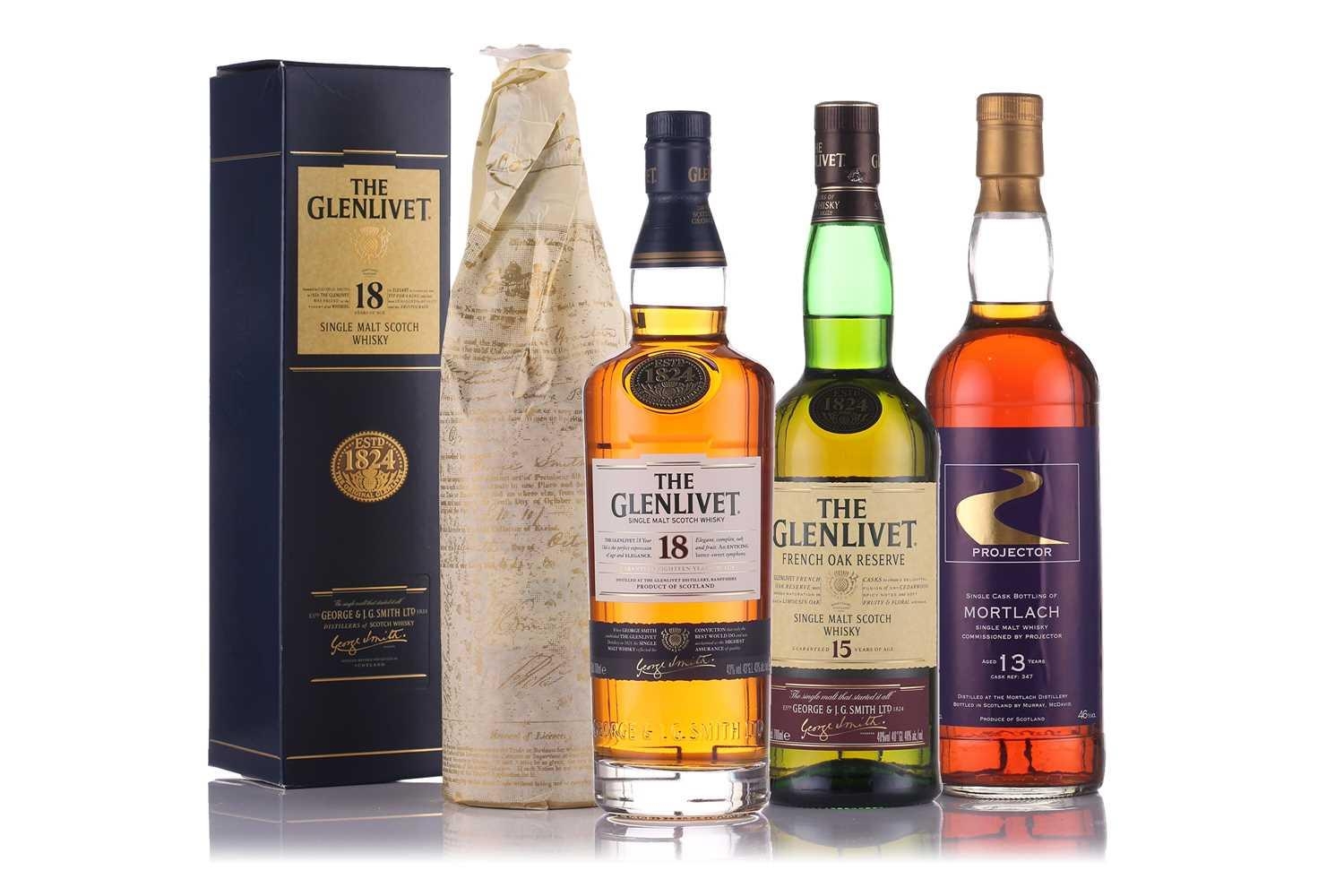 A bottle of Glenlivet Single Malt Scotch Whisky, 18 Years, 70cl, 43% Vol, together with another similar, a Glenlivet French Oak Reserve Single Malt Scotch Whisky, 15 Years, 70cl, 40% Vol. and a Murray Mc David Mortlach Distillery Speyside Single Malt Scotch Whisky, 1990, 700ml, 46% Vol, all in original cartons.