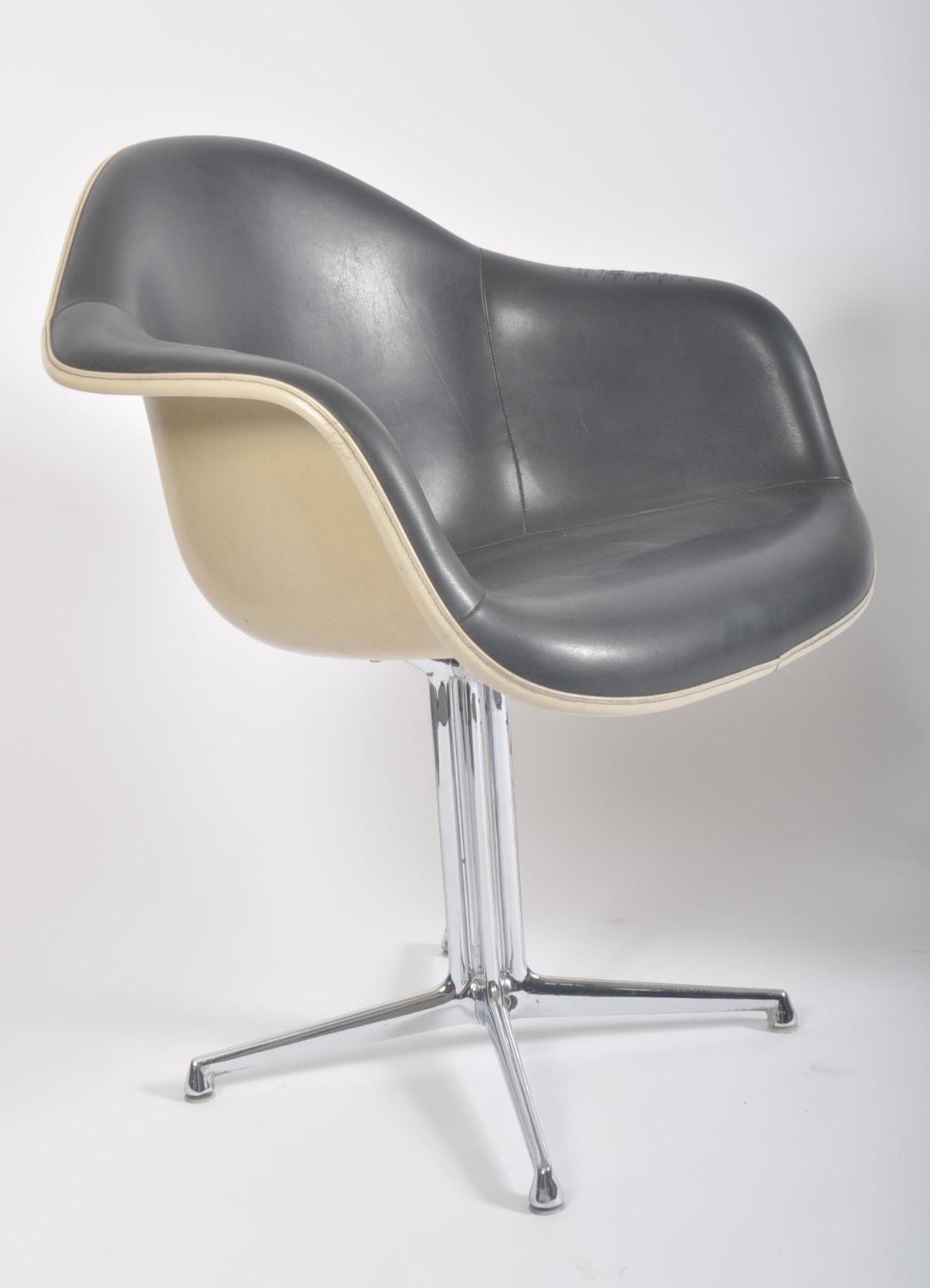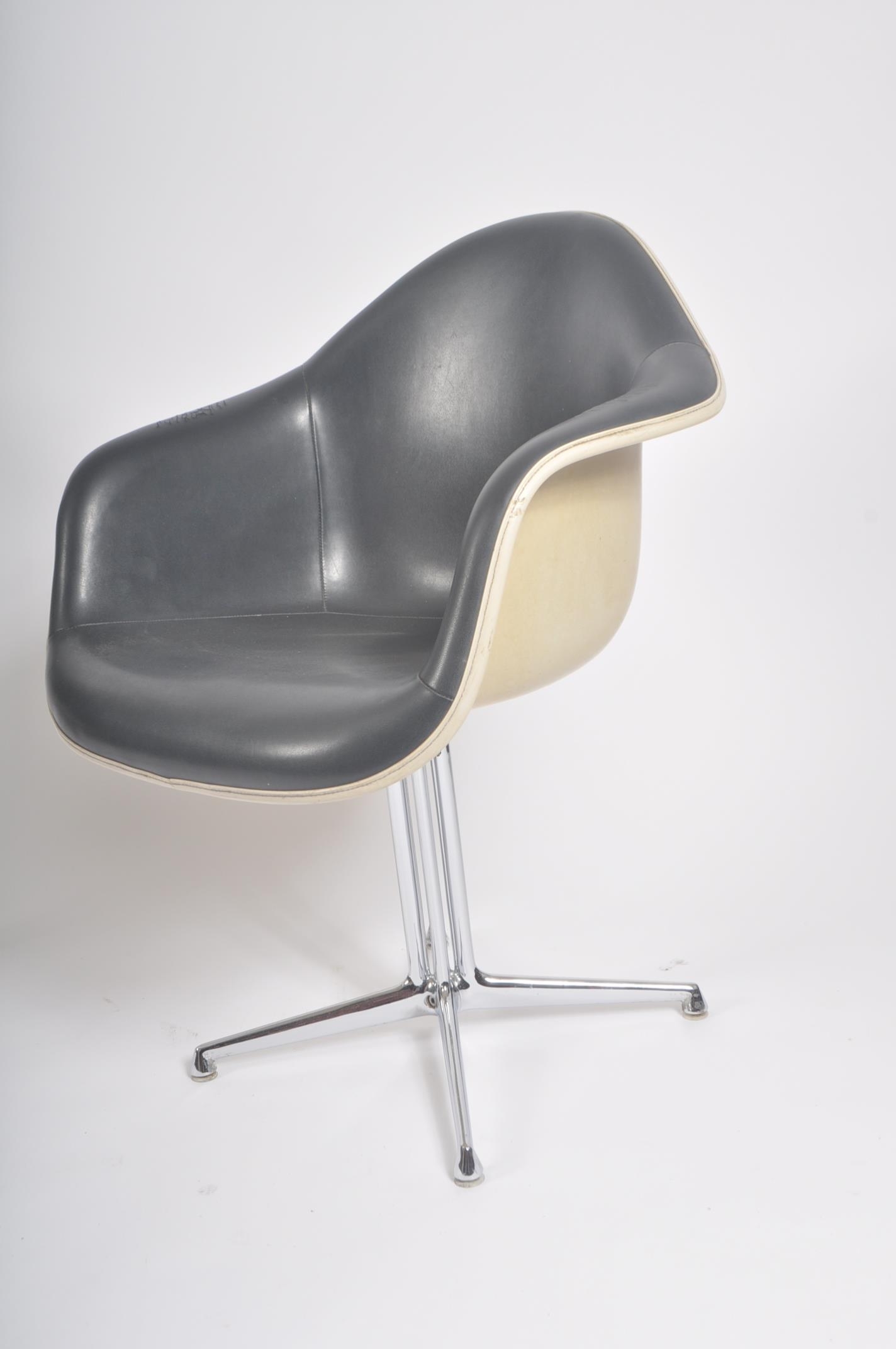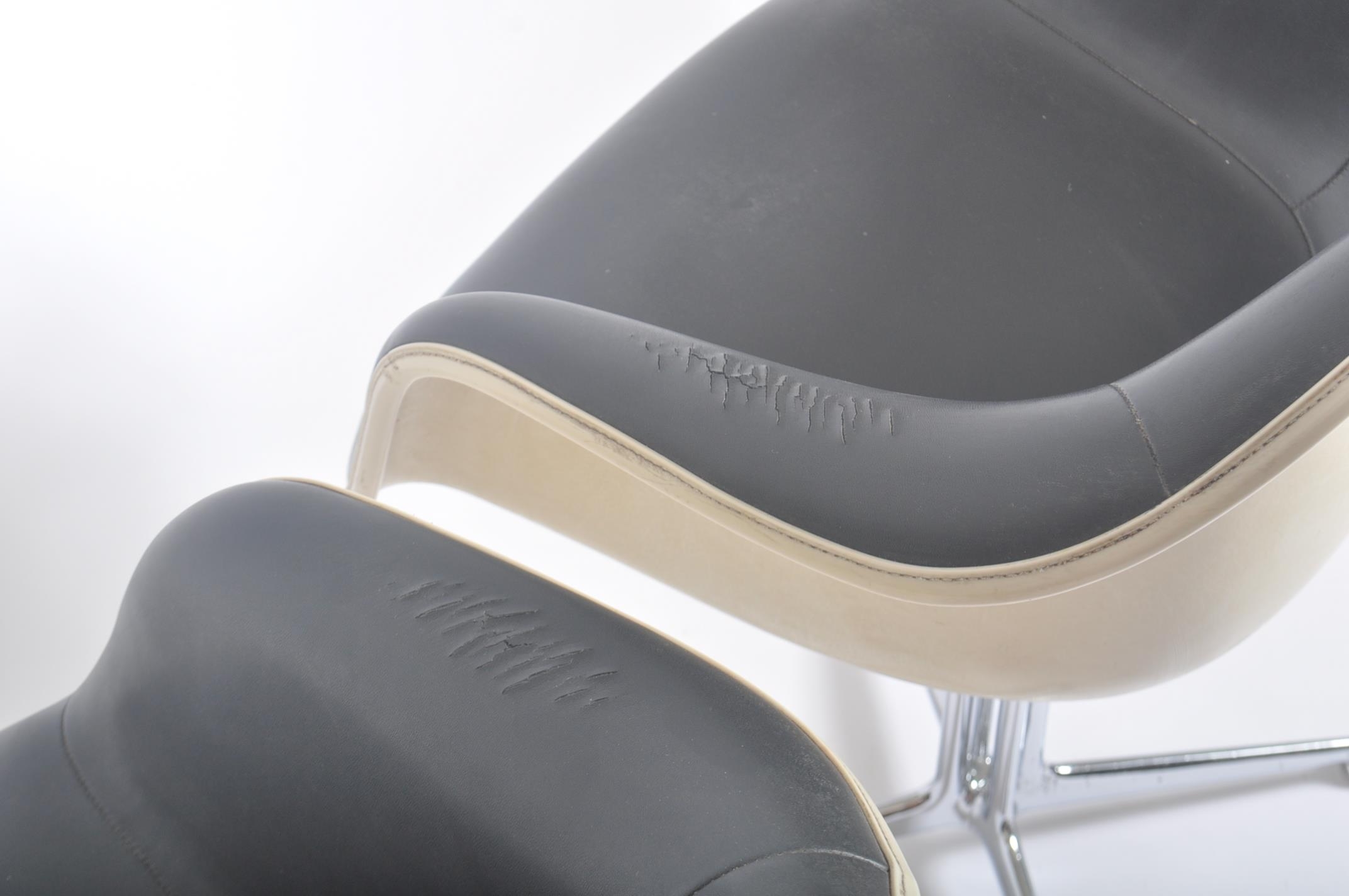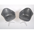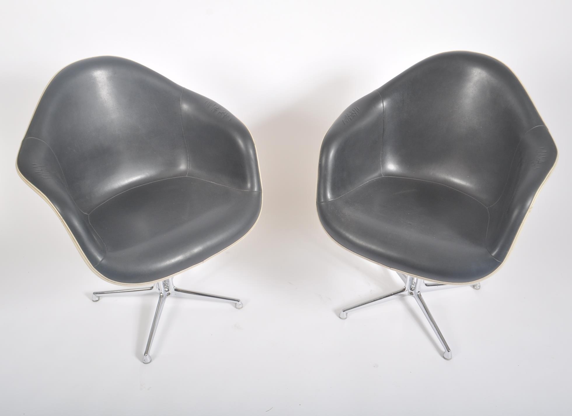 Charles and Ray Eames for Vitra - La Fonda - A matching pair of retro 20th century 1960s fiberglass and black vinyl upholstered designer chairs / armchair. Each chair having formed fiberglass shell with padded seat and backrest. Each raised on polished aluminium bases. Each with manufacturer's labels to the underside. Each measures approx. 83cm x 66cm x 50cm.