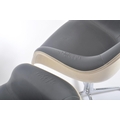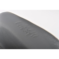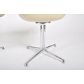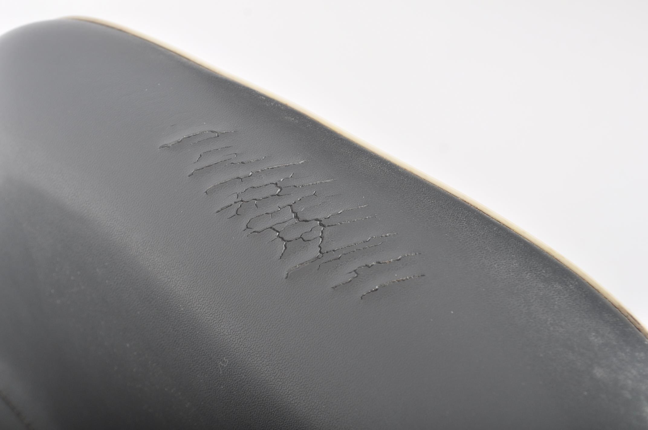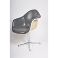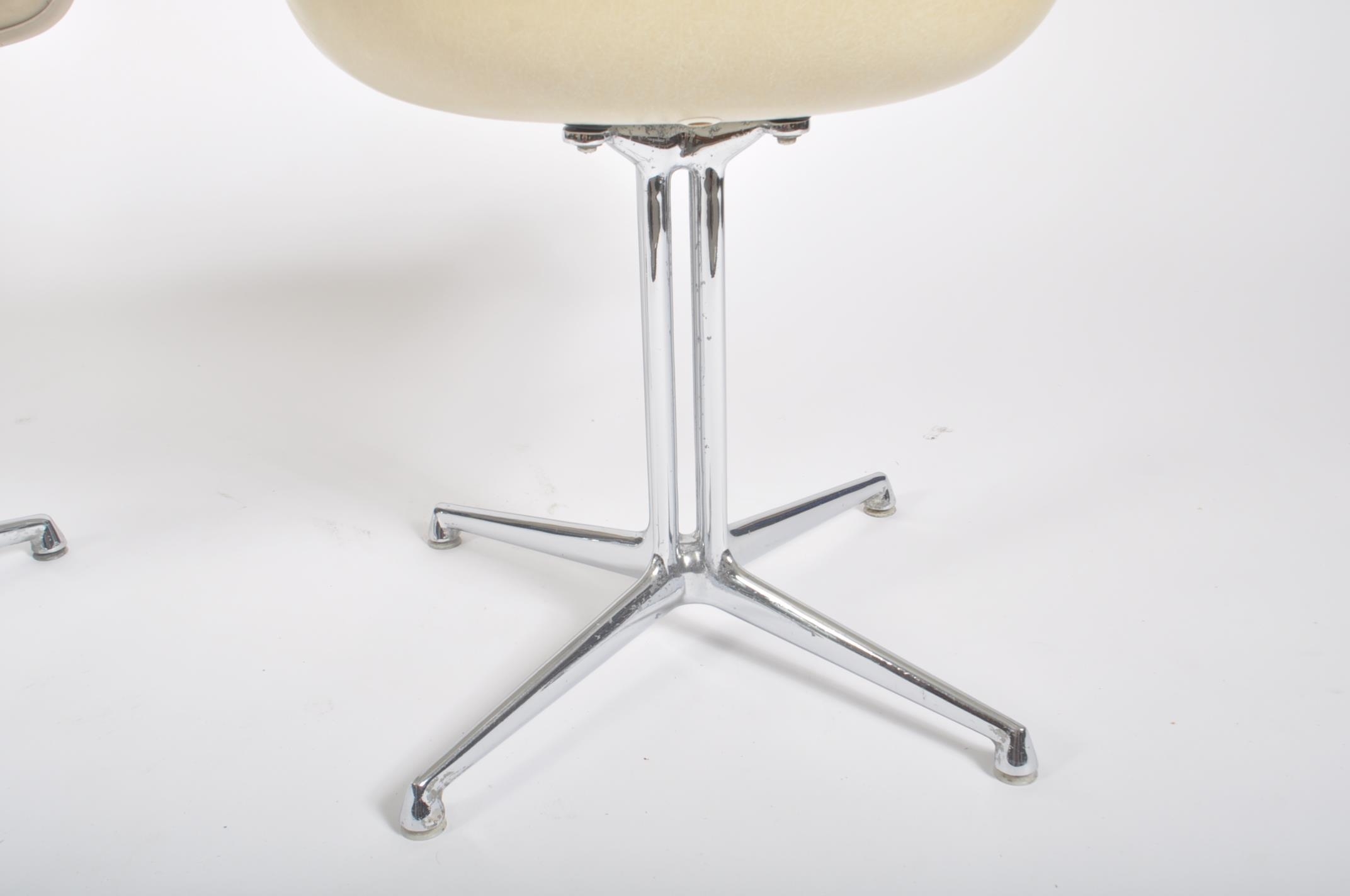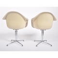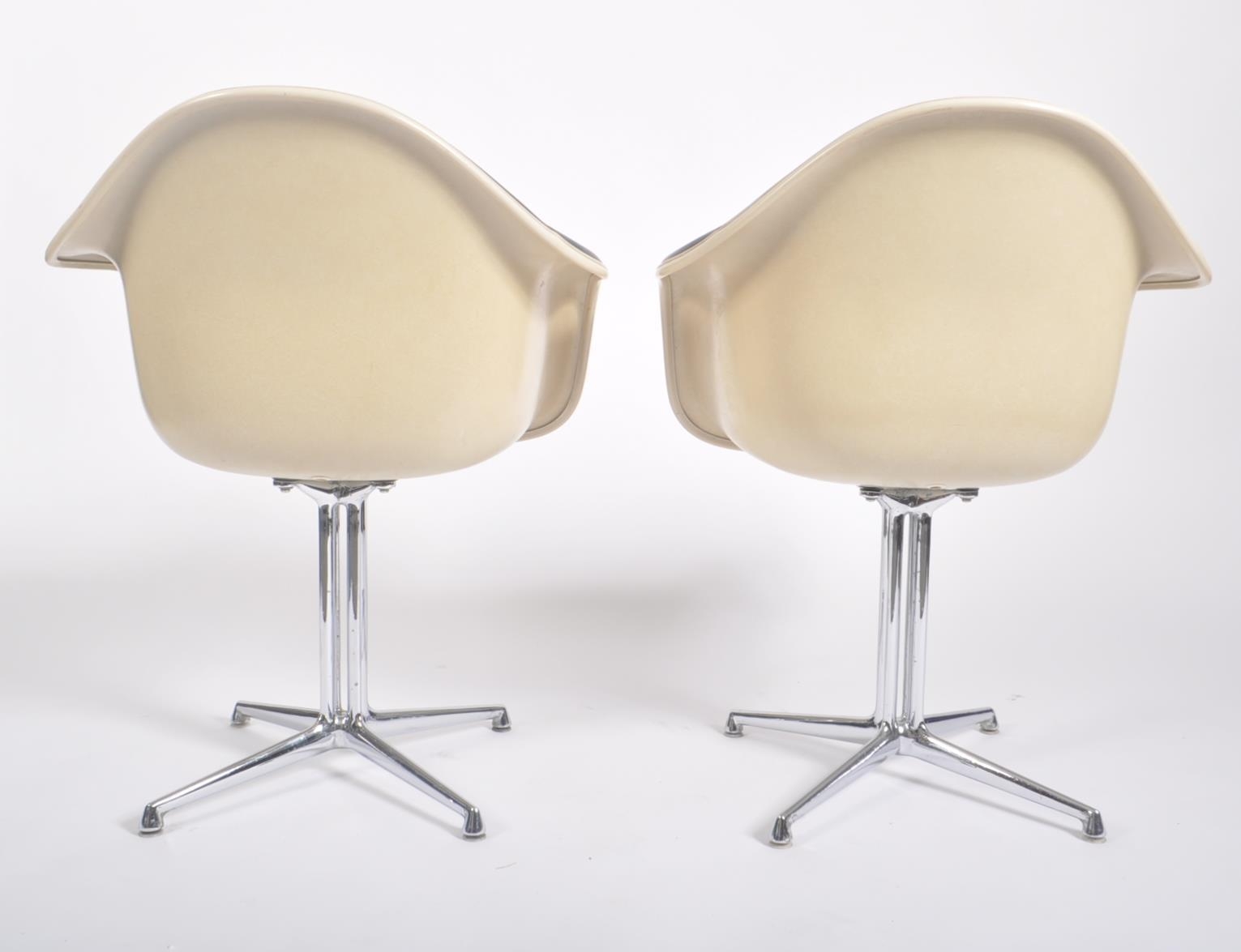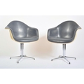 Charles and Ray Eames for Vitra - La Fonda - A matching pair of retro 20th century 1960s fiberglass and black vinyl upholstered designer chairs / armchair. Each chair having formed fiberglass shell with padded seat and backrest. Each raised on polished aluminium bases. Each with manufacturer's labels to the underside. Each measures approx. 83cm x 66cm x 50cm.
