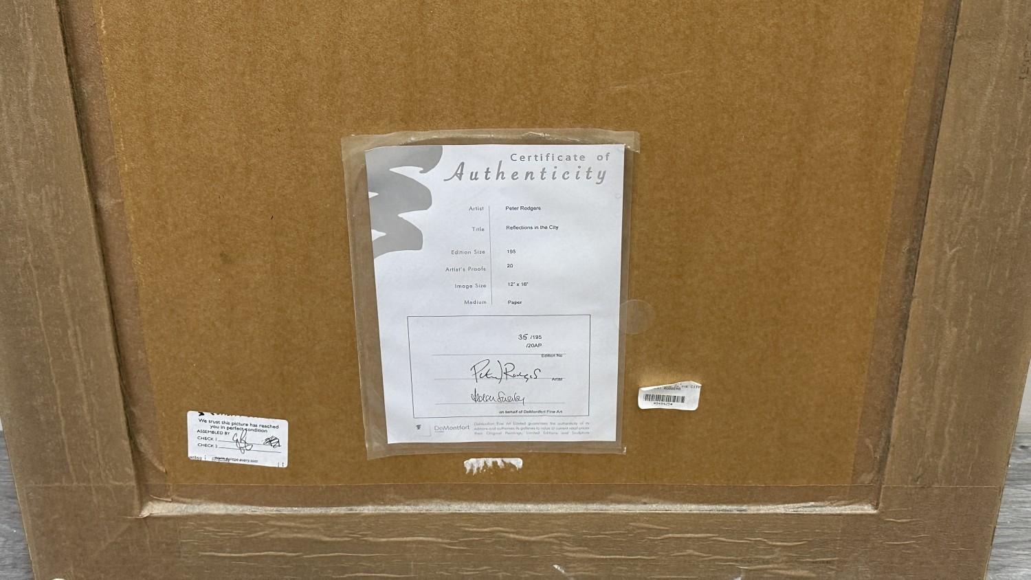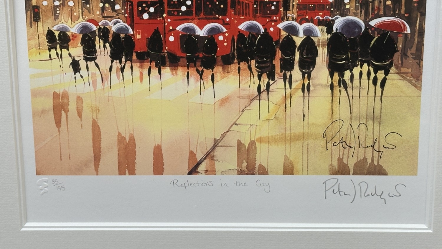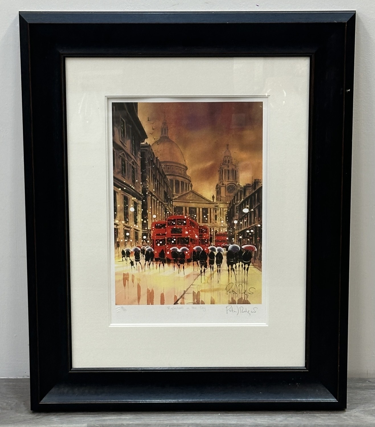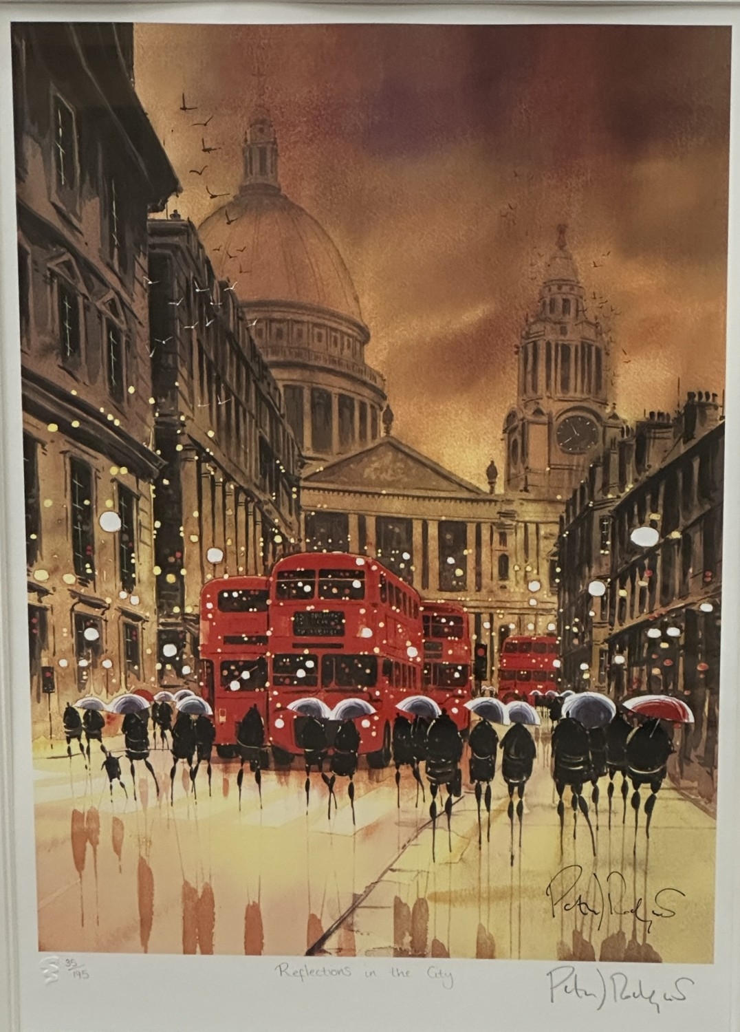 A framed Peter Rodgers 'Reflections in the City' pencil signed limited edition 35/195 print with certificate of authenticity - approx. 80cm high x 63cm wide