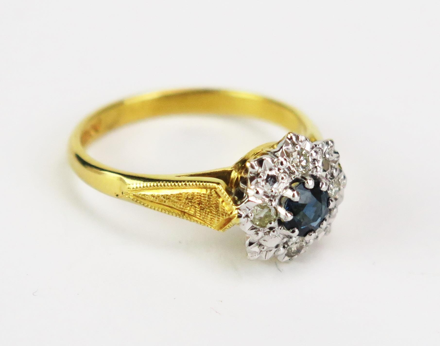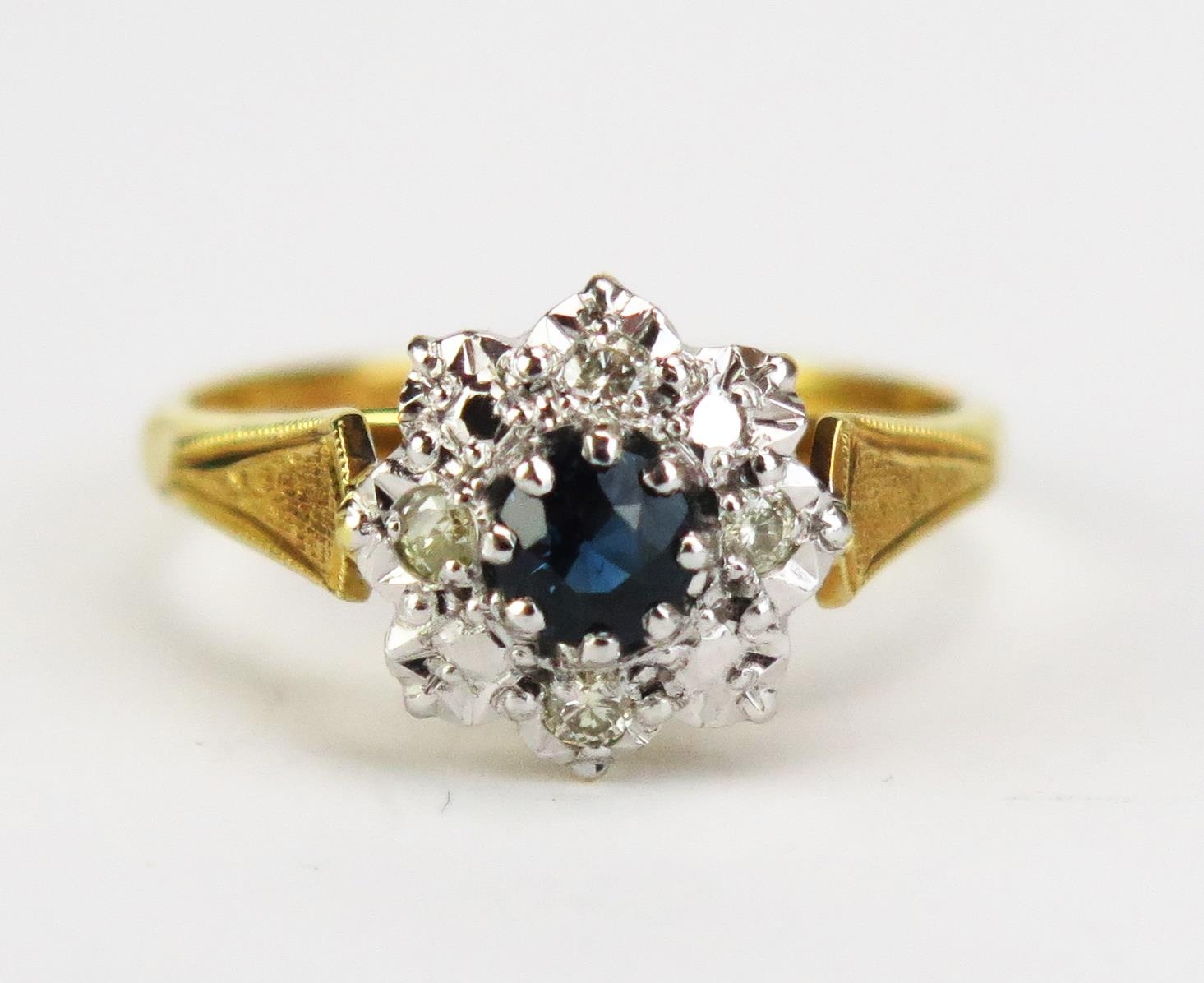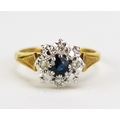 An 8ct Gold, Sapphire and Diamond Cluster Ring, c. 11mm head, hallmarked, size M.5, 3.79g