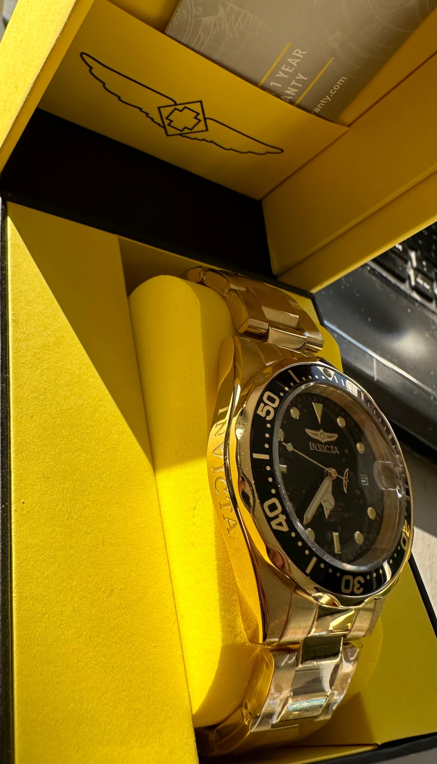 INVICTA mens Professional Diver watch 200m, gold tone stainless steel strap, black face, retail c. $500+ boxed
