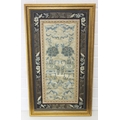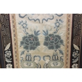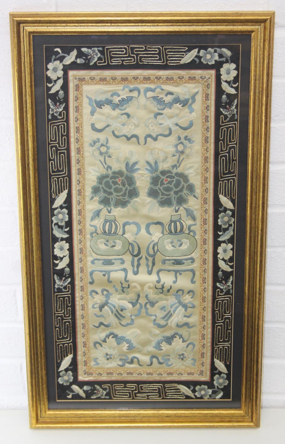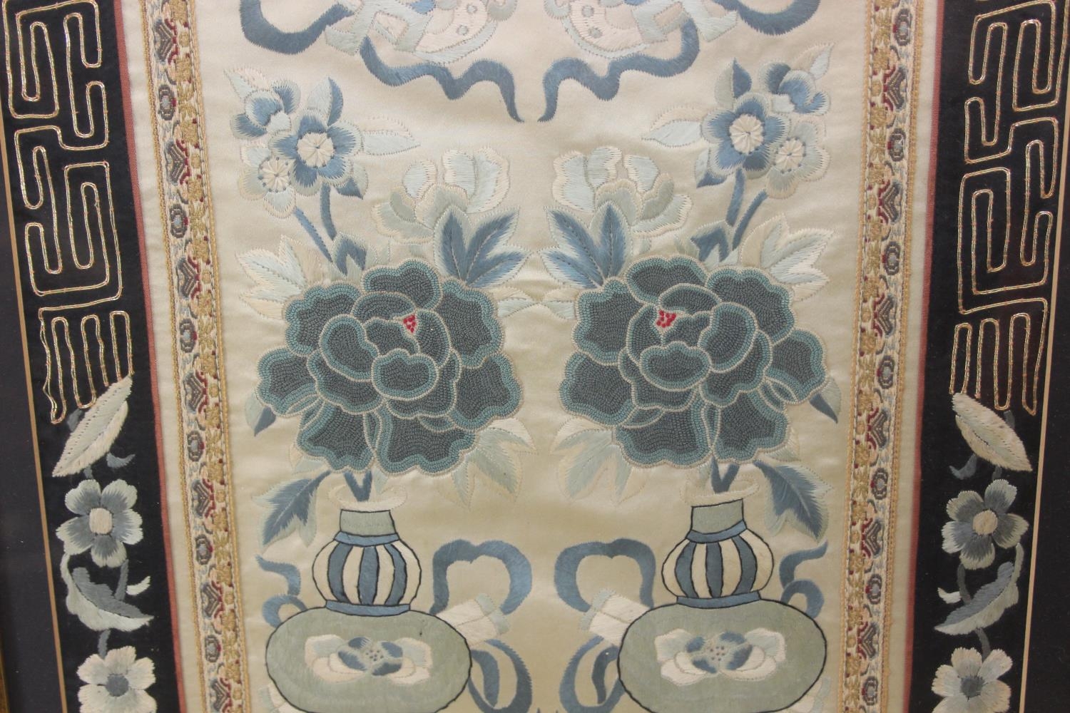 A vintage Chinese silk panel depicting flower filled vases within a decorative floral border, 75cm x 43cm