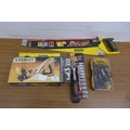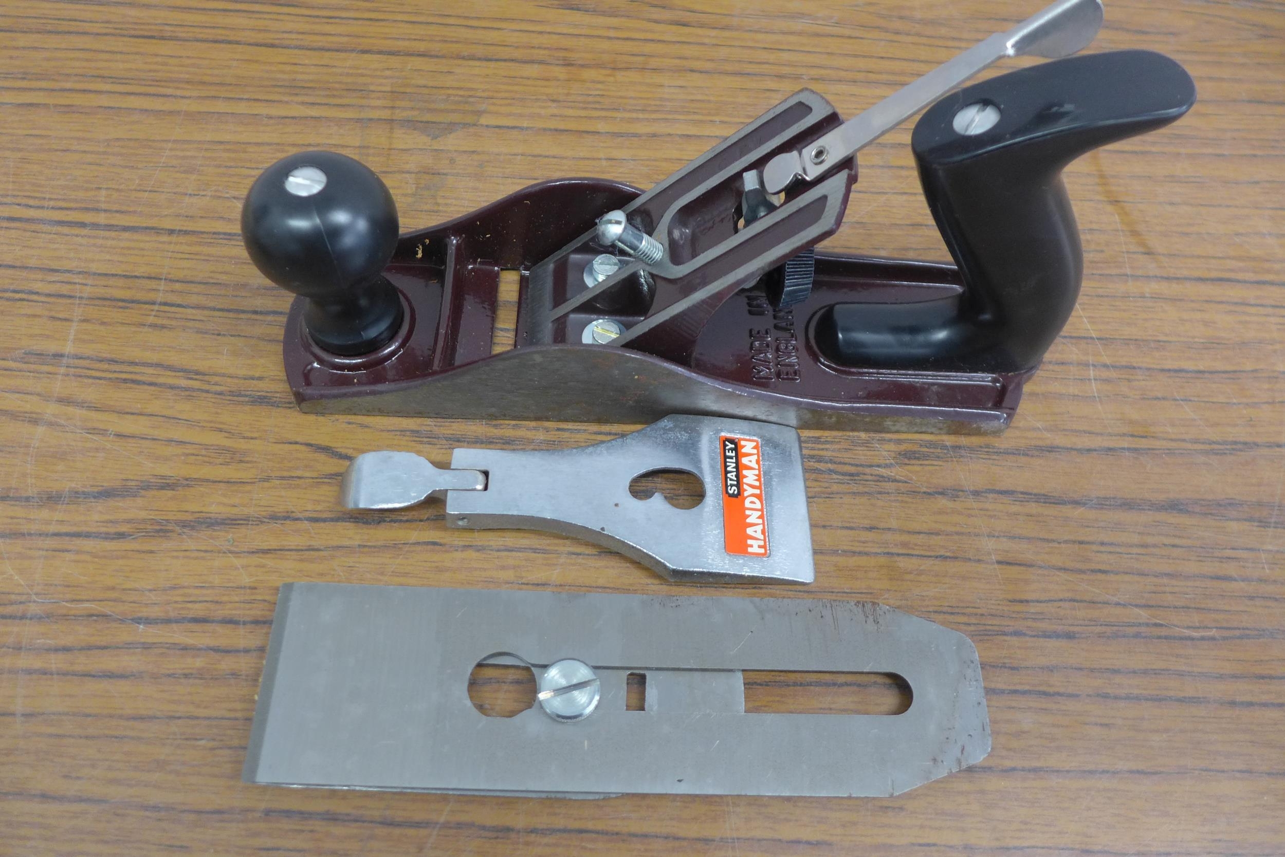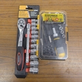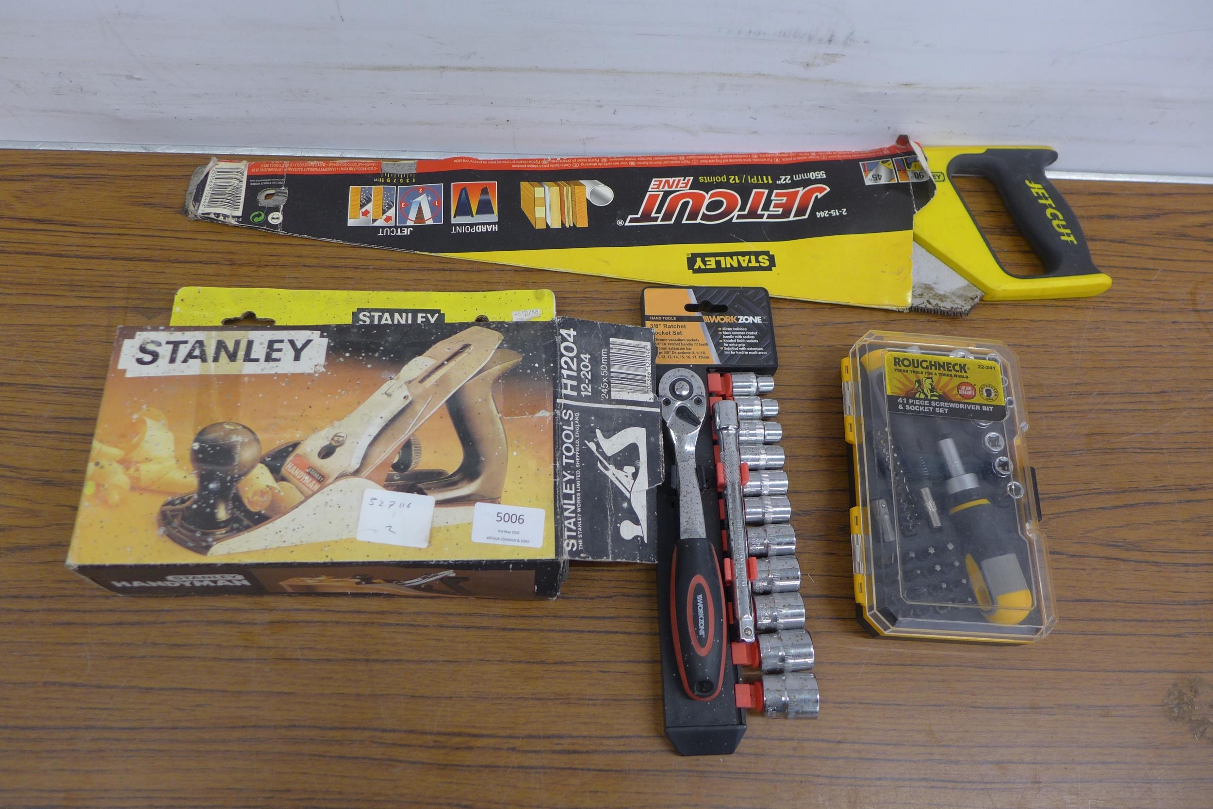 A Stanley Handyman wood plane in original box, a Stanley saw, a Workzone 3/8" ratchet socket set and a Roughneck 41 piece screwdriver bit and socket set
