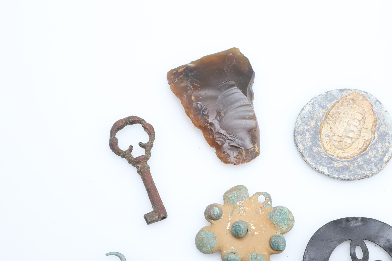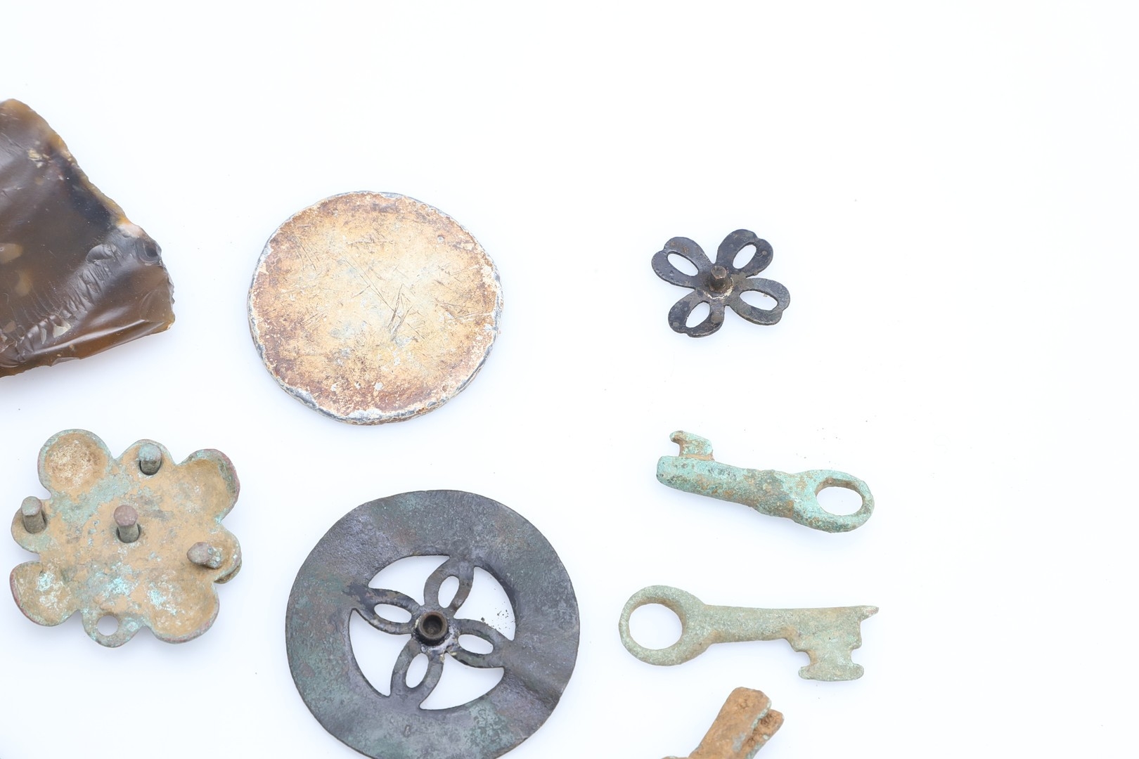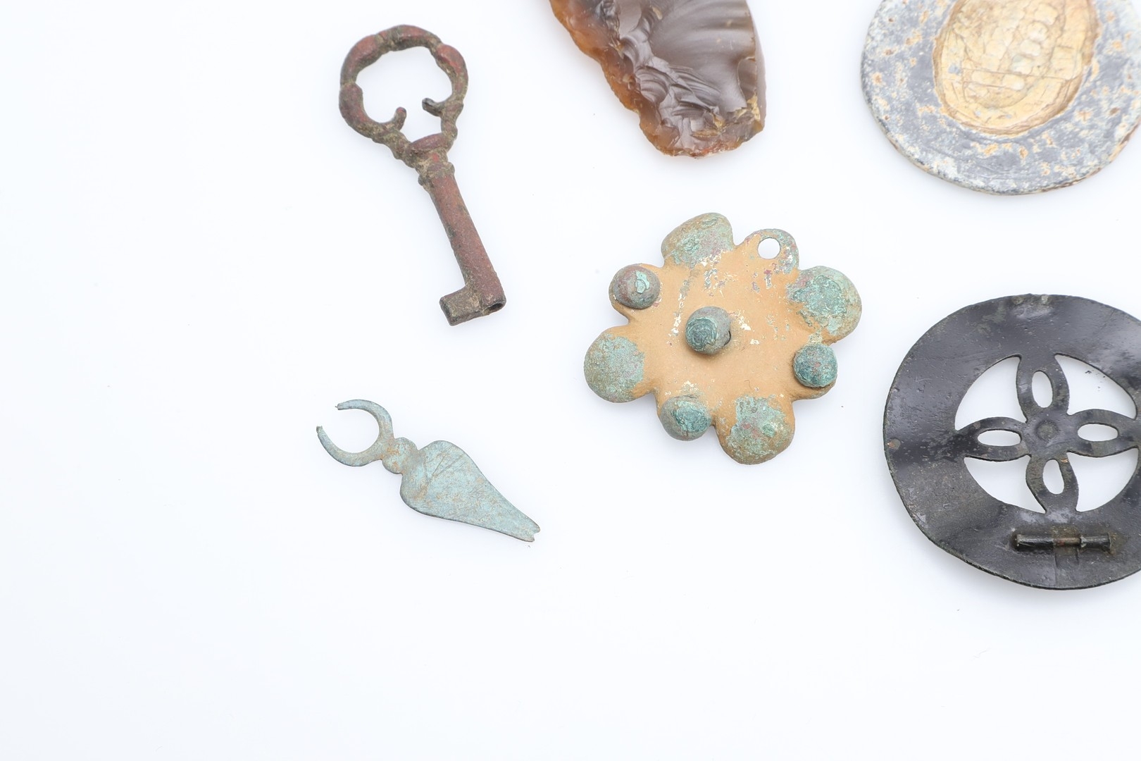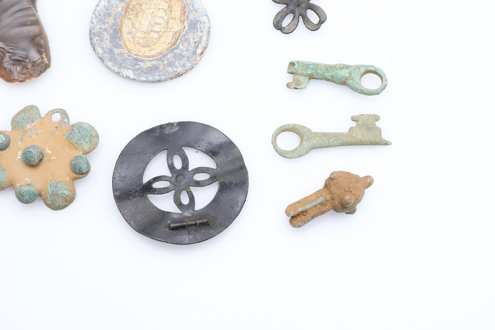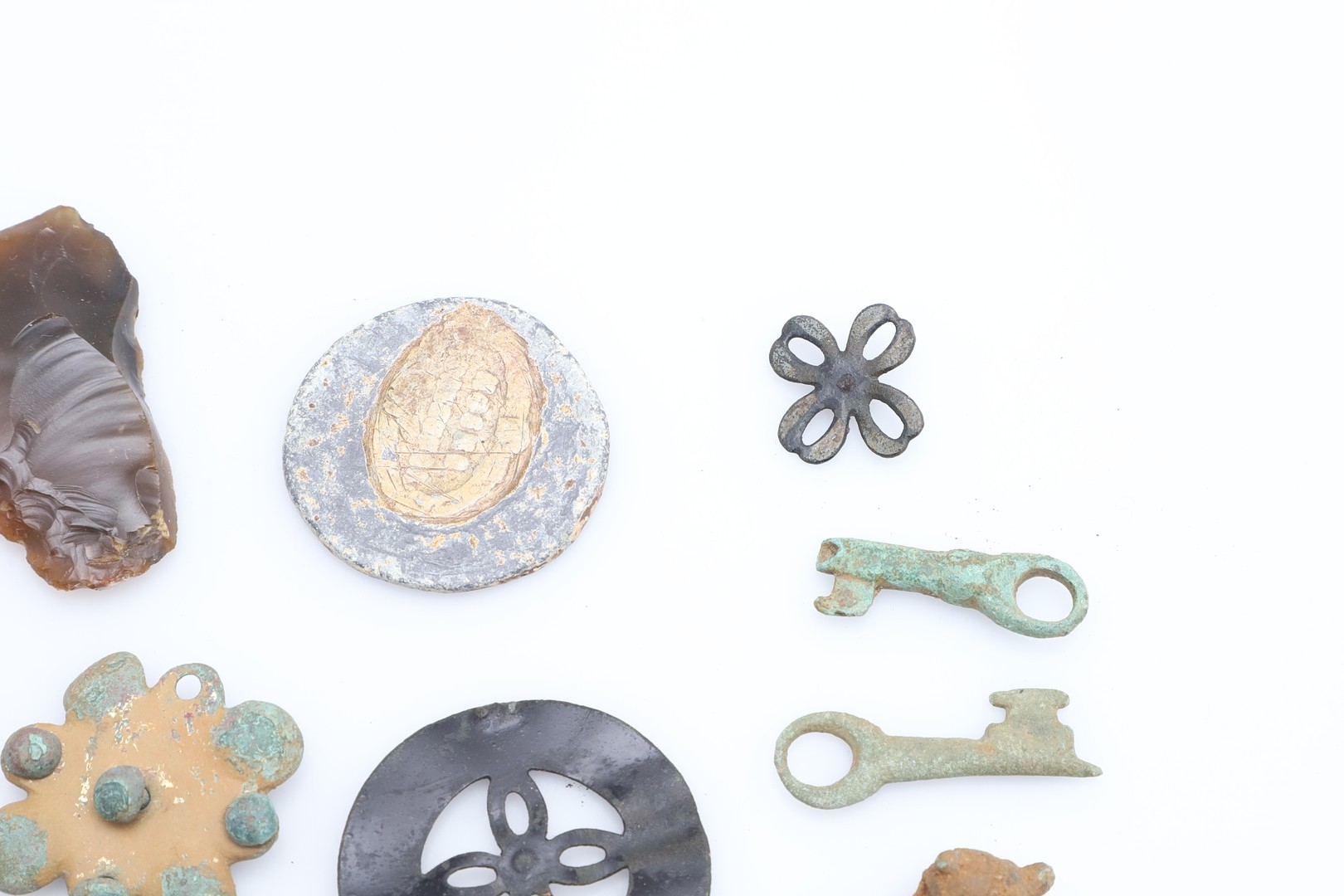A ROMAN BRONZE NAIL CLEANER FROM A CHATELAINE AND OTHER ITEMS. A Roman bronze chatelain cosmetic nail cleaner, c.2nd-4th century AD, three Roman and Medieval keys, knapped flint tool, 13th-15th century copper-alloy mace shaped strap-end and other artefacts. (9).