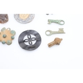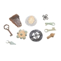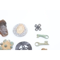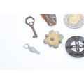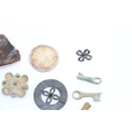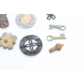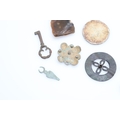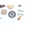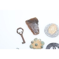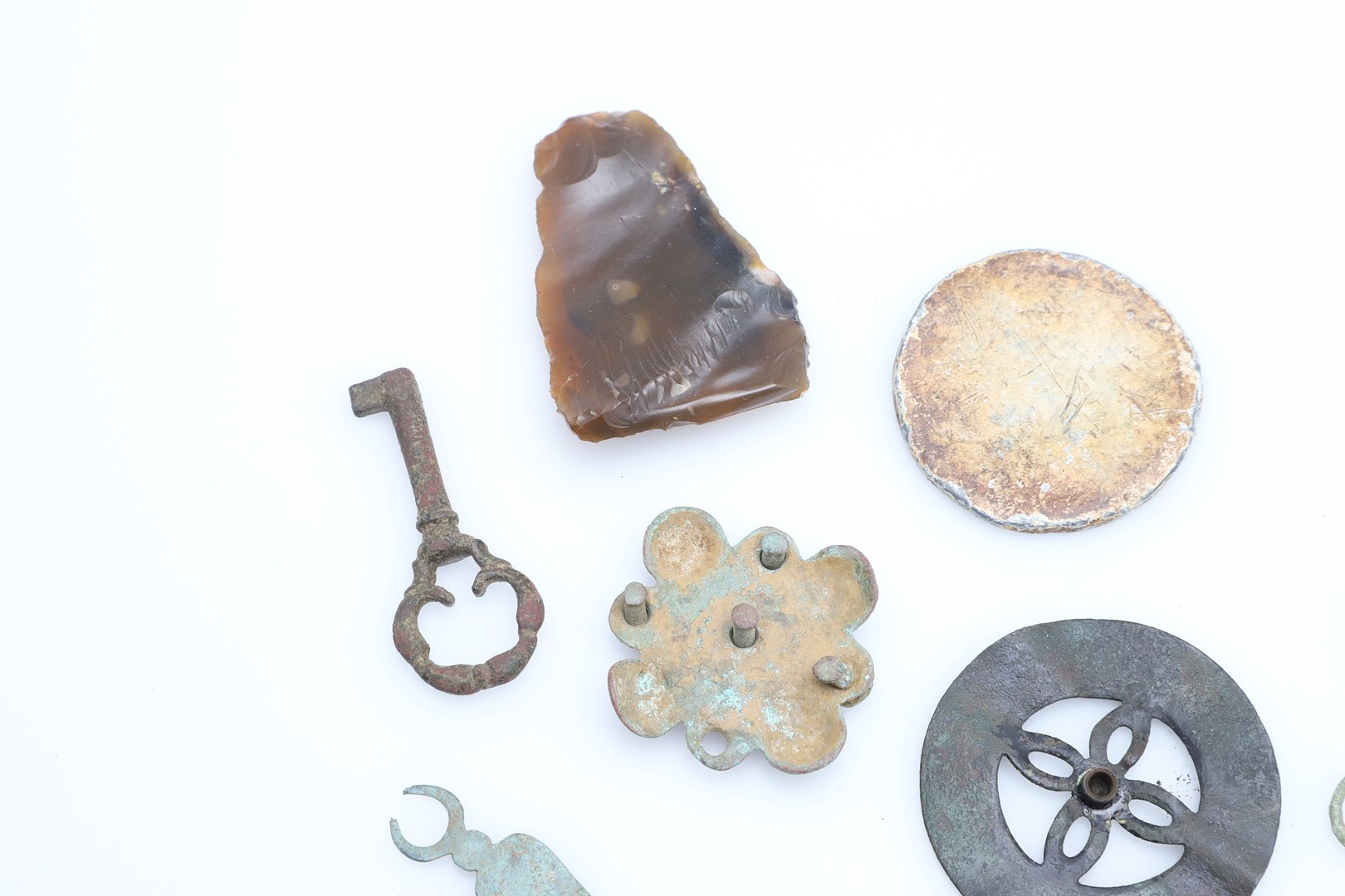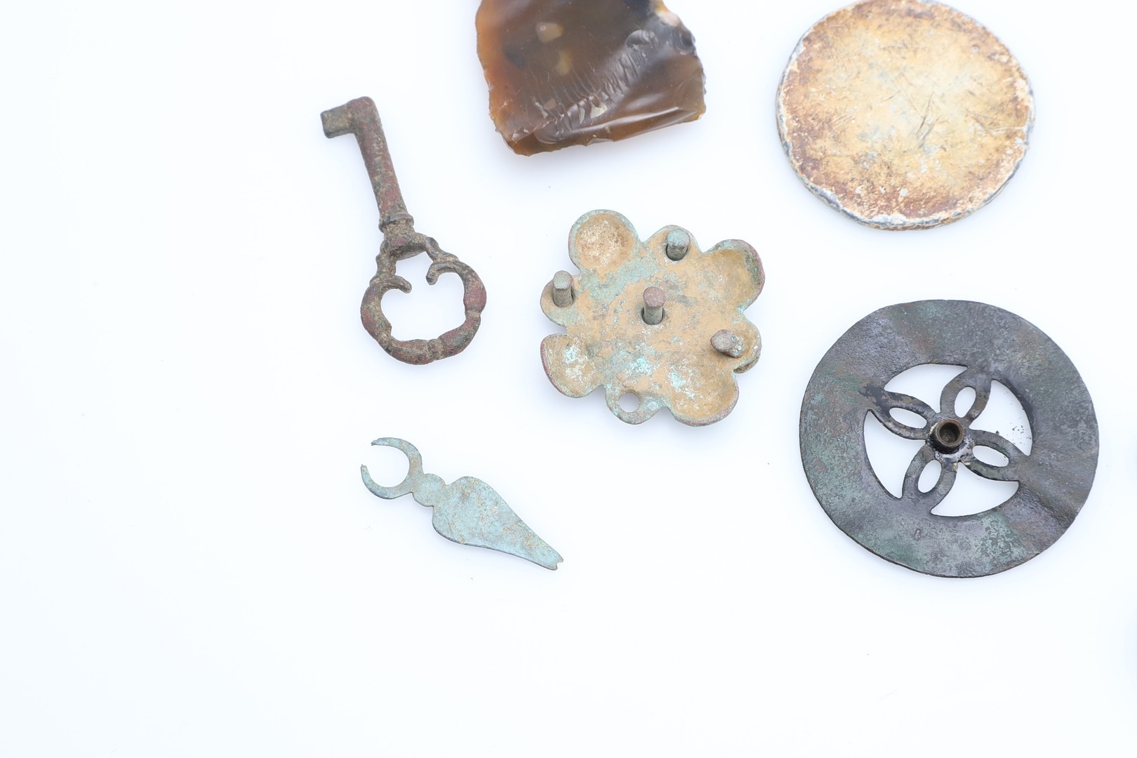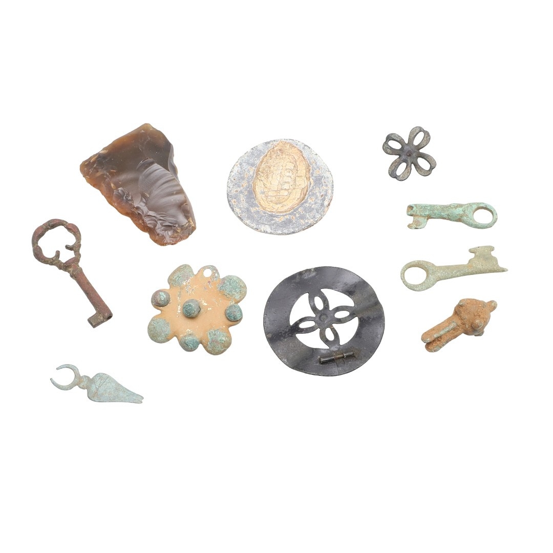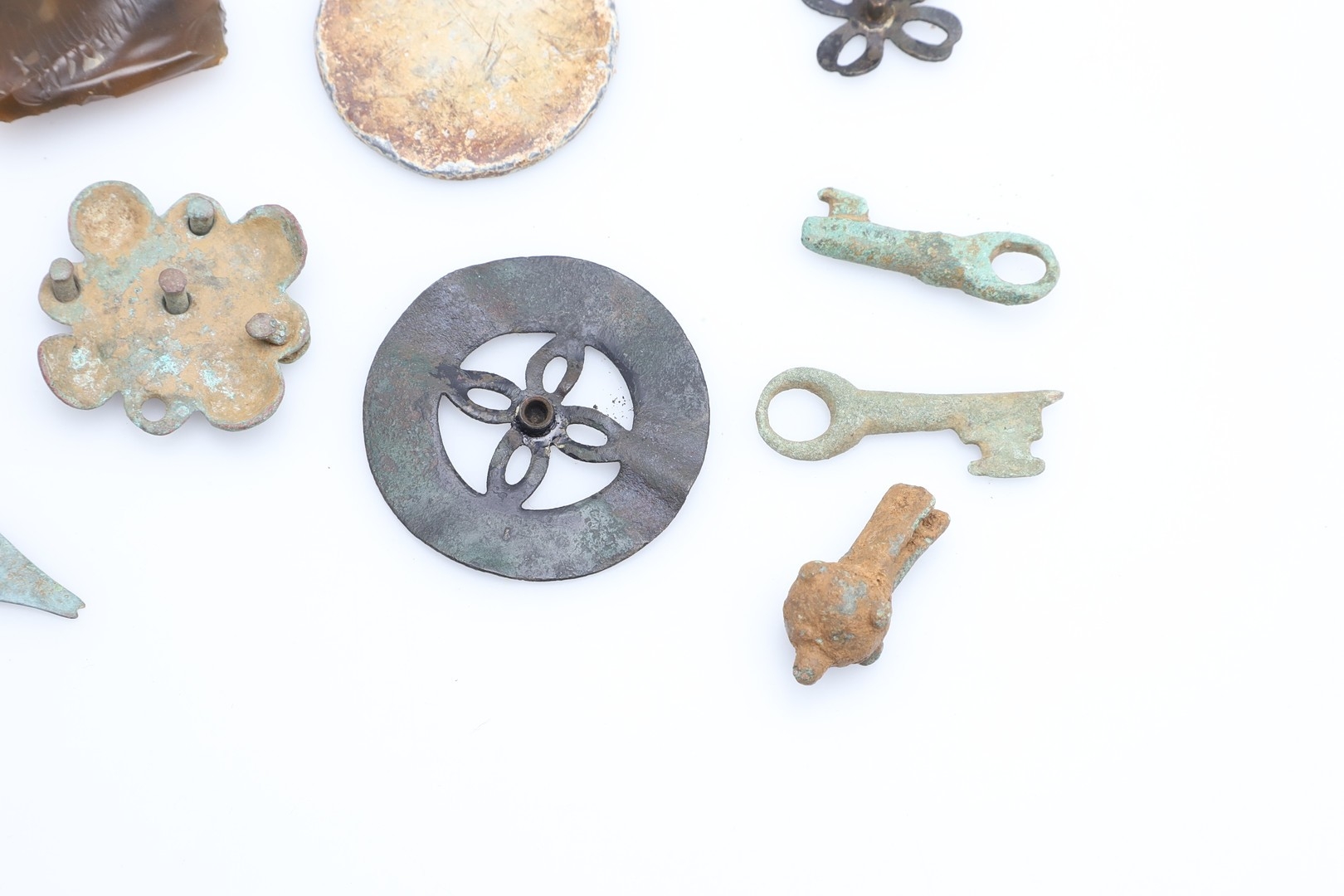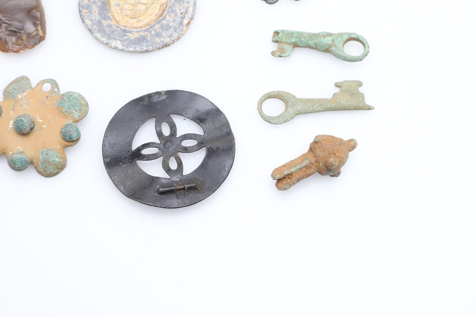 A ROMAN BRONZE NAIL CLEANER FROM A CHATELAINE AND OTHER ITEMS. A Roman bronze chatelain cosmetic nail cleaner, c.2nd-4th century AD, three Roman and Medieval keys, knapped flint tool, 13th-15th century copper-alloy mace shaped strap-end and other artefacts. (9).