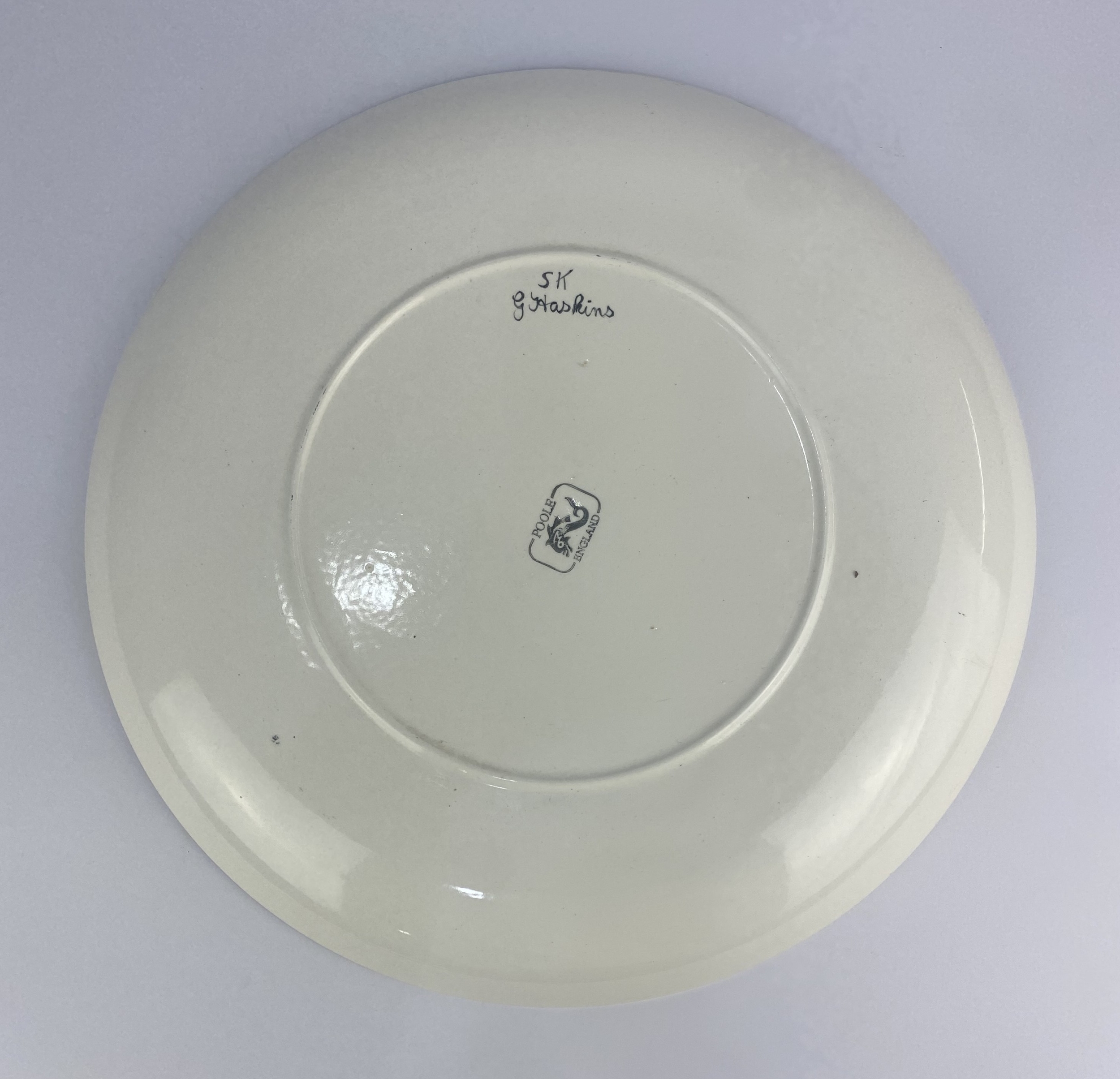 A Pool Pottery charger hand painted by Gwen Haskins in the 'Persian Deer' pattern, 34cm diameter.