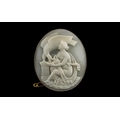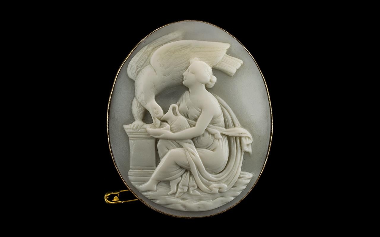 A Grand Tour Cameo Of Extremely Fine Quality Carving - Depicting a Classical Roman Allegorical Scene of a Maiden In Flowing Robes Feeding an Imperial Eagle, Carved on a Milky Coloured Ground, Housed In a 9ct Gold Oval Frame. c.1850's / 1860's. Size 2.1/4 x 2 Inches. Wonderful Condition In All Aspects. Provenance - From a Ladies Private Collection.