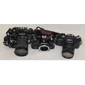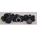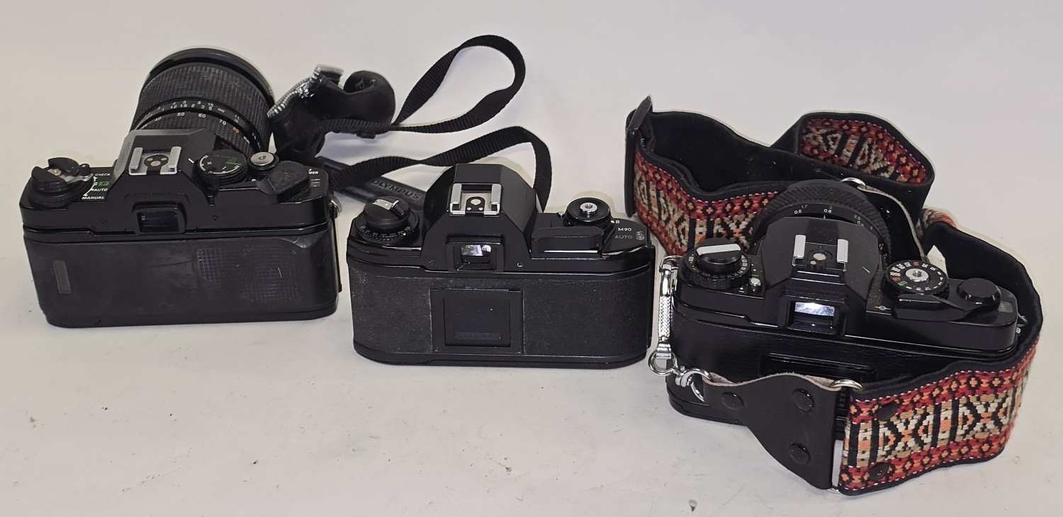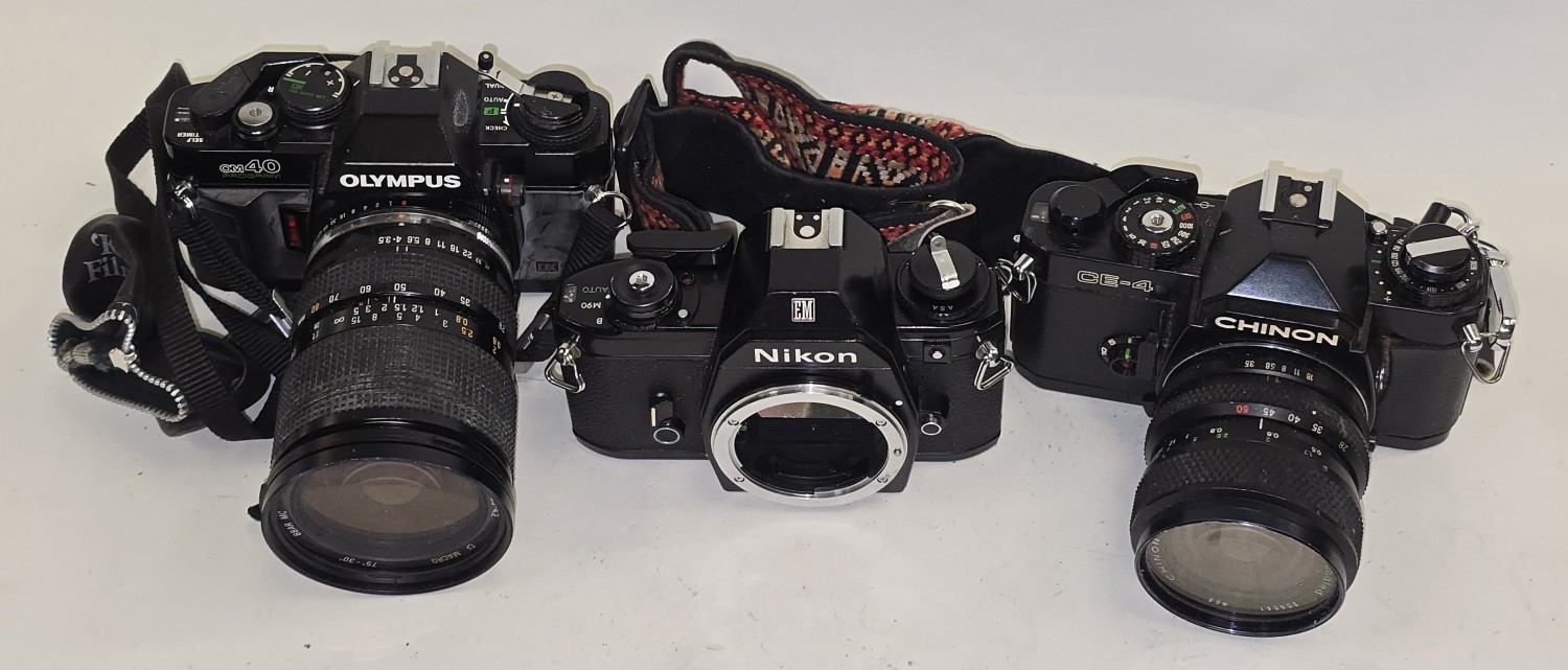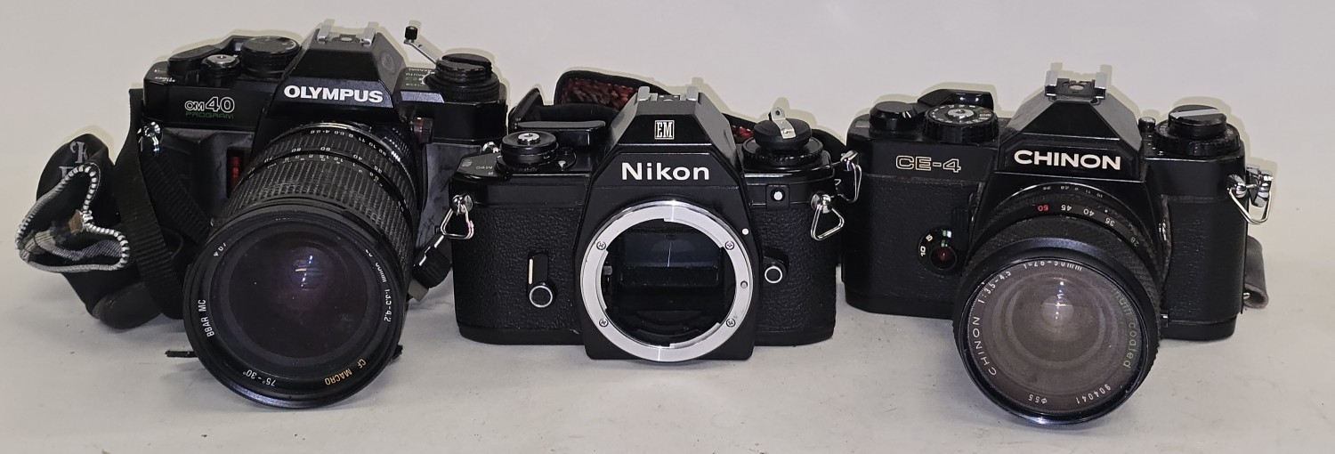 3 x vintage 35mm SLR film cameras to include Nikon EM body, Chinon CE-4 c/w lens and Olympus OM40 Program c/w lens.