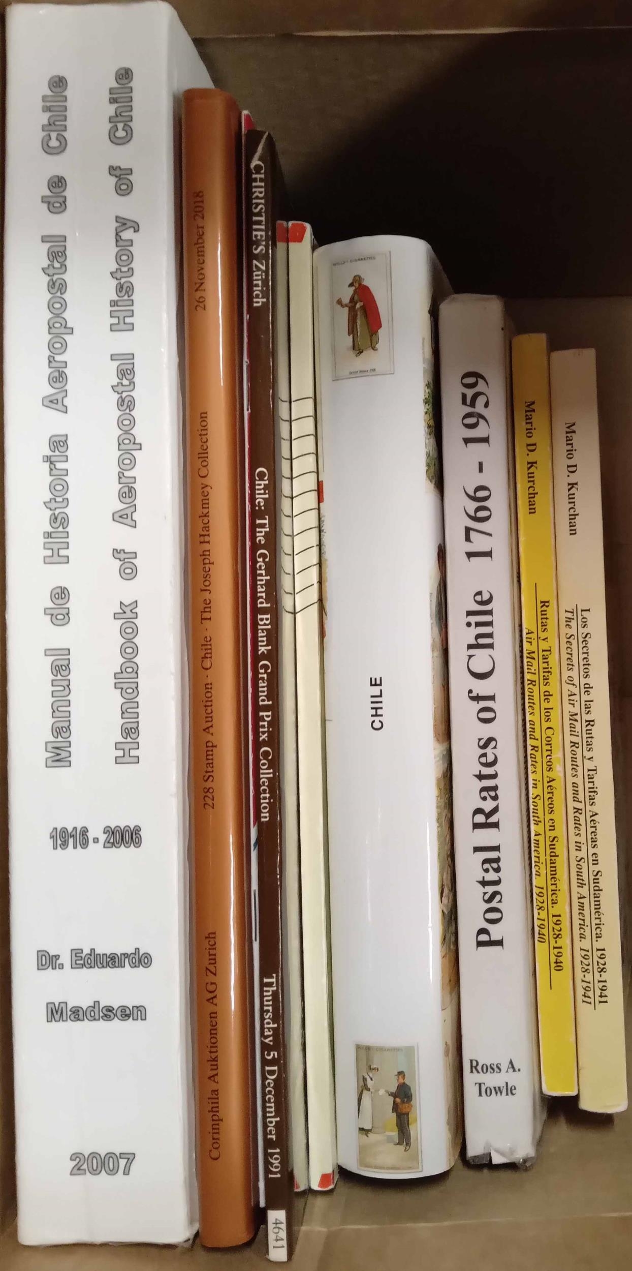 CHILE & SOUTH AMERICA: A box containing 'Handbook of Aeropostal History of Chile 1916-2006' bt Madsen; The Postal History of Chile' by Proud; 'Postal Rates of Chile' by Towle; 'Air Mail Routes and Rates in South America, 1928-1940' and 'The Secrets of Air Mail Routes and Rates in South America, 1928-1941' bothy by Kurchan; plus a few auction catalogues. All in fine condition. (8) Cross Reference: CHILE