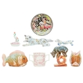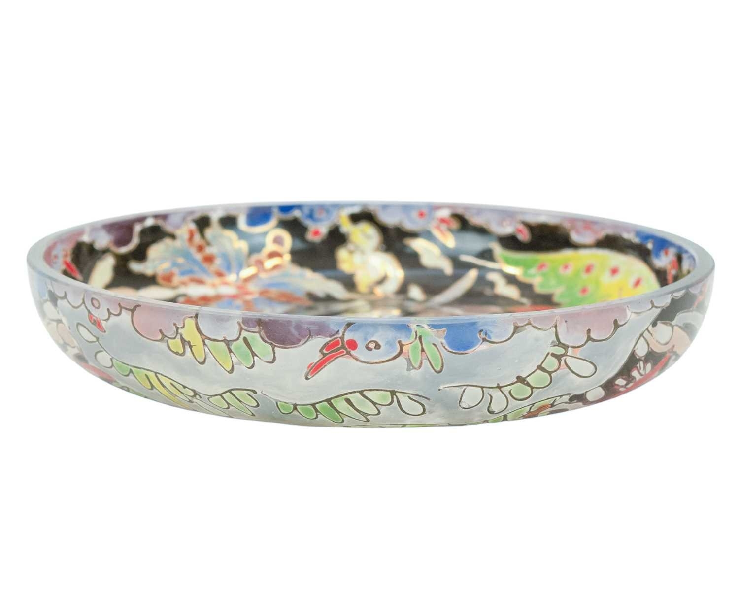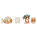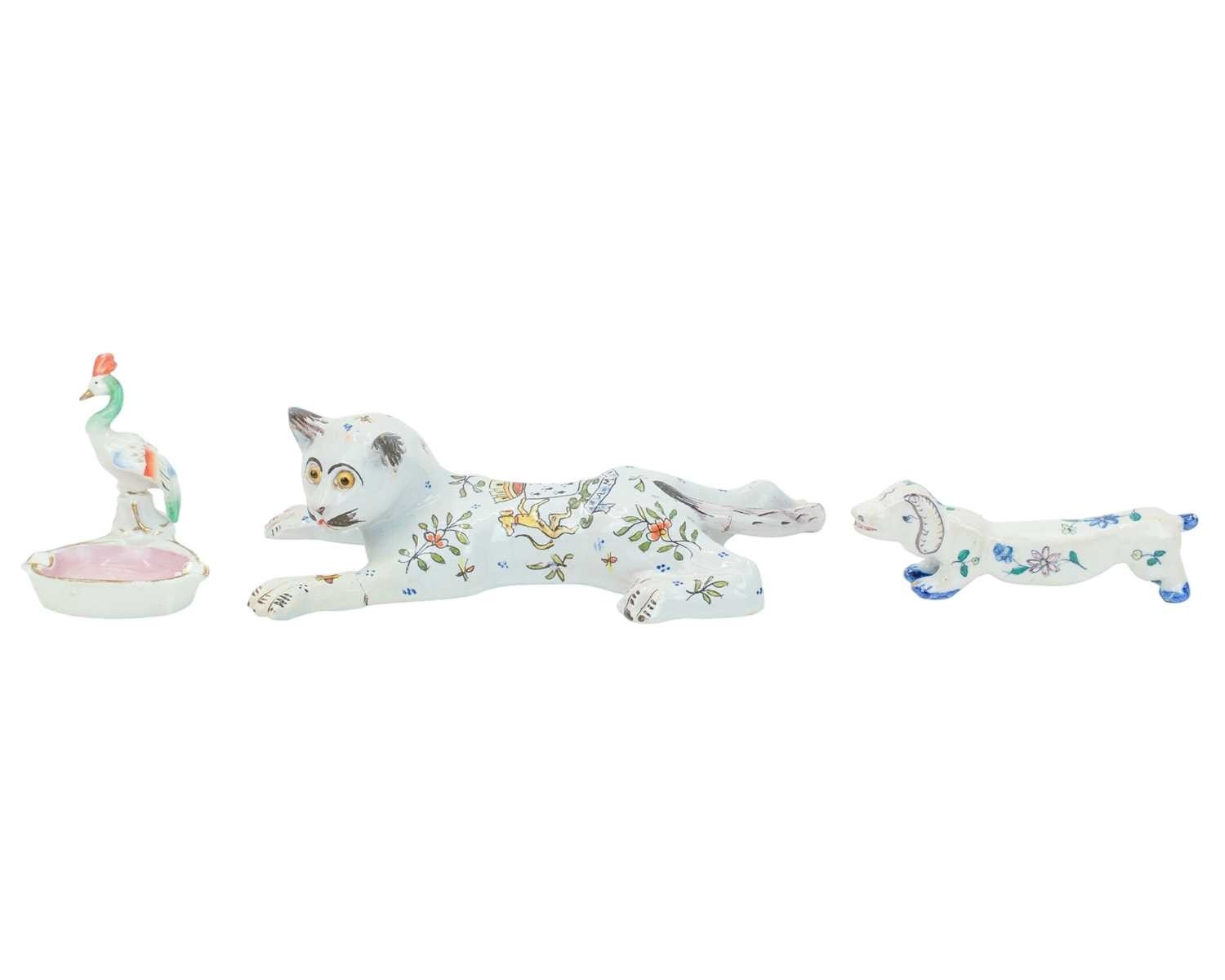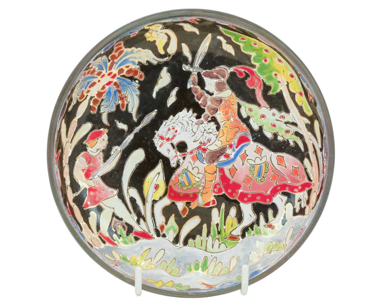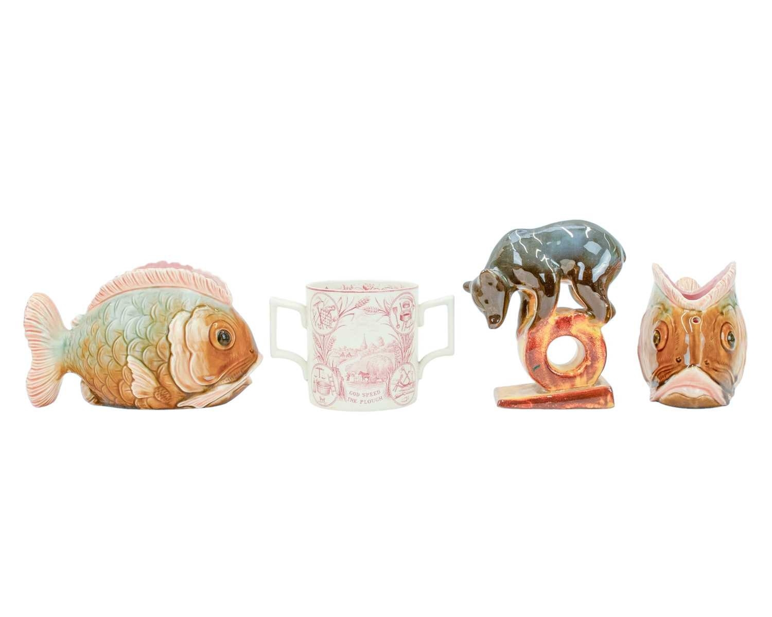 A pair of Eichwald pottery fish planters. Early 20th century, impressed marks to the base and numbered 5665, height 11cm, width 18cm, with other ceramics and glassware including an acrobatic bear by Konakovo stamped USSR to the base, a twin-handled 'God Speed the Plough' Bee Farmer mug by A.W. Gale and a Spanish ROYO handpainted enamelled dish, depicting a batttle scene on horseback, with other items (8).
