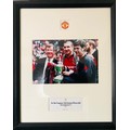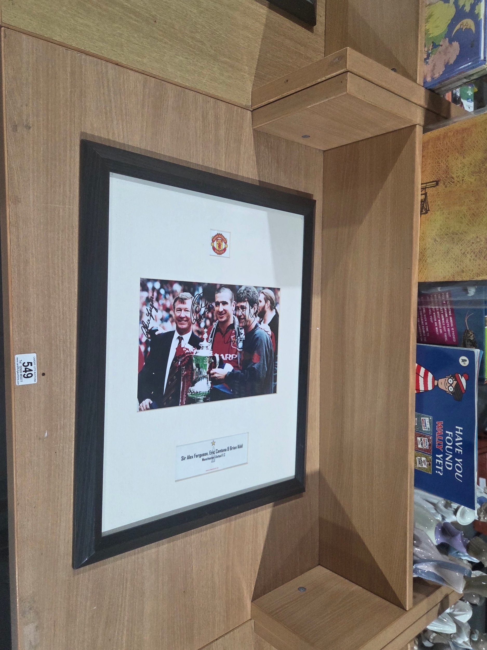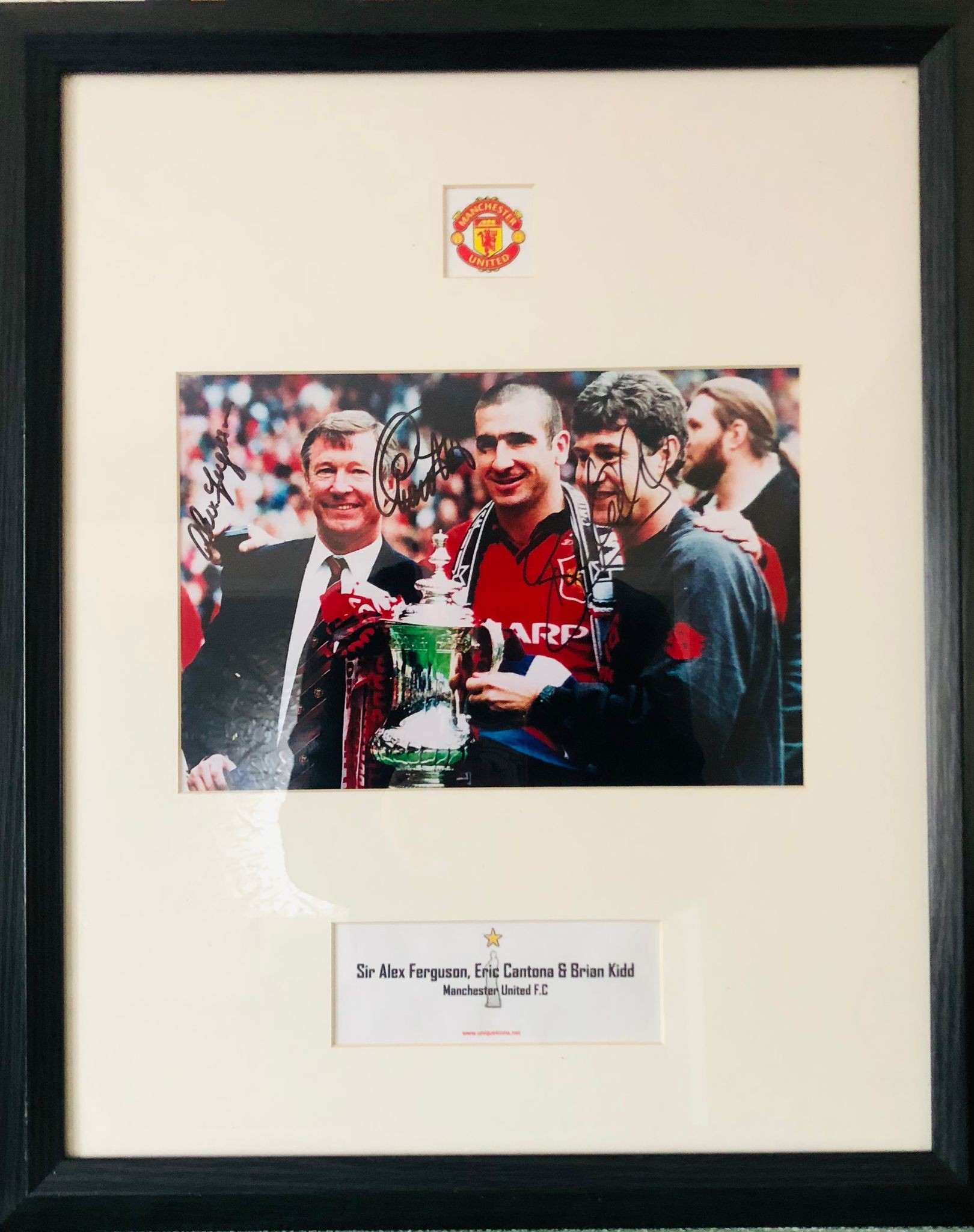 A framed signed photograph of Manchester United F.C - Sir Alex Ferguson, Eric Cantona and Brian Kid with certificate of authenticity