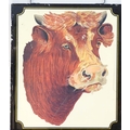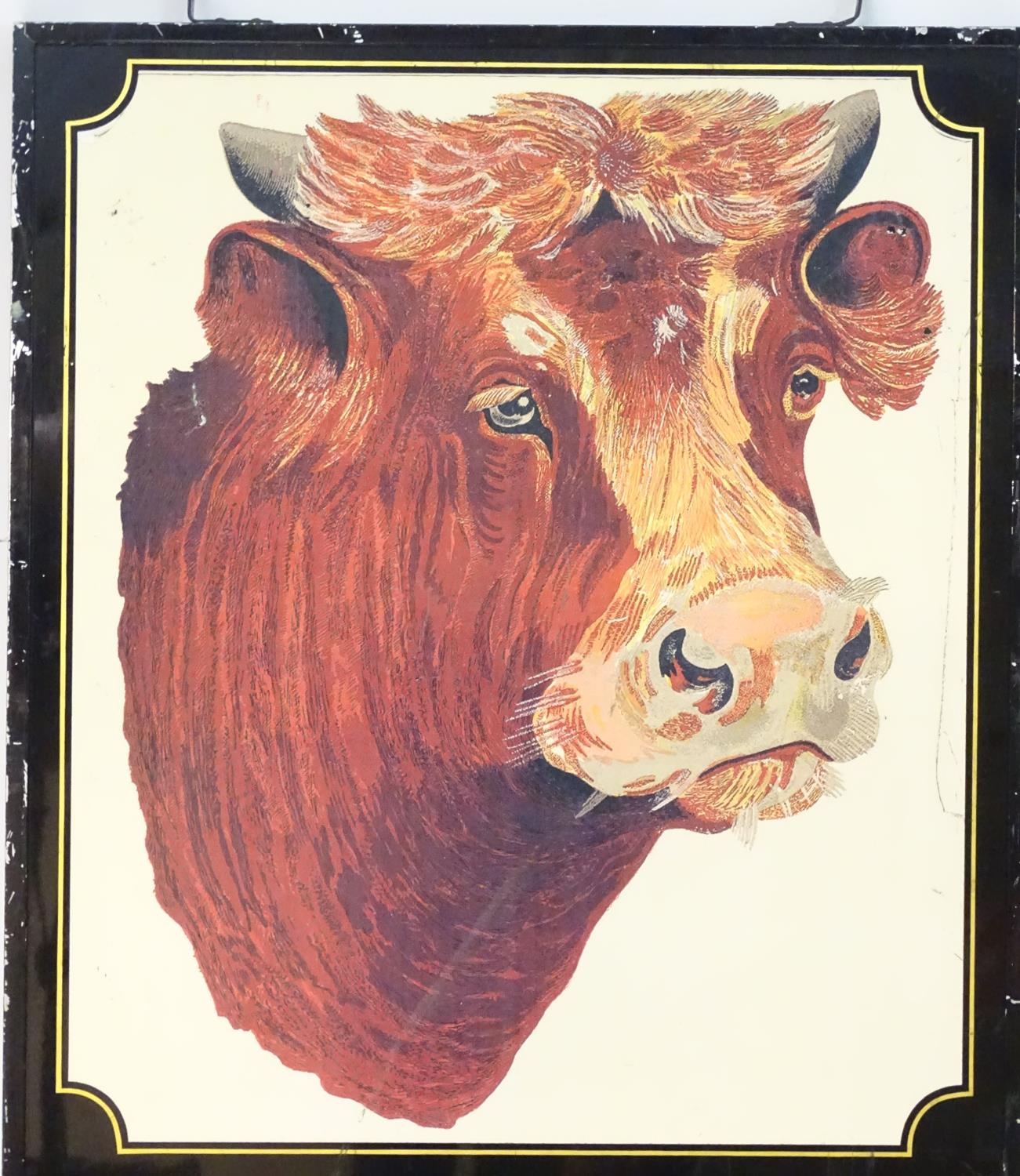A 20thC pub sign, 'Bull's Head', with printed lettering and illustration of an Ayrshire bull, 44 1/2" x 34 1/4"