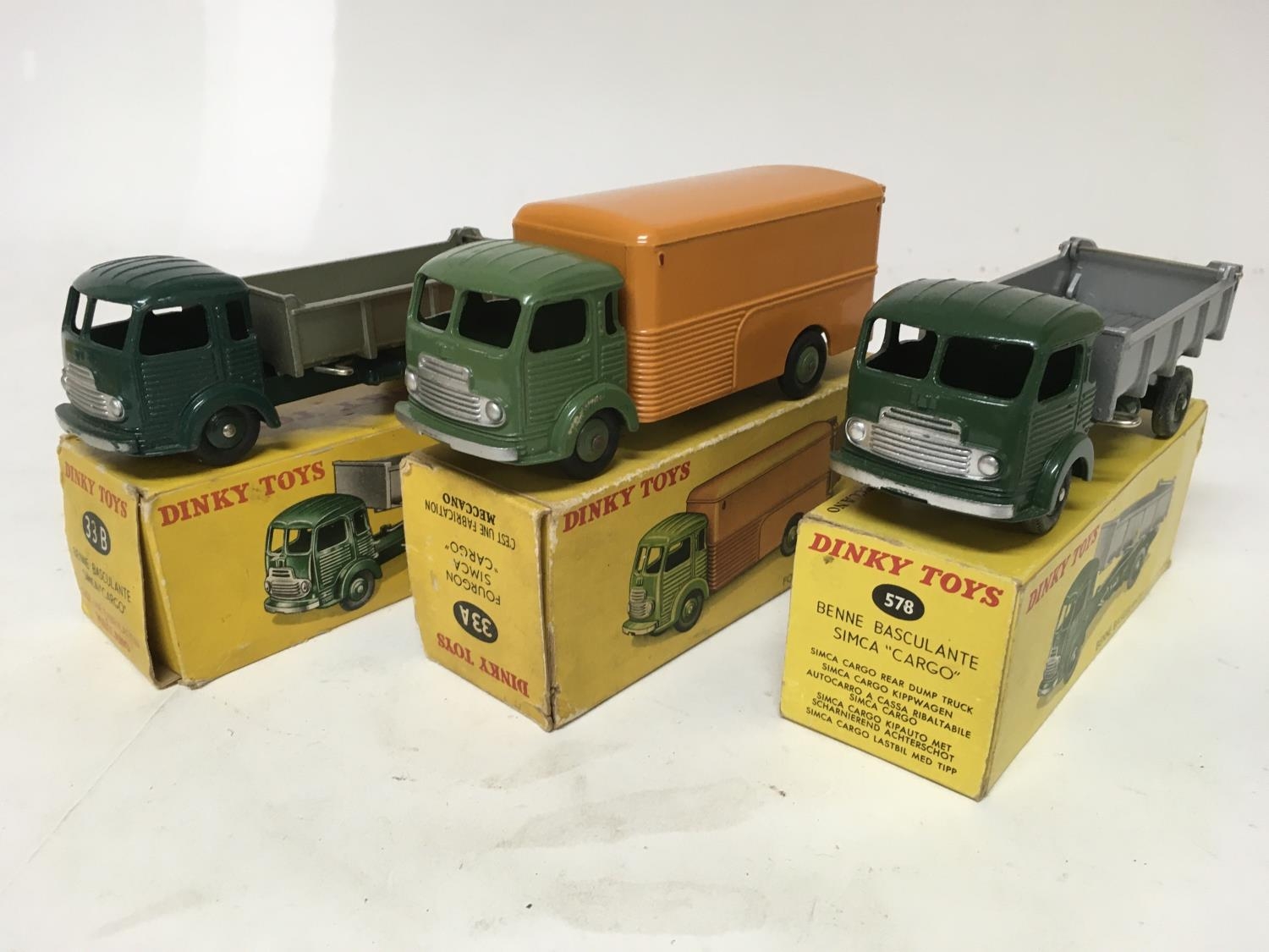 Dinky toys, French Dinky, #33B Simca cargo tipper lorry x2 and #33A Simca cargo , boxed