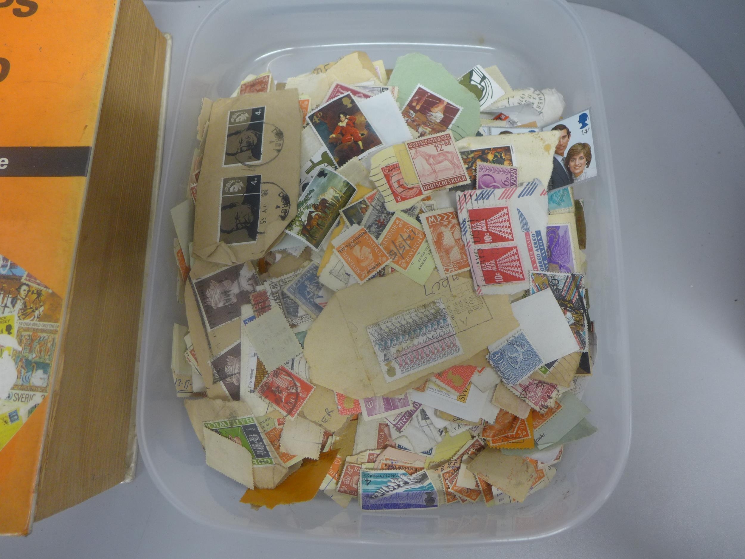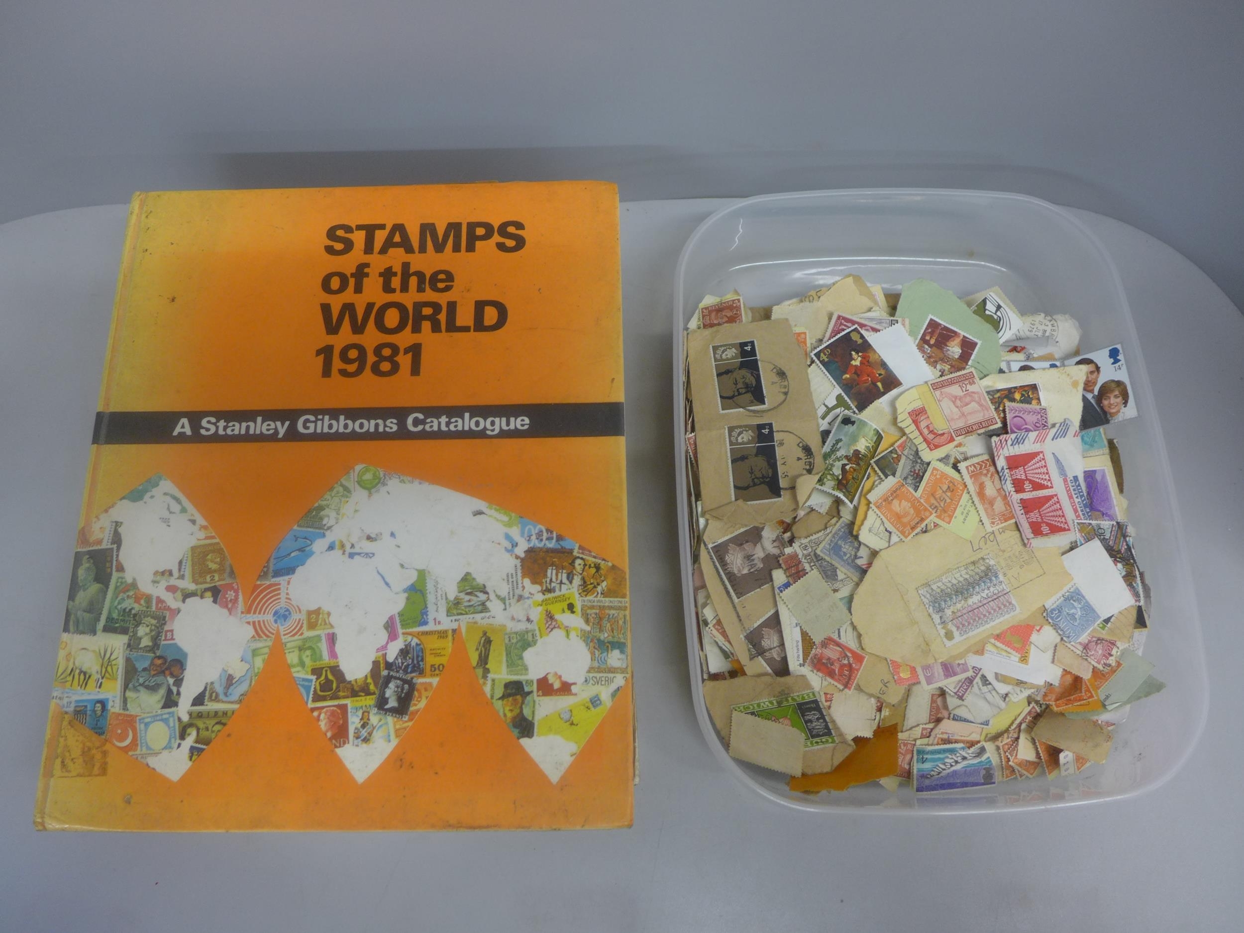 A 1981 Stanley Gibbons Stamps of the World Catalogue and a box of loose stamps