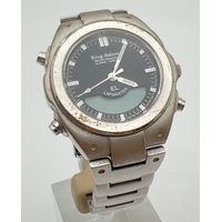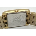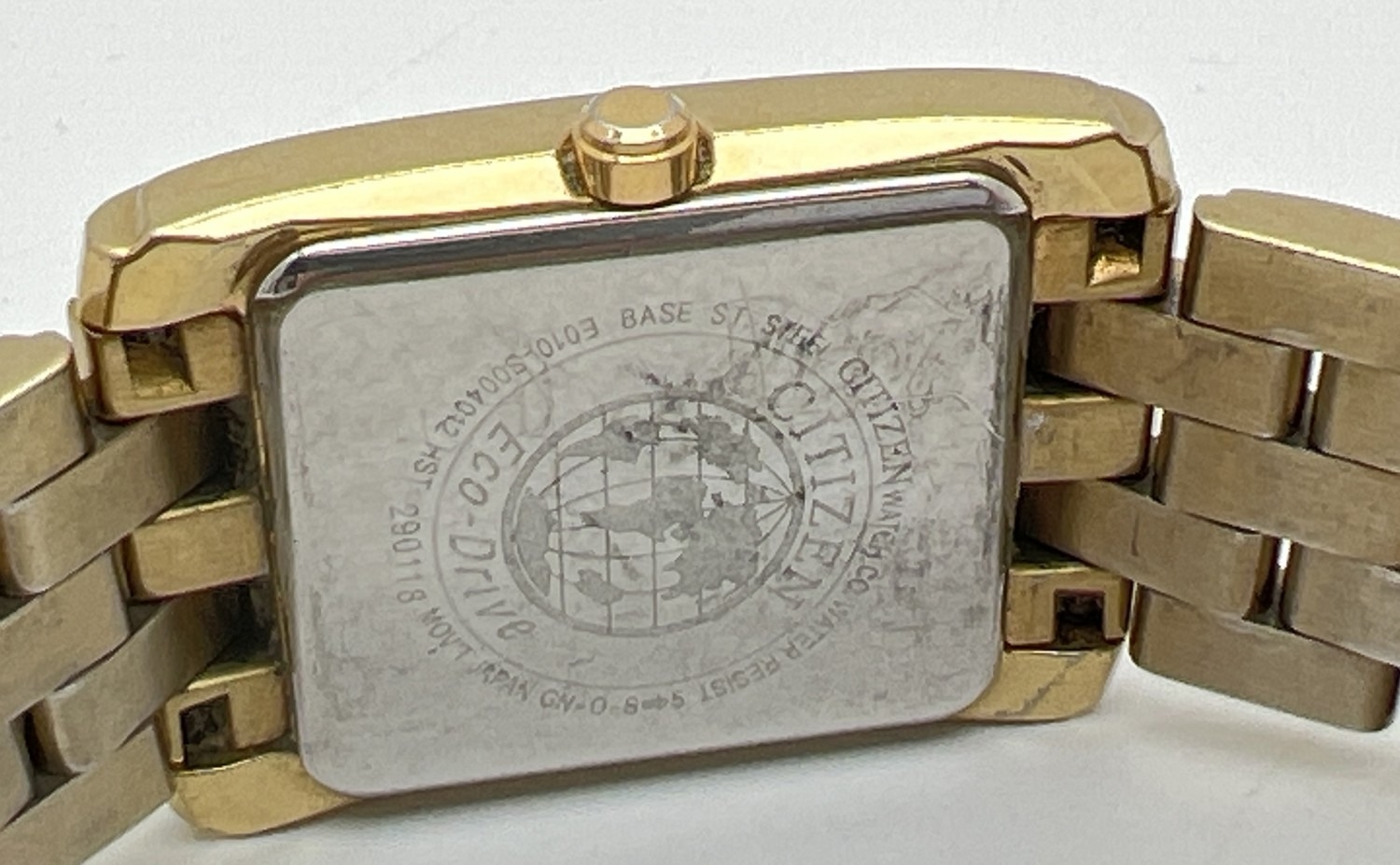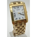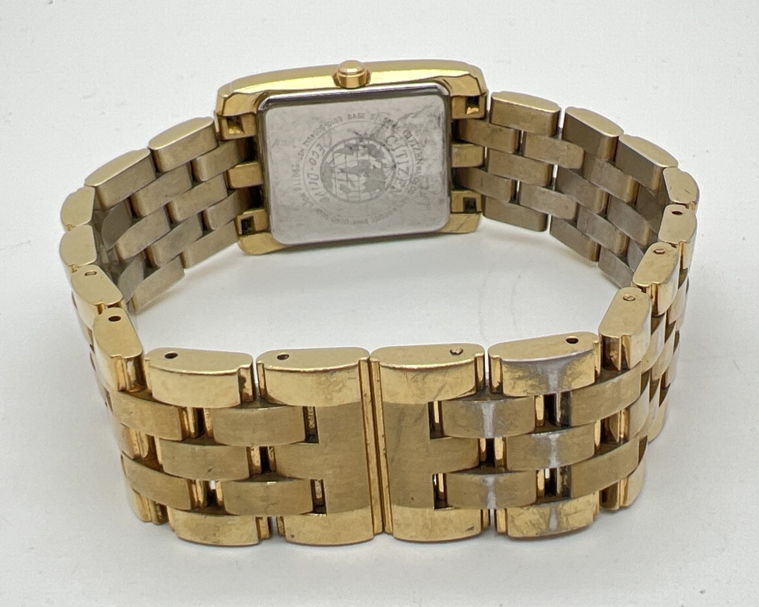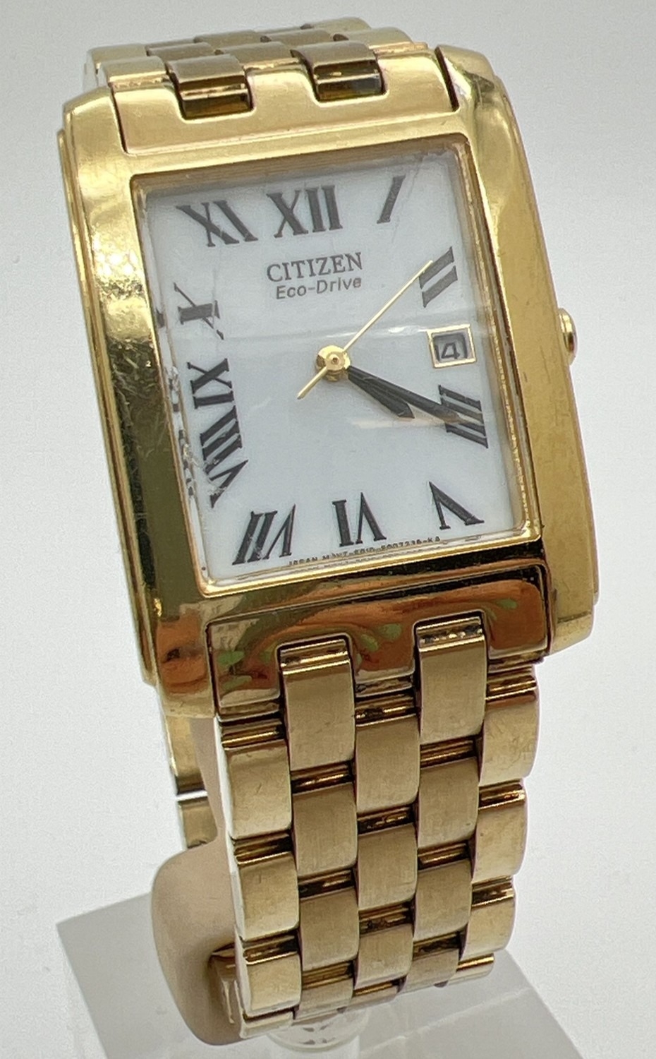 A men's Citizen Eco-Drive E010-S004012 HST wristwatch. Square gold tone stainless steel case and strap. White face with black Roman numeral hour markers and hands. Gold tone seconds hand and date function. In working order.