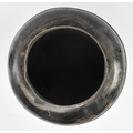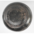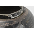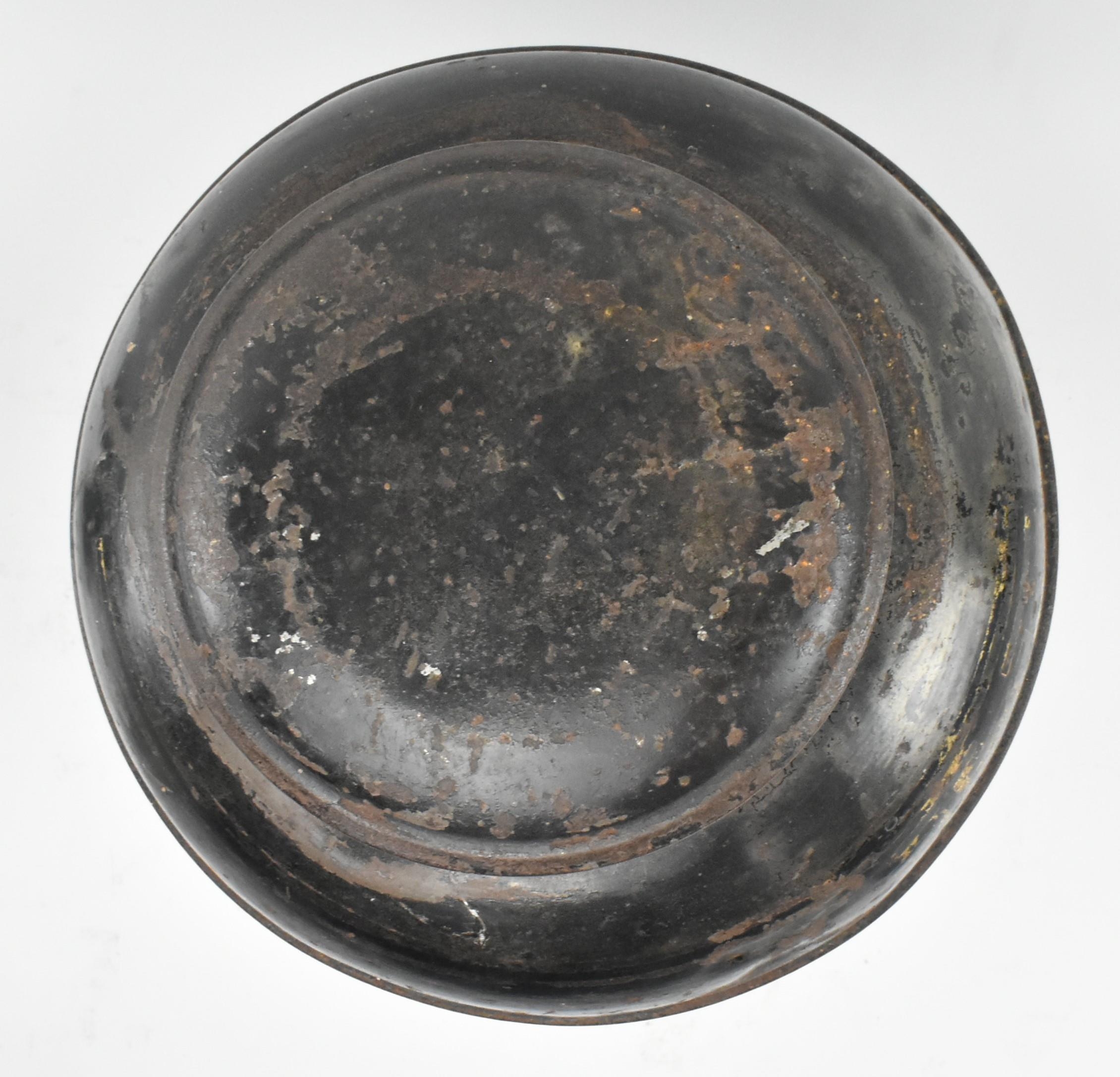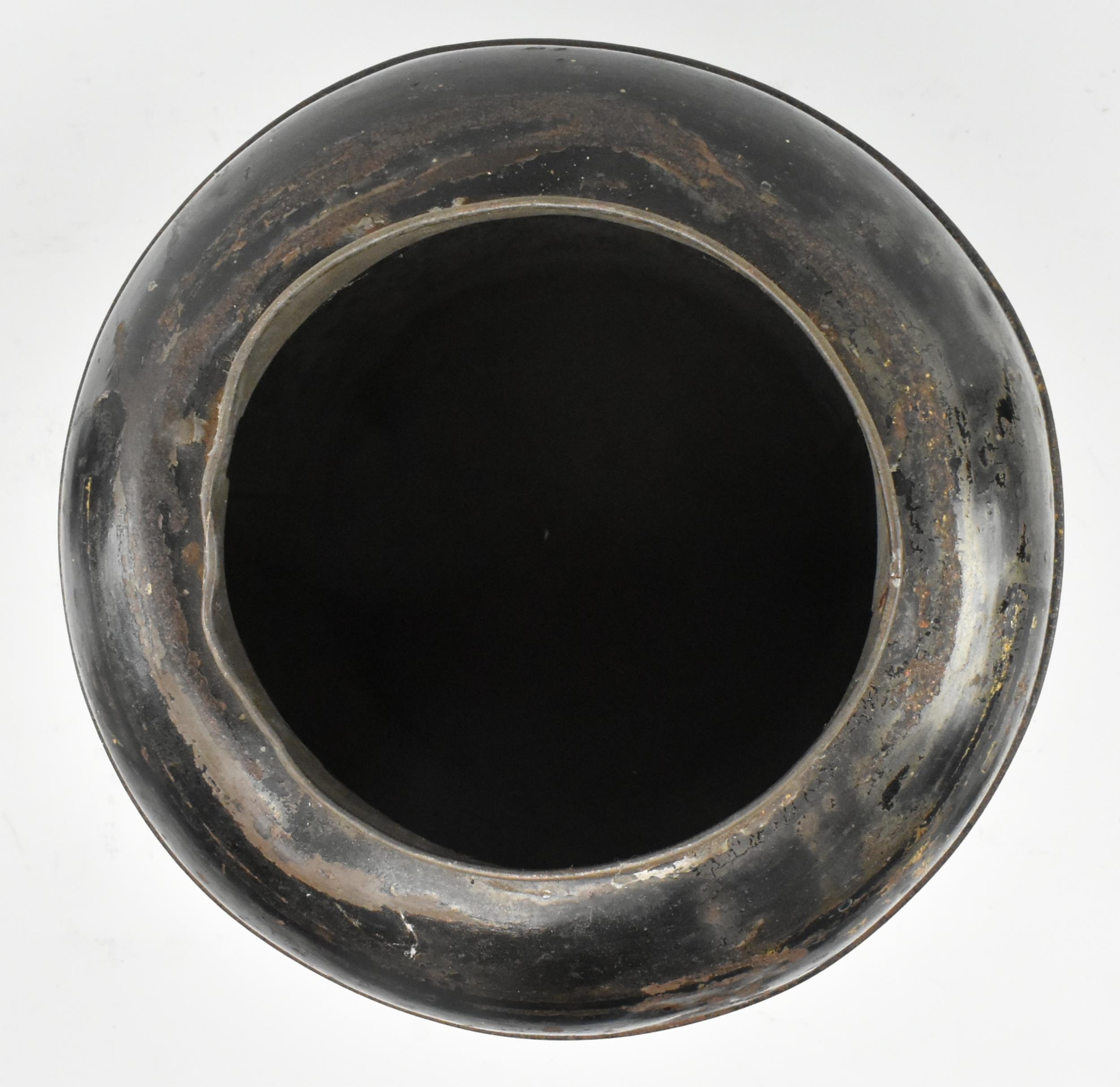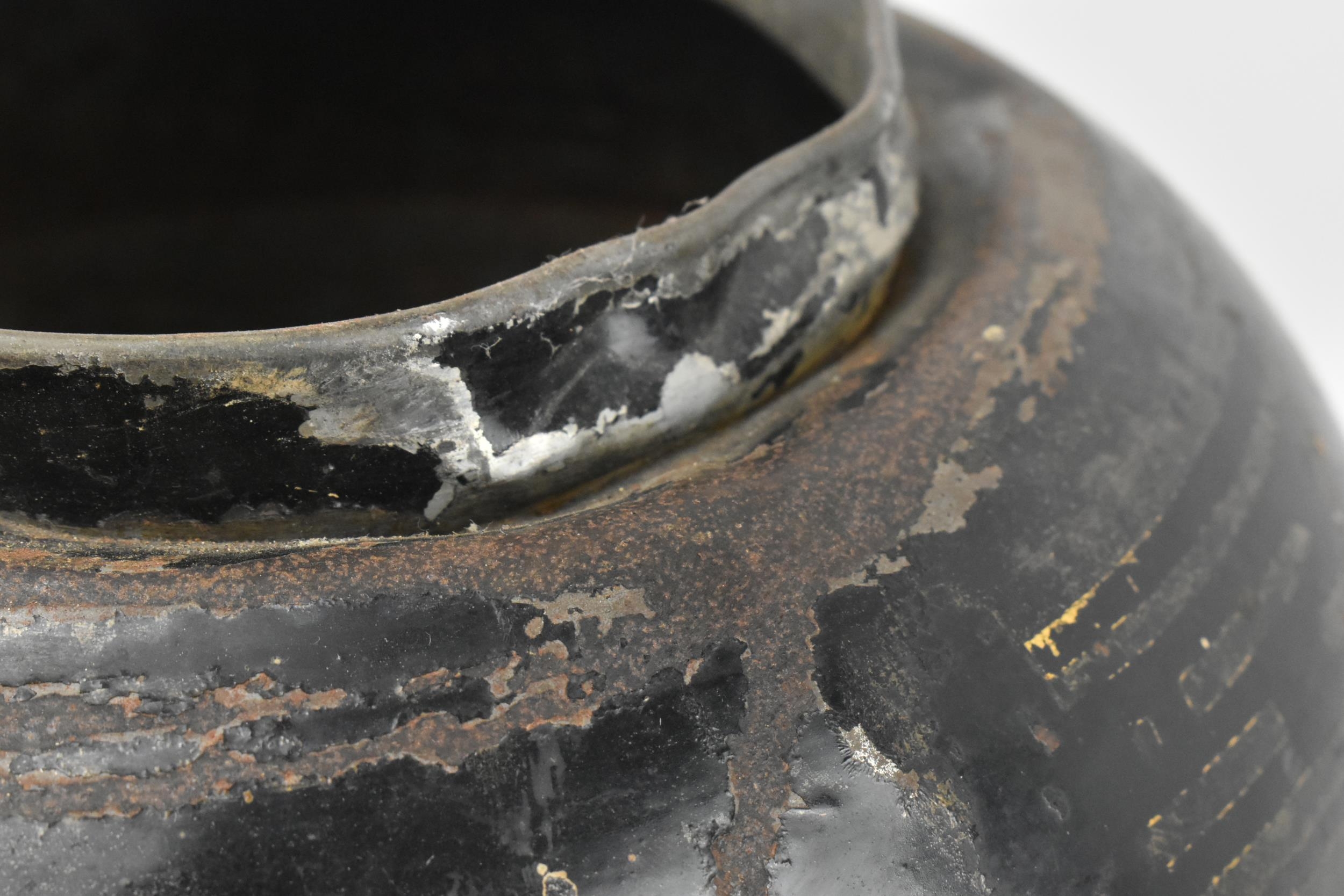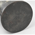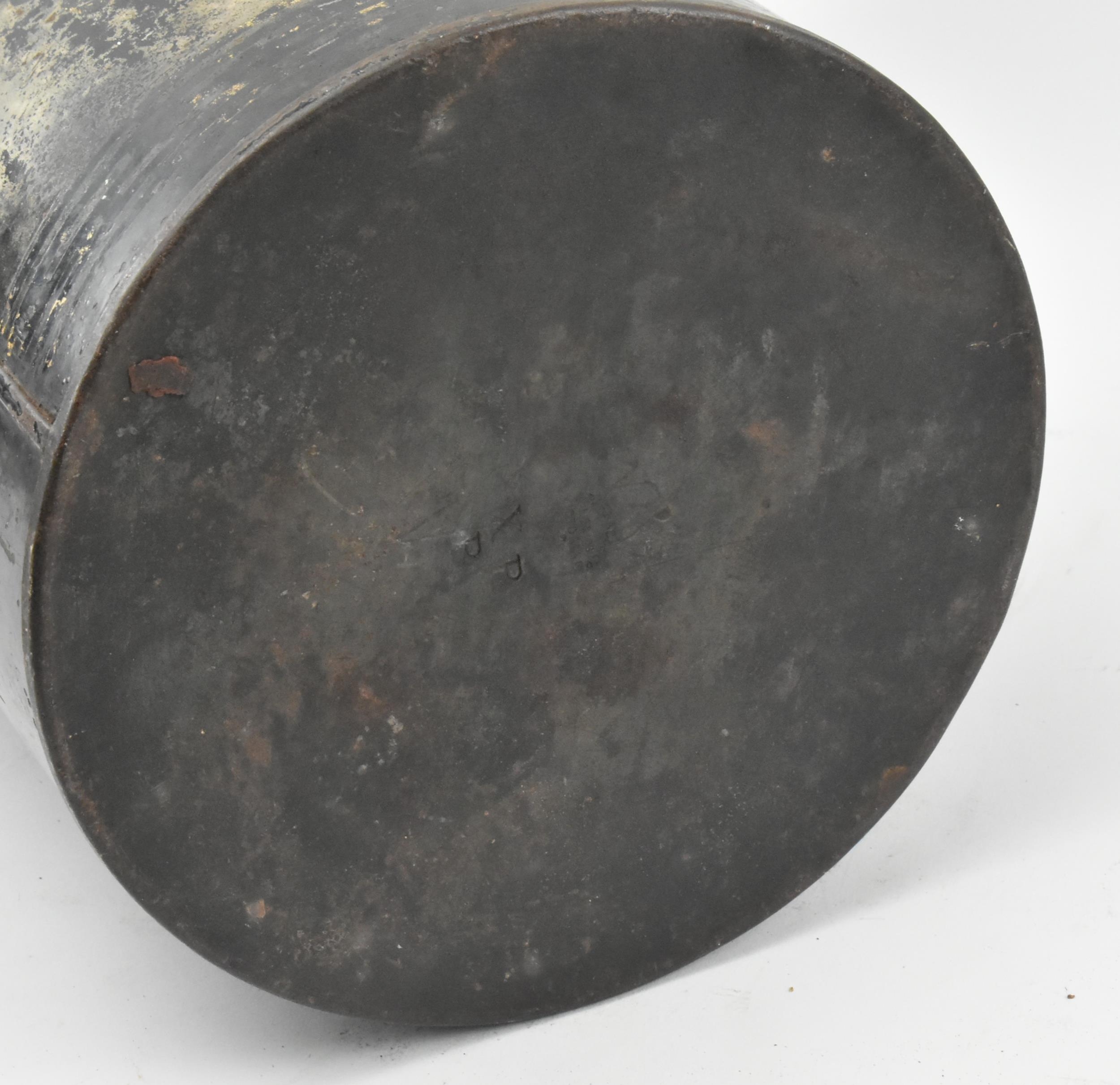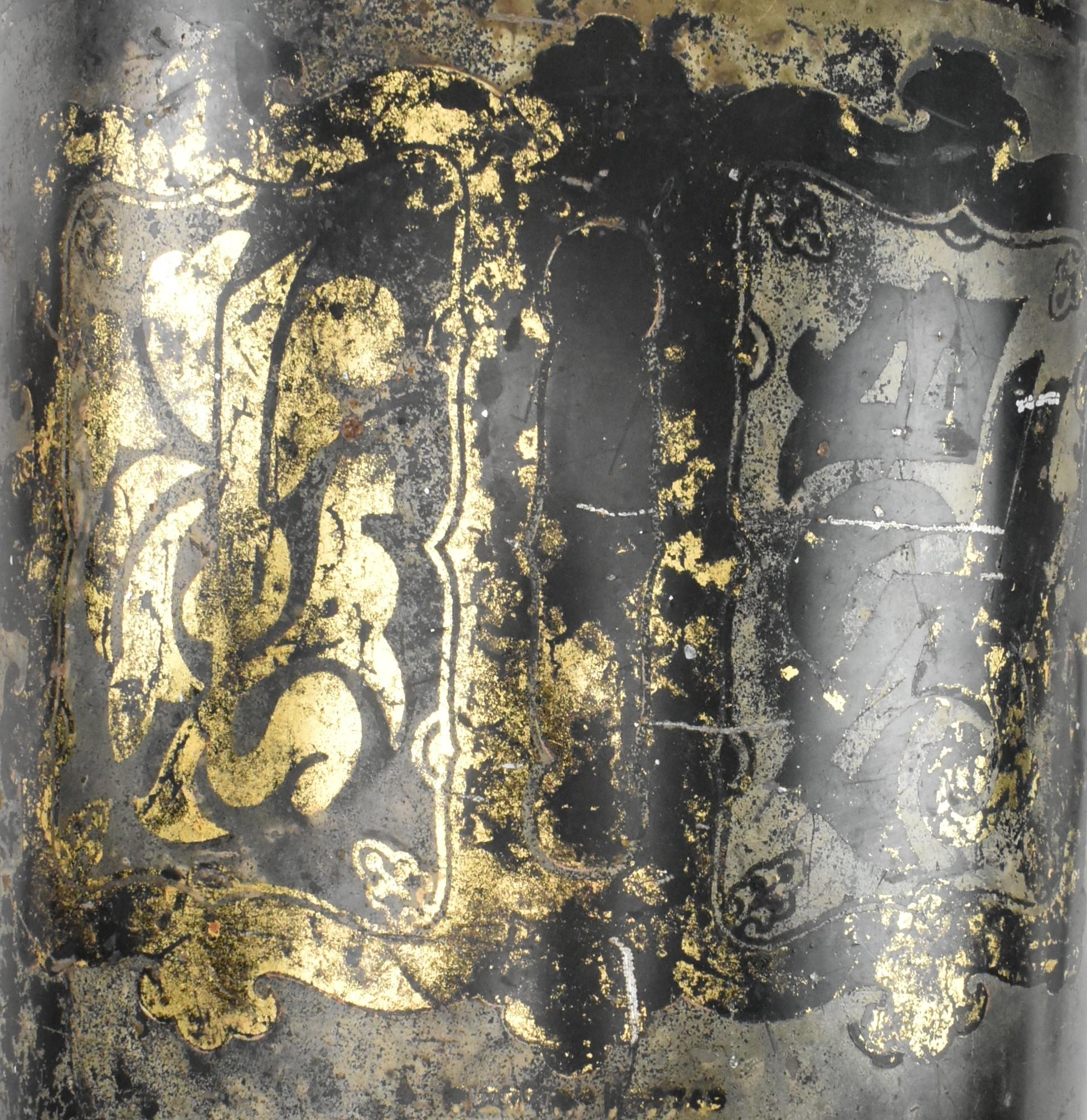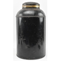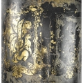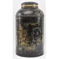 A Victorian 19th century black Japanned tole painte toleware tea canister with lid by Barnable & Co, Victoria St. The canister having worn gilt motifs and symbols throughout. General wear commensurate with age. Stamped to base. Measures approx. 44cm tall x 24cm in diameter.
