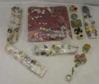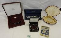 Hat Pins, Silver Necklace, Costume Jewellery inc. brooches set marcasite, enamel, paste, shell necklaces, faux ivory etc.