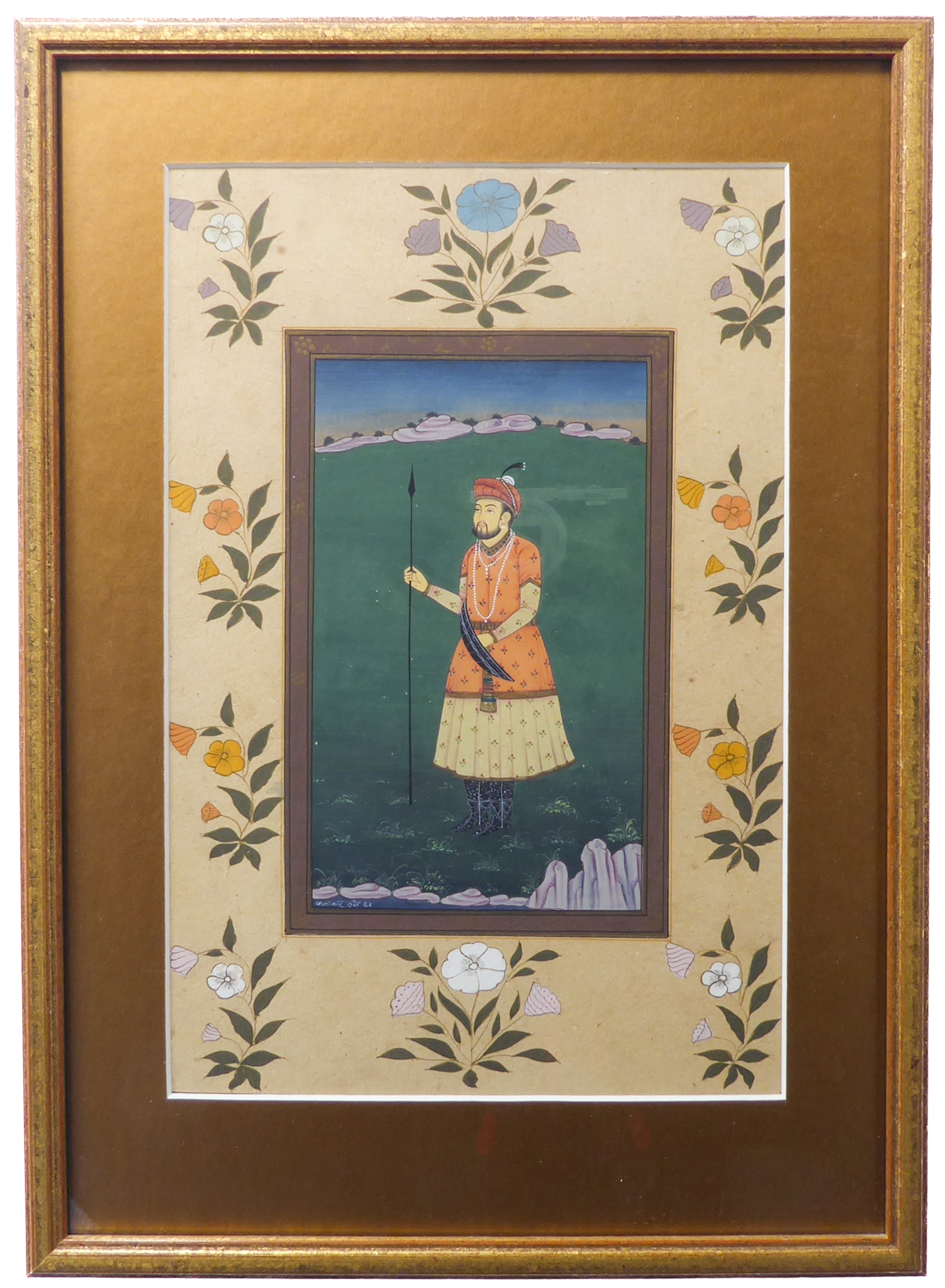 A late 19th / early 20th century Indian school gouache on paper study of a nobleman with spear and red headdress and jacket, signed lower left, later glazed gilt frame (20 cm x 12.5 cm)