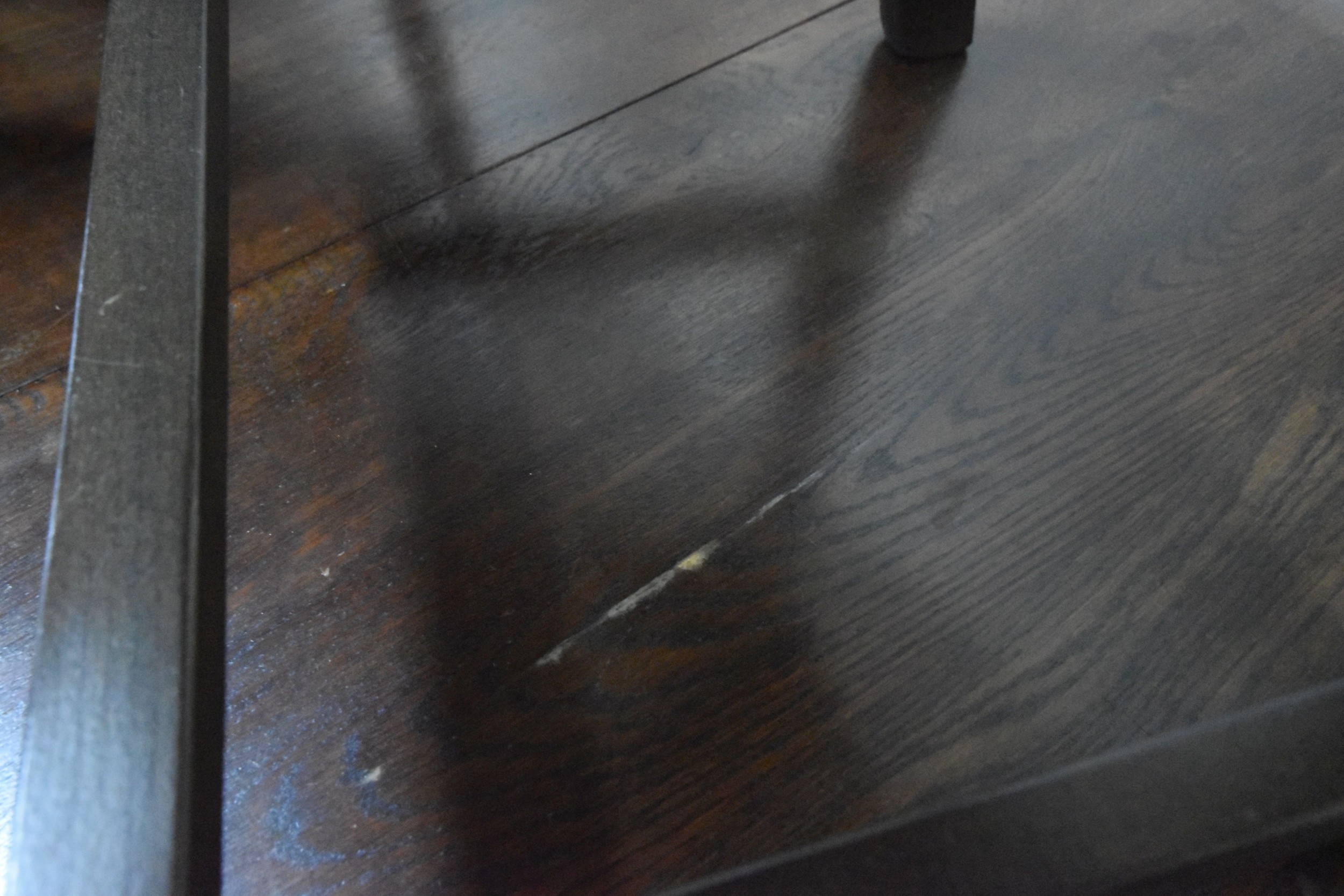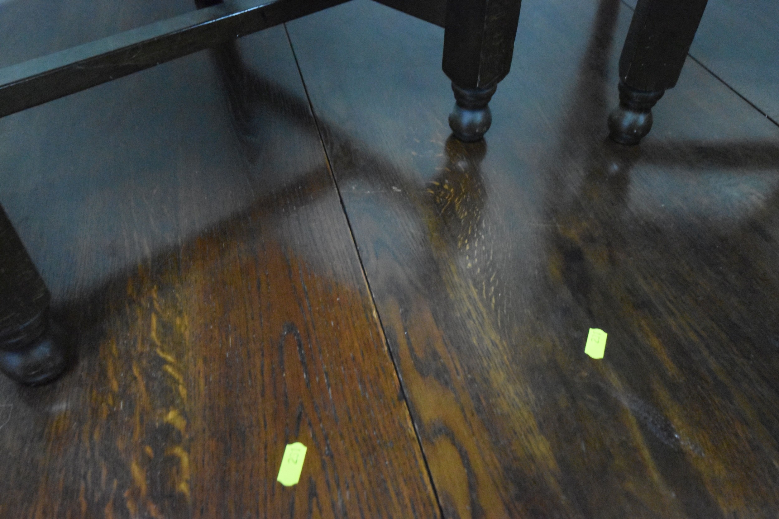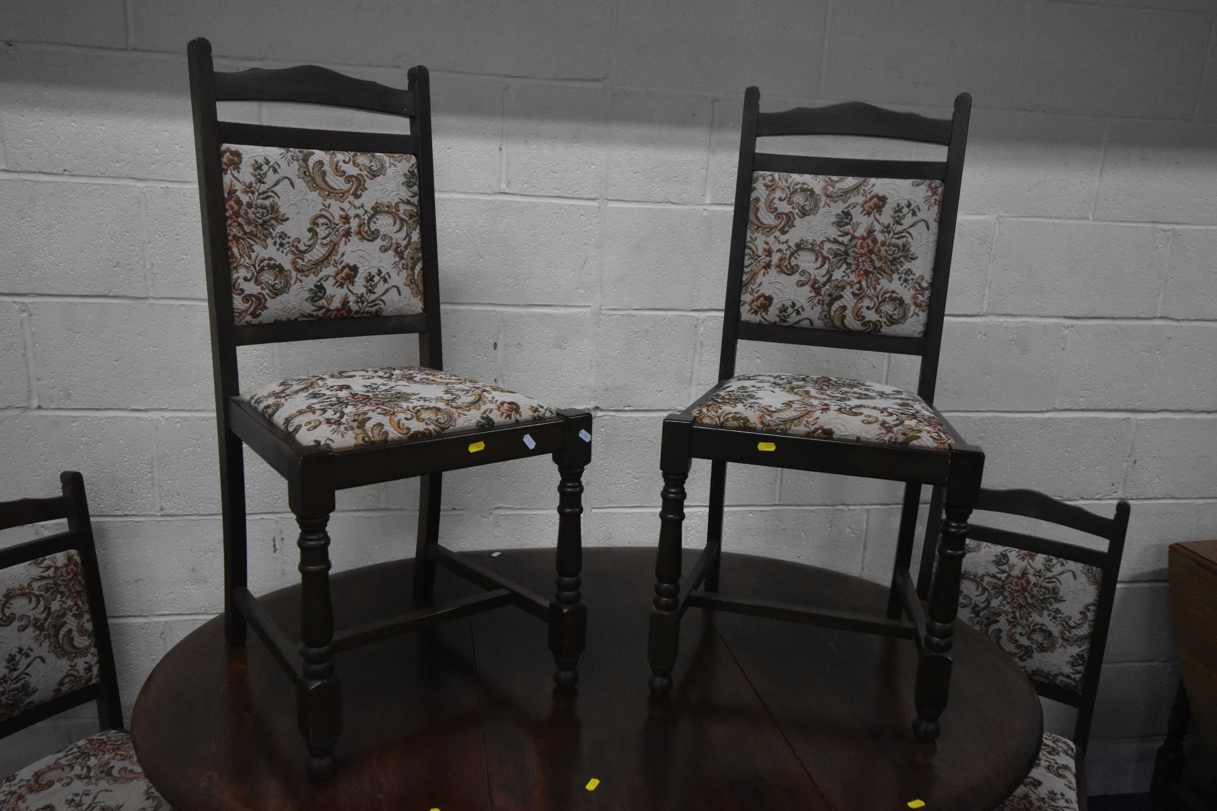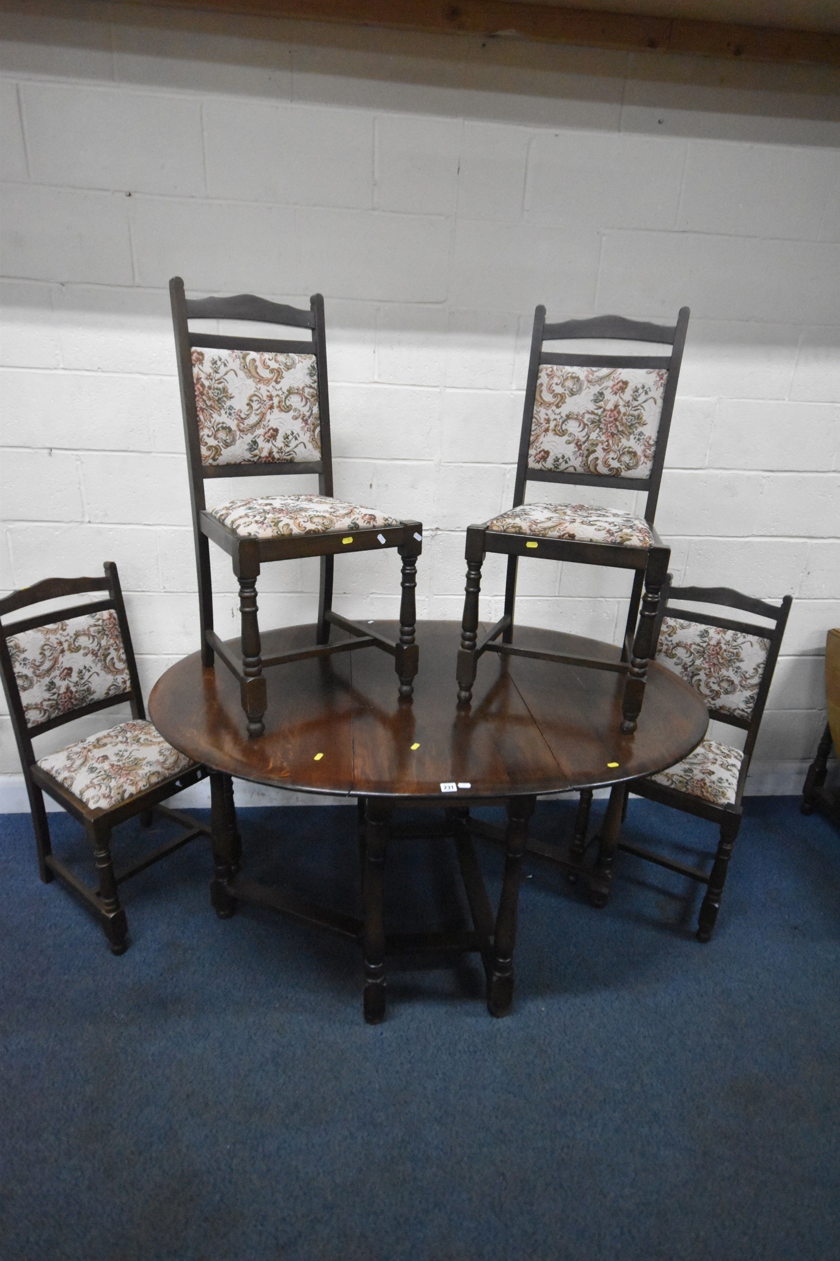 AN EARLY 20TH CENTURY OAK OVAL GATE LEG TABLE, open width 149cm x closed width 49cm x depth 105cm x height 78cm, along with a set of four chairs, condition report: marks, scuffs, discolouration, scratch to table top, other wear and usage (5)