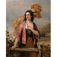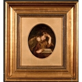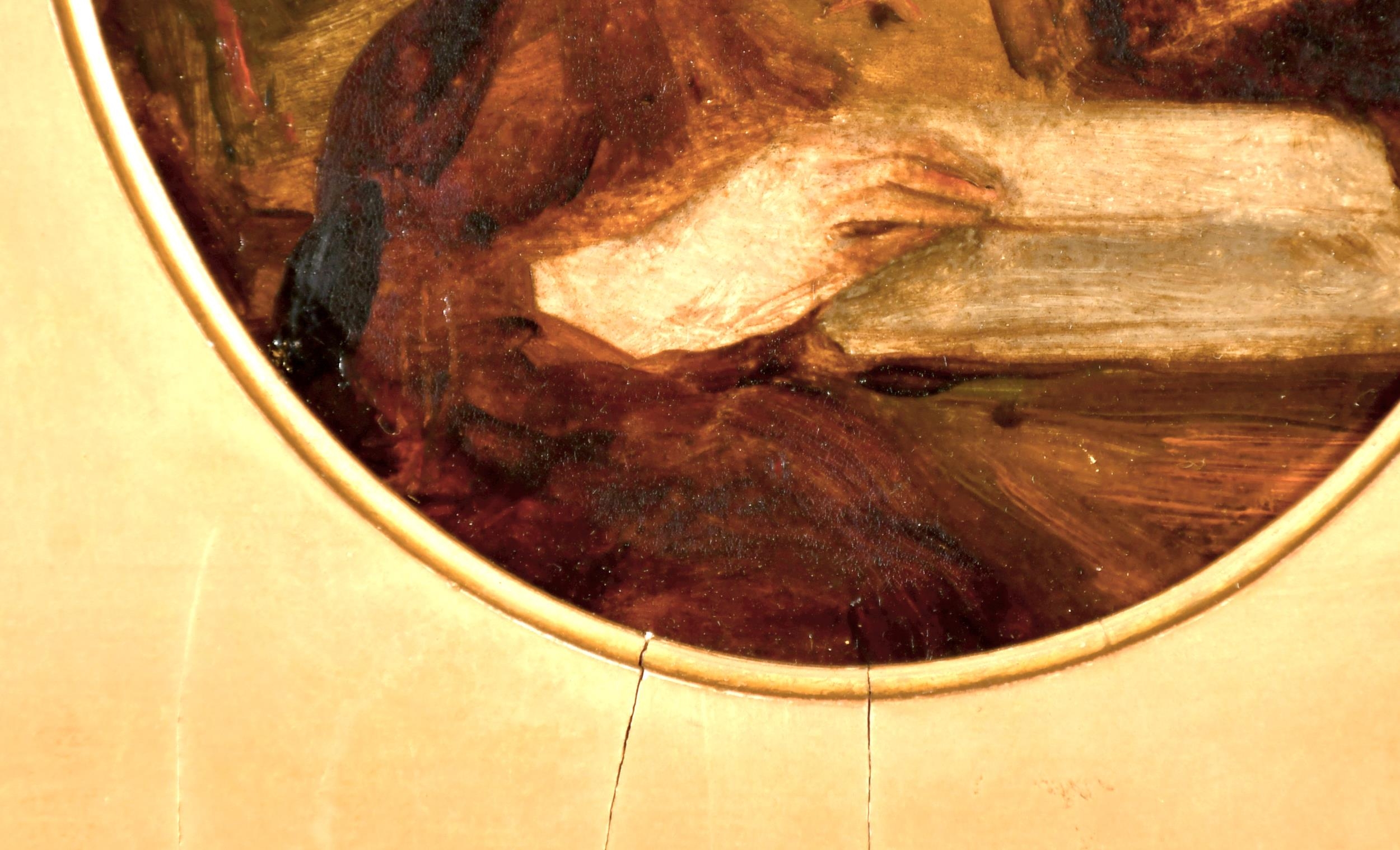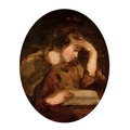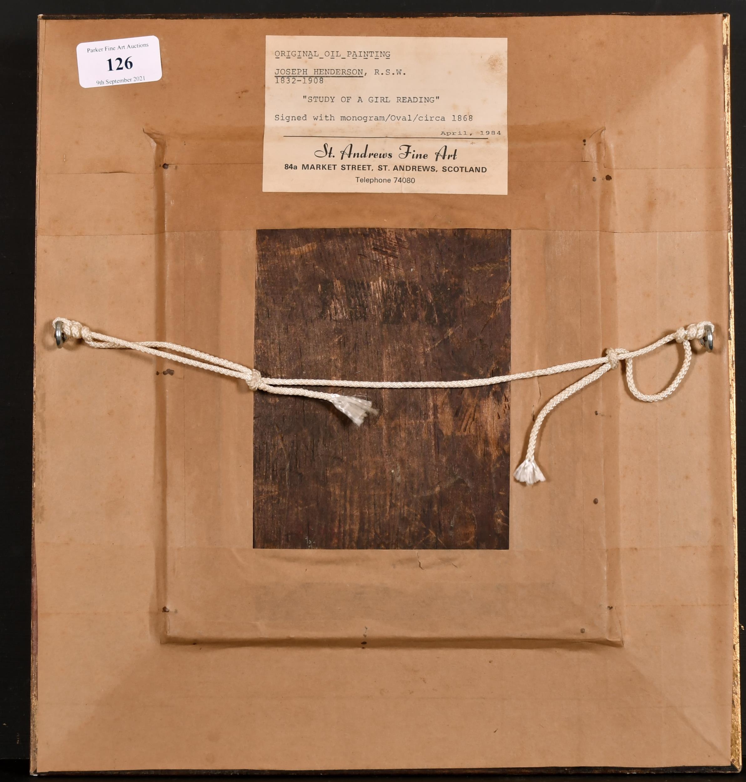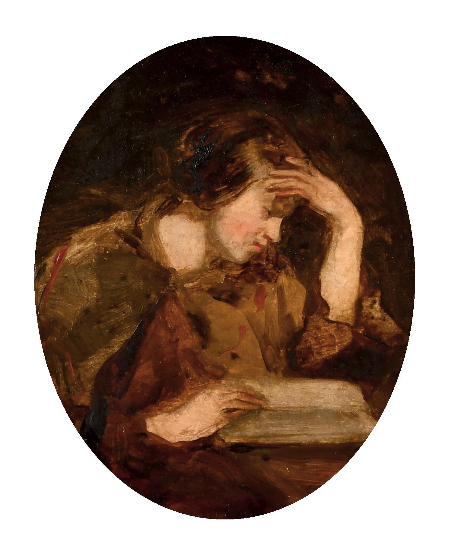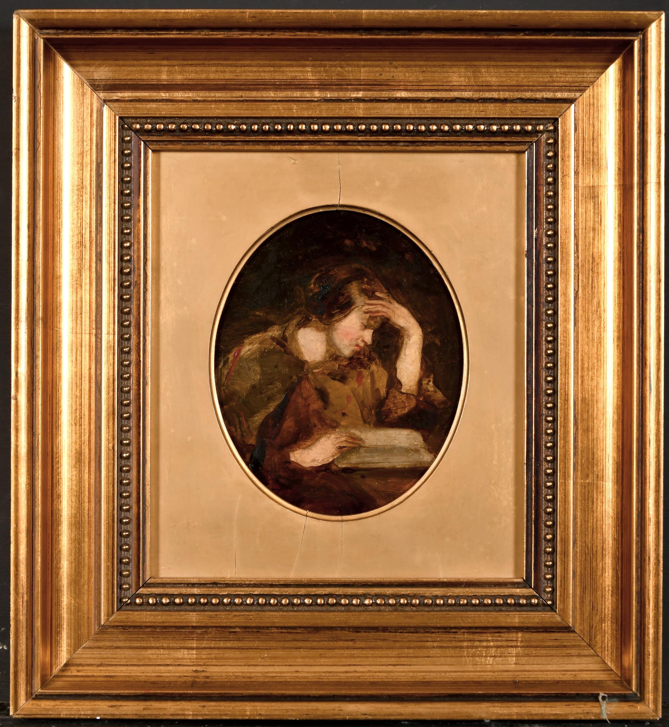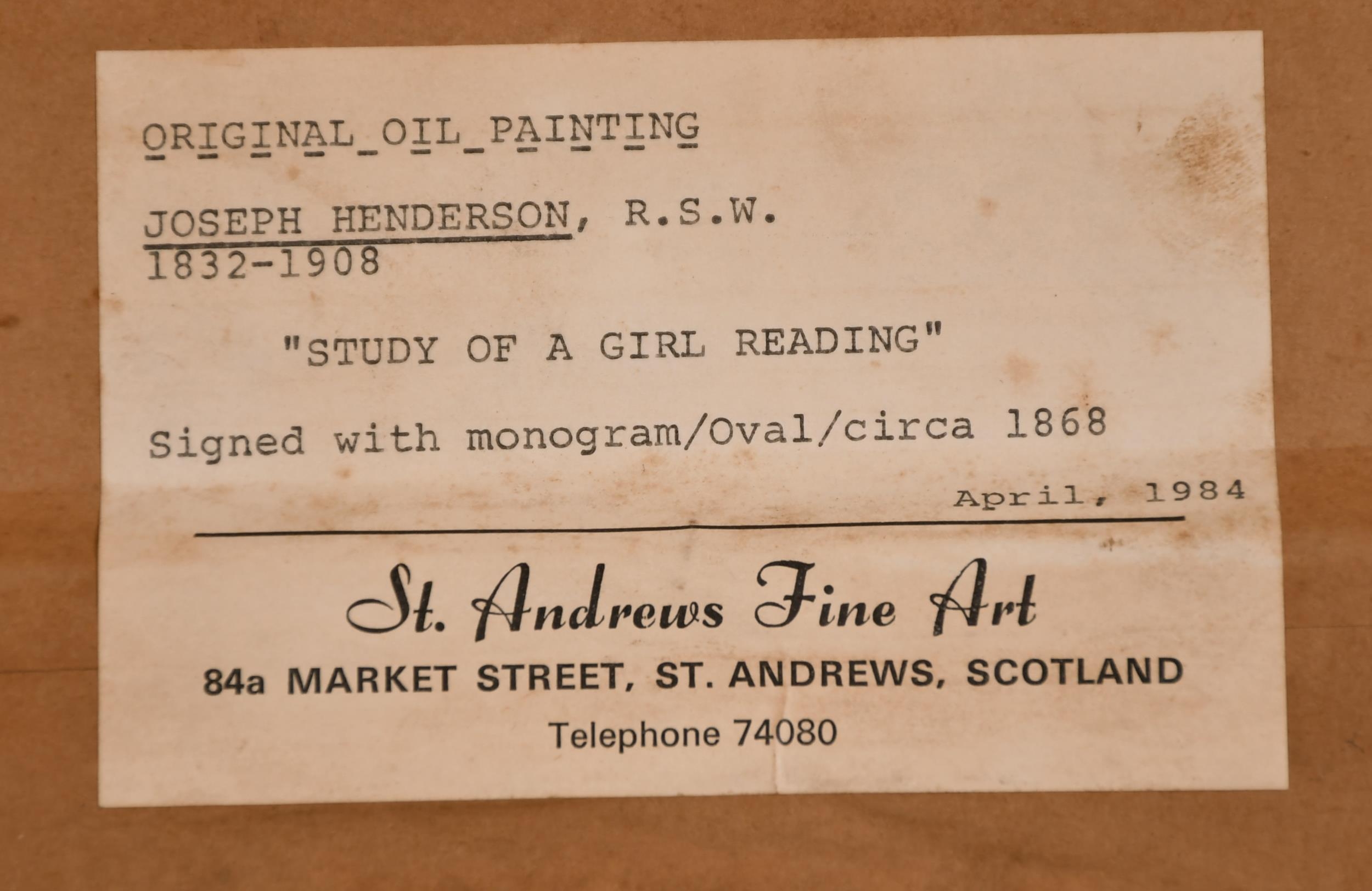 Joseph Henderson (1832-1908) British. "Study of a Girl Reading", Oil on Board, Signed with Monogram, and Inscribed on label verso, Oval 6.25" x 5" (15.8 x 12.7cm)