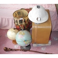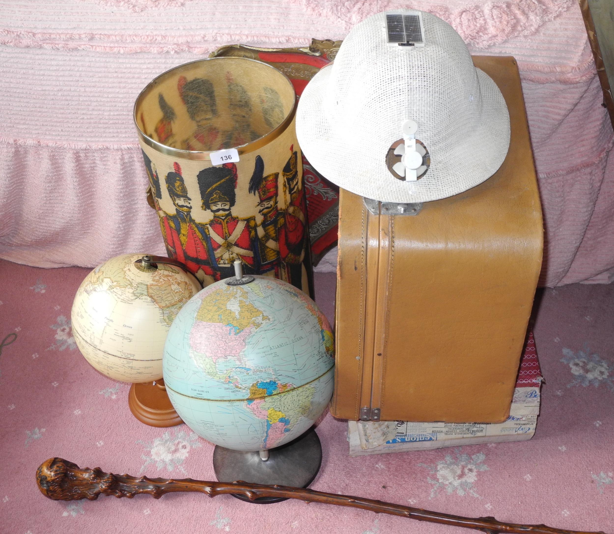 A root wood walking cane; a globe; another; a military waste paper bin; etc