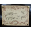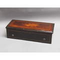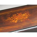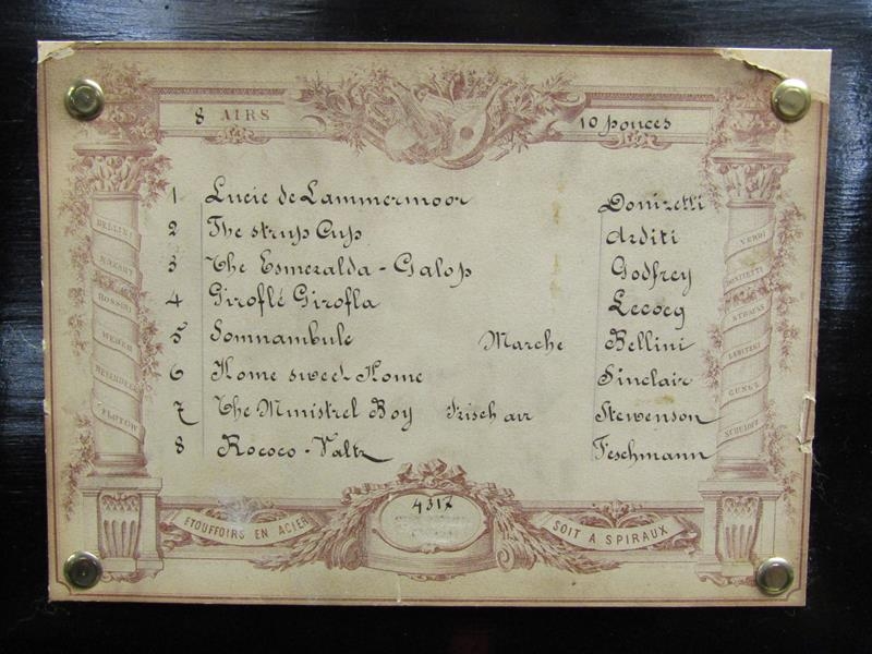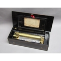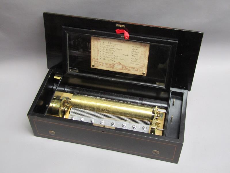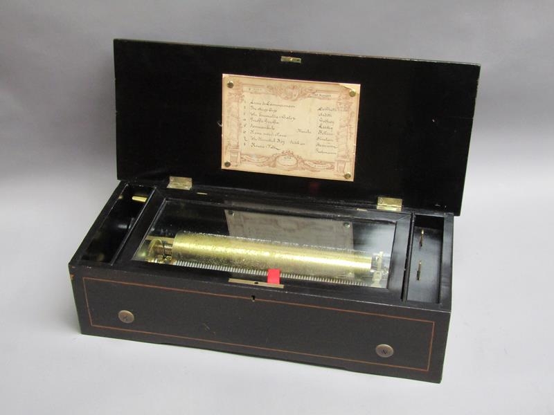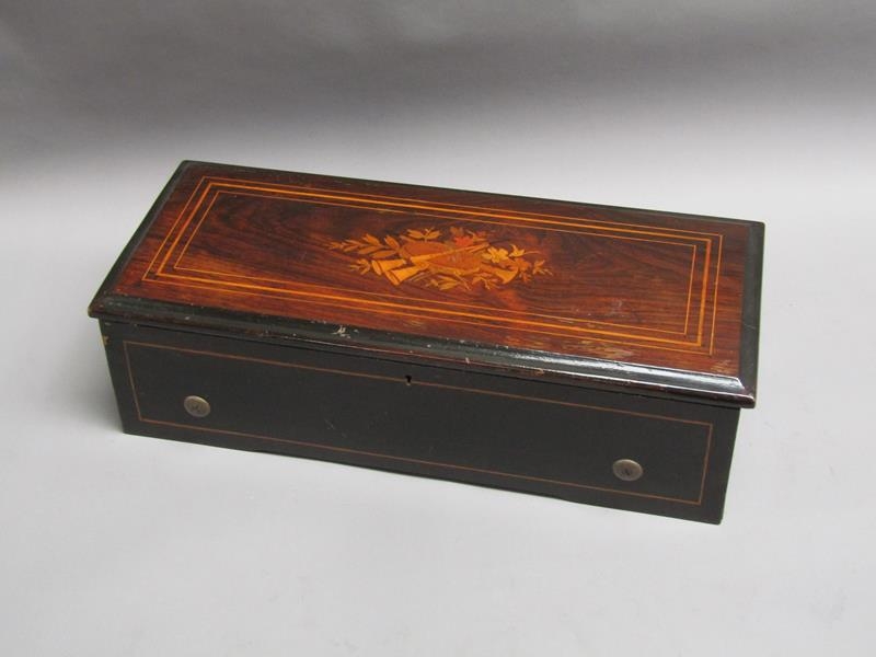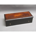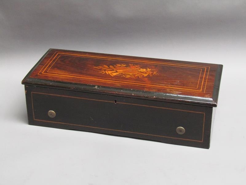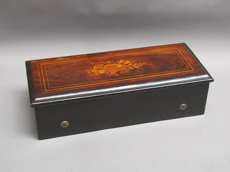 A late 19c Swiss music box playing eight airs on a 27cm long pinned barrel with a seventy four tooth comb. The box has a rosewood finish top with rectangular line inlays and a central inlay of musical instruments and foliage. Inside the lid is the original paper indicating the tunes played. The box is 51cm w overall.