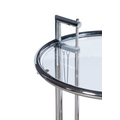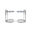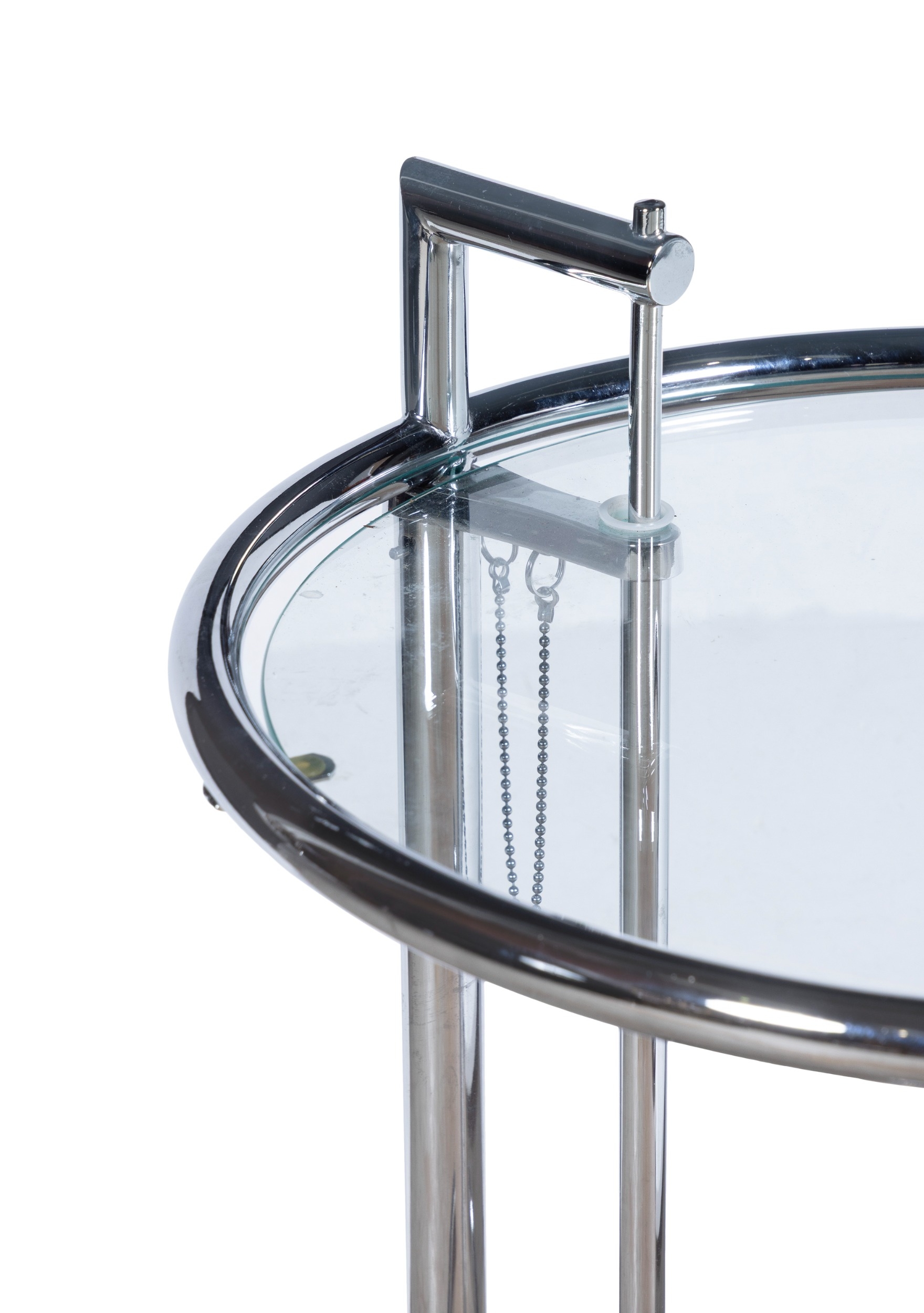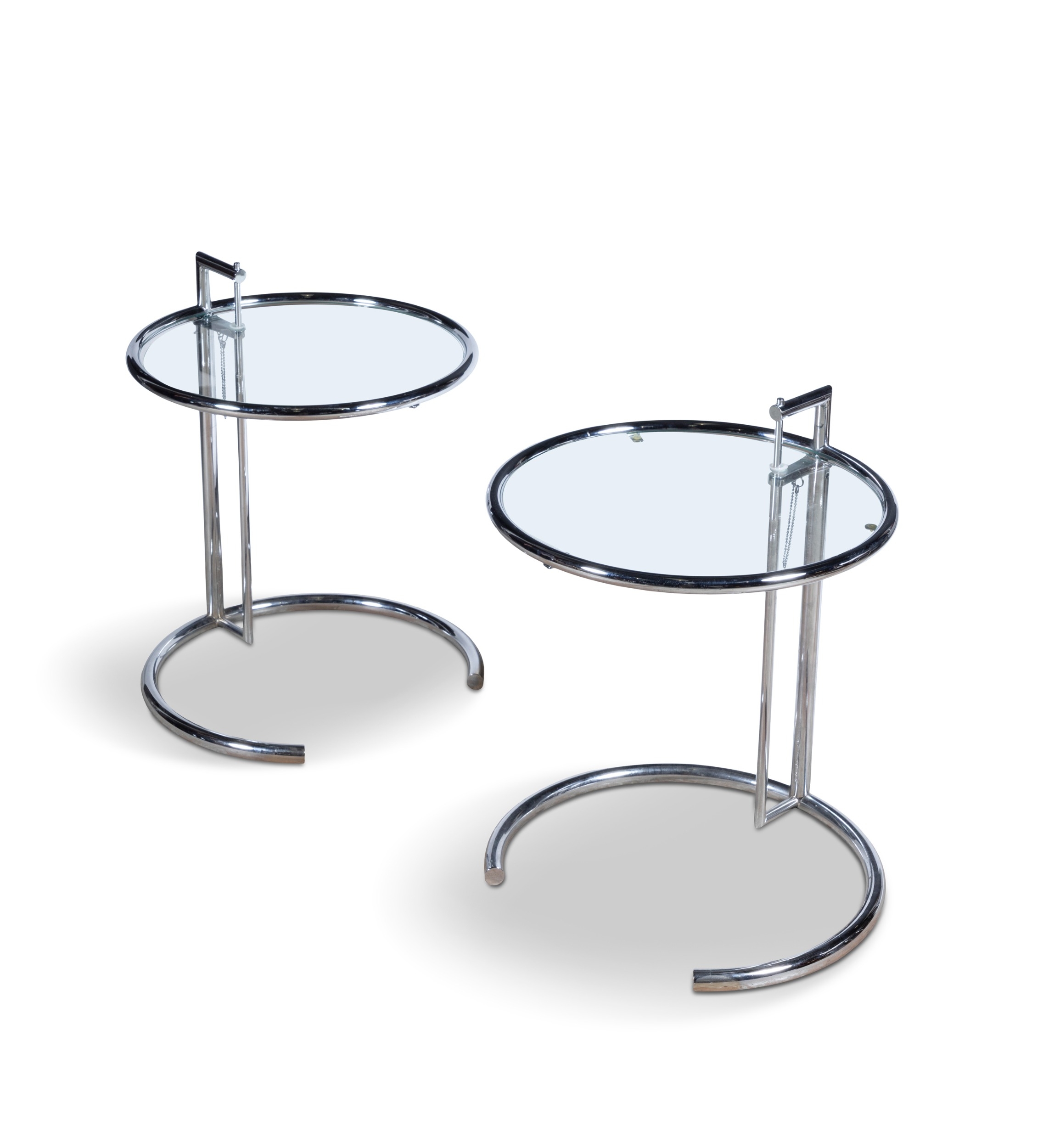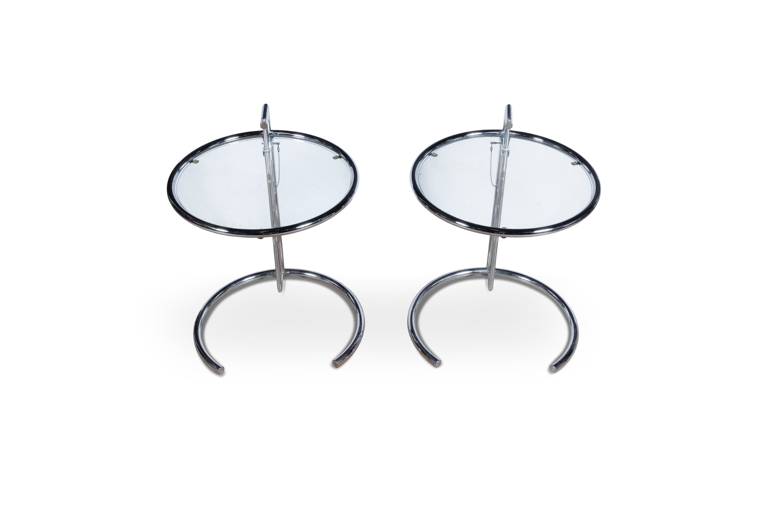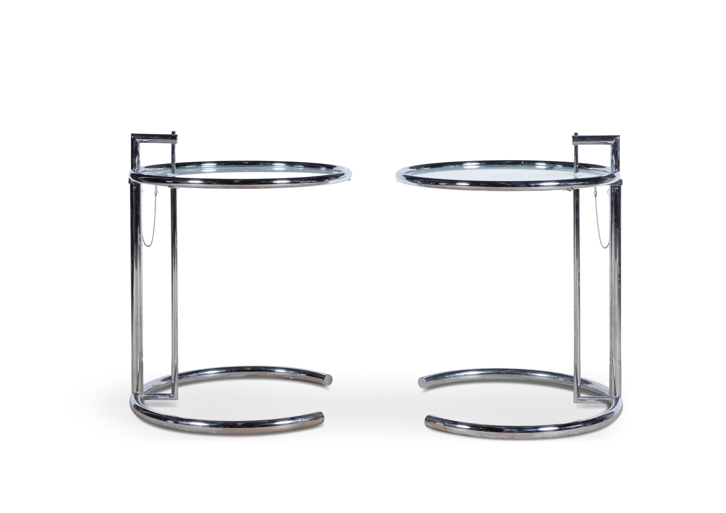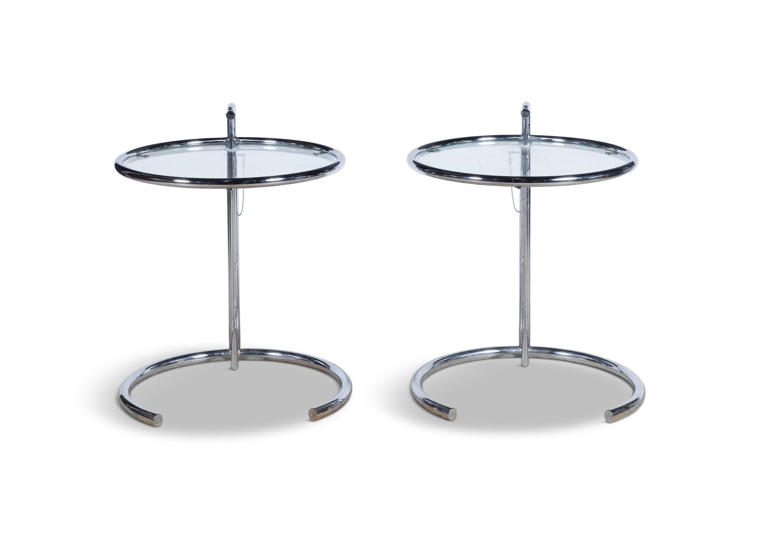 EILEEN GRAY (1878-1976) A pair of E1027 adjustable side tables by Eileen Gray. Chrome with glass tops. Produced by Classicon. With maker's stamp. 51 x 51 x 51- 90cm (h)