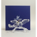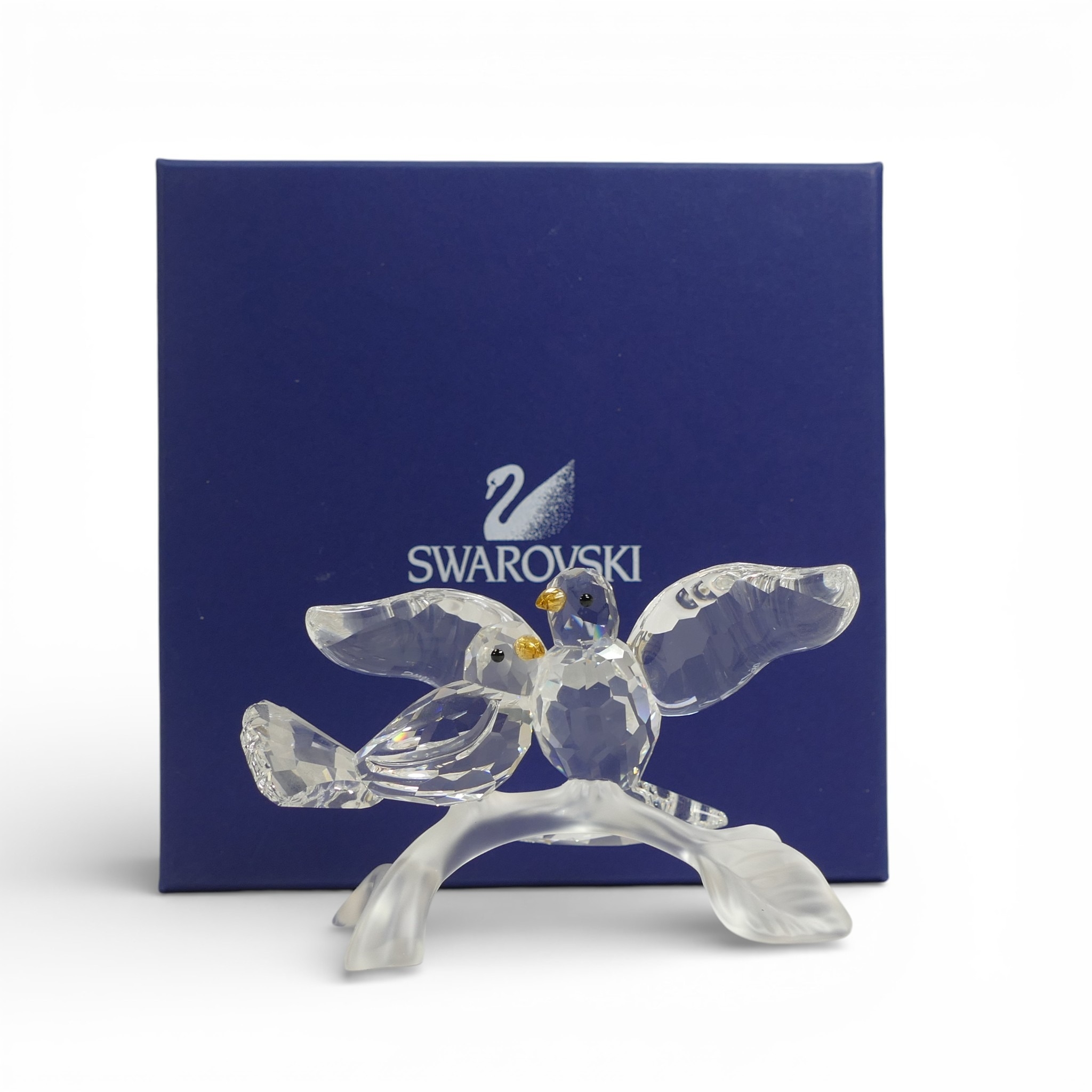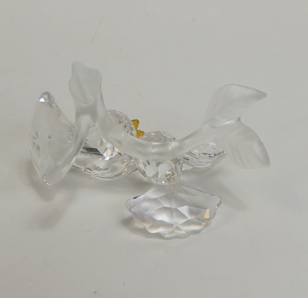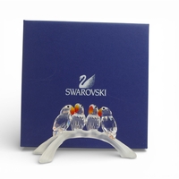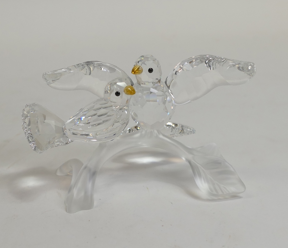 Swarovski crystal Turtledoves are part of the Feathered Beauties collection. This pair comes in faceted clear crystal with eyes in Jet and beaks in Topaz crystal, perched on a frosted crystal branch (657378) retired 2013, designed by Adi Stocker. H:-6cm. boxed with certificate.