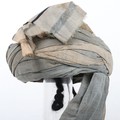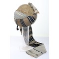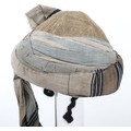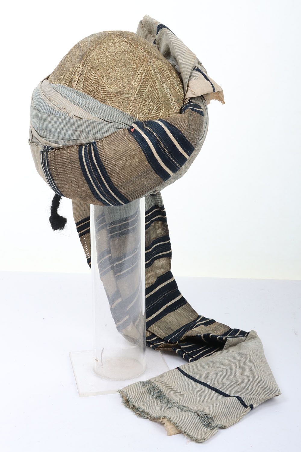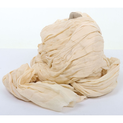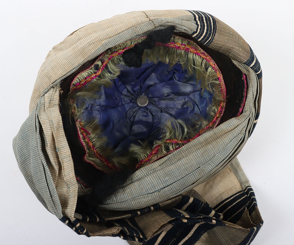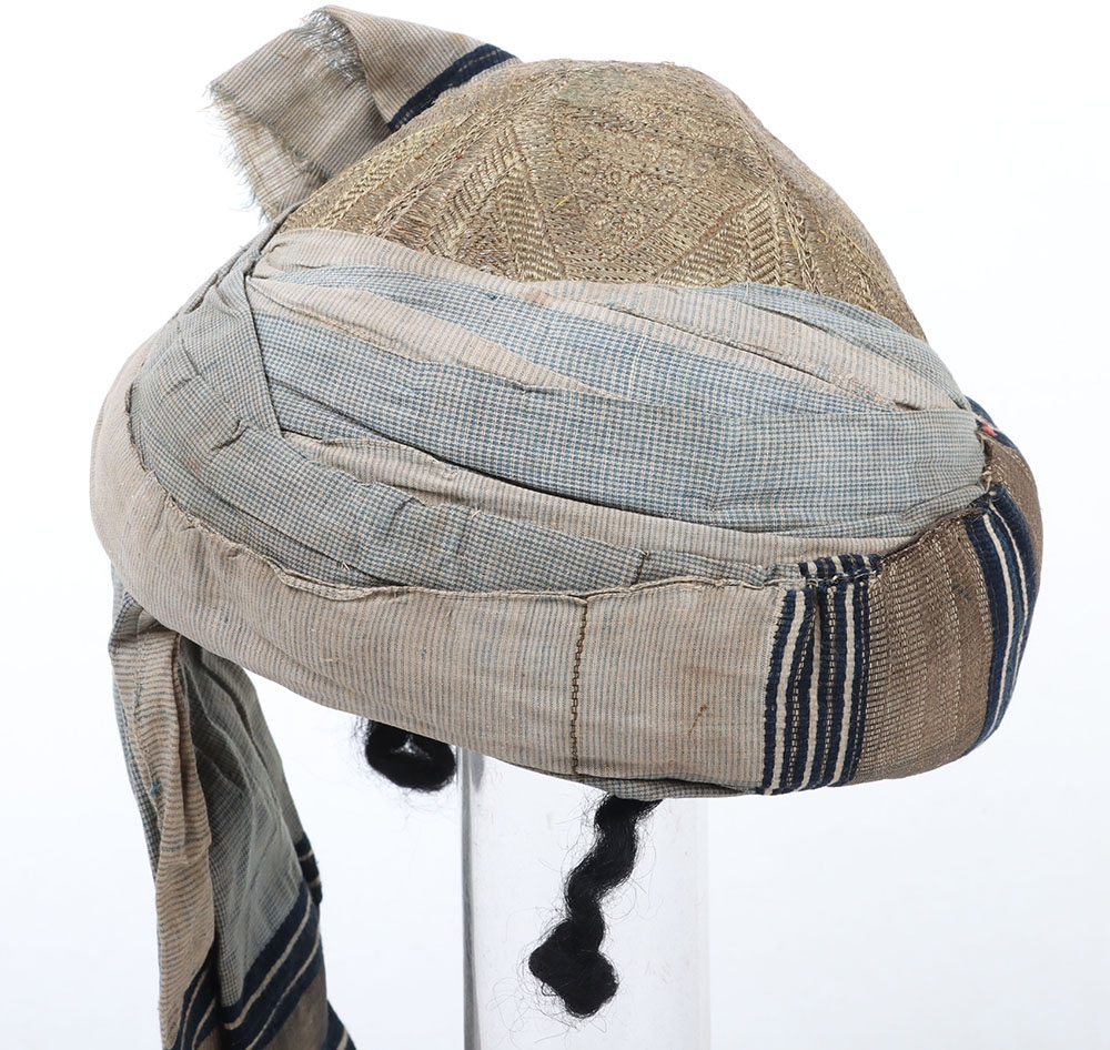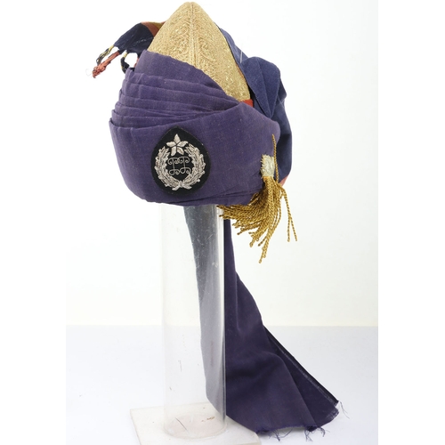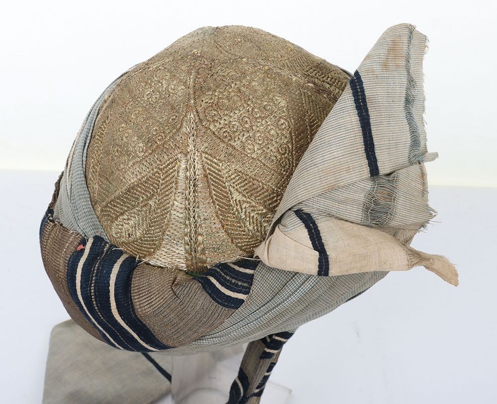 Indian Army Turban, made from fawn, grey and blue cloth with gilt embroidery crown. In good condition.