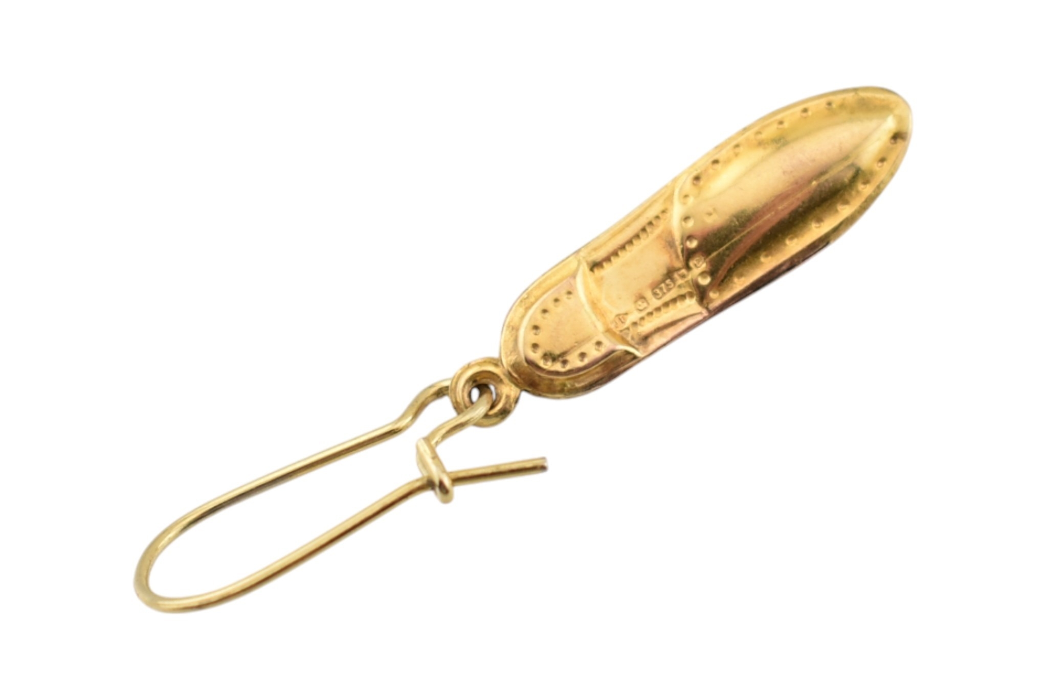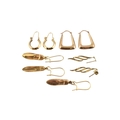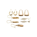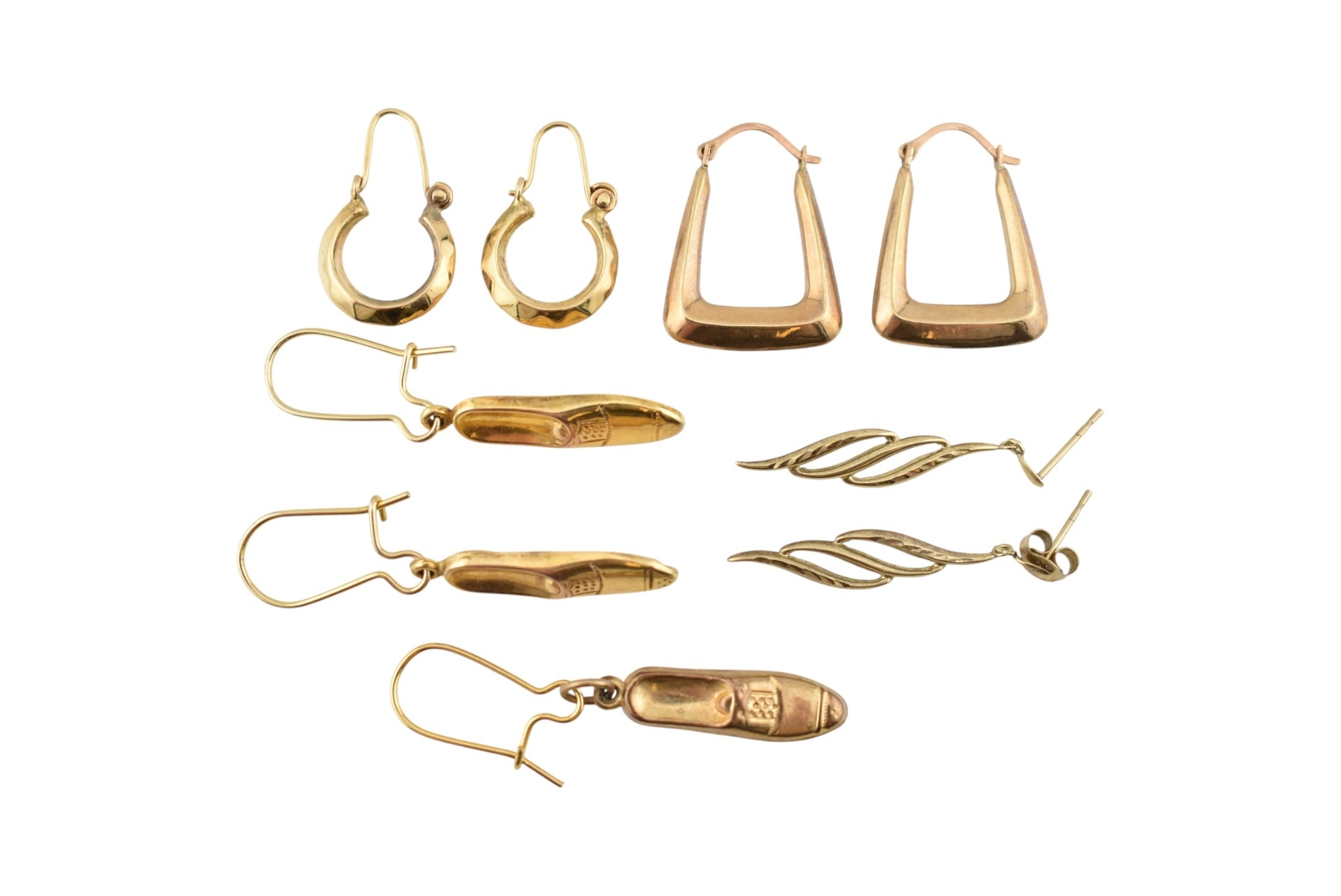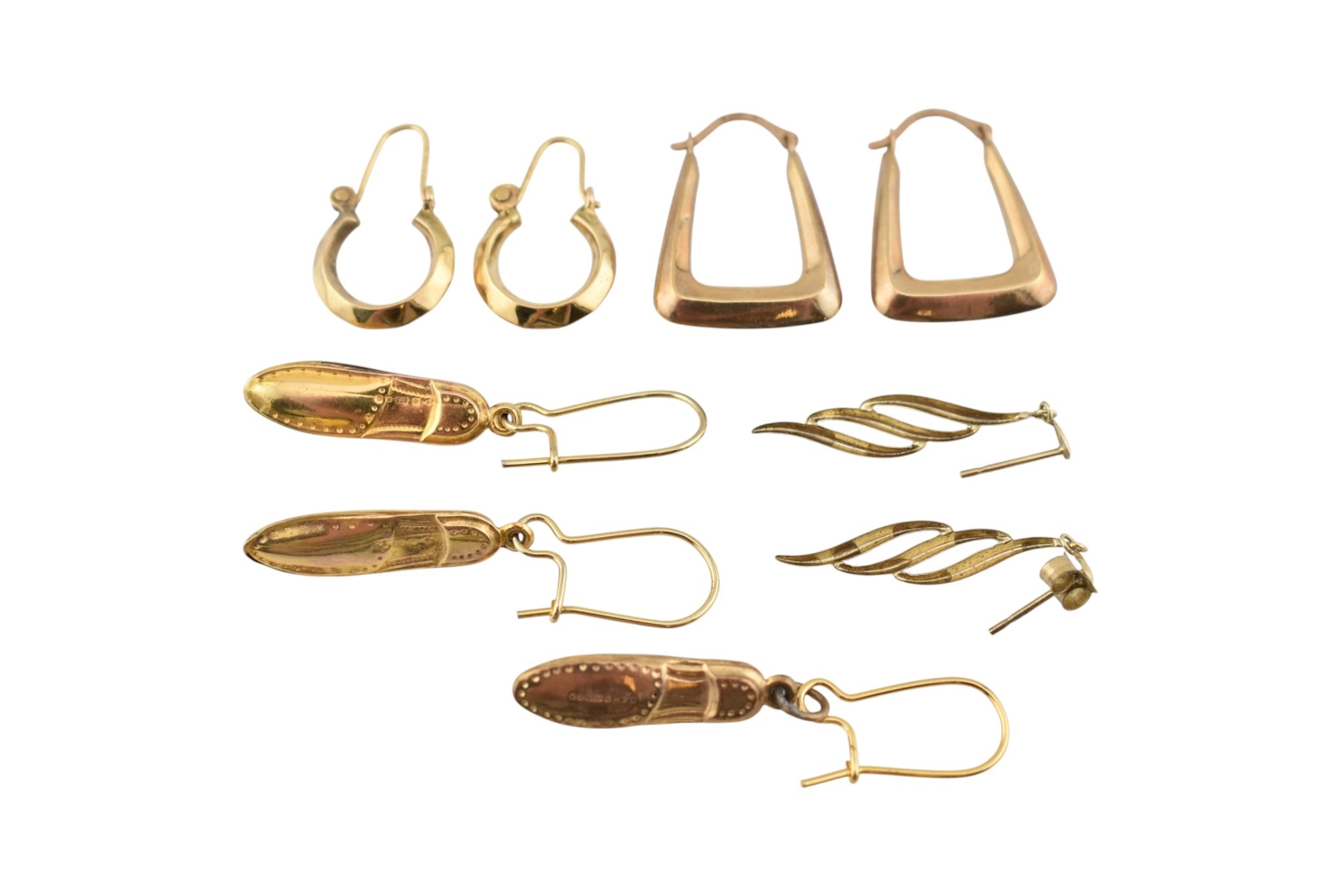 An assortment of 9ct gold earrings. To include shoe pendant earrings, hallmarked London. Two feather earrings unmarked and two pairs of creole type earrings stamped 375. Total weight 5.3g