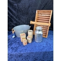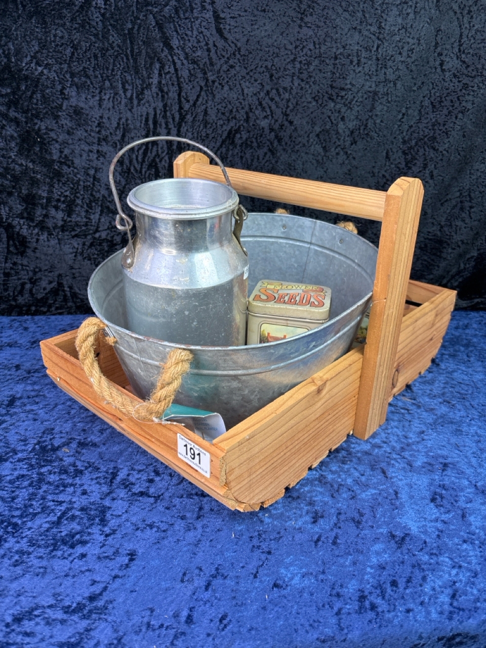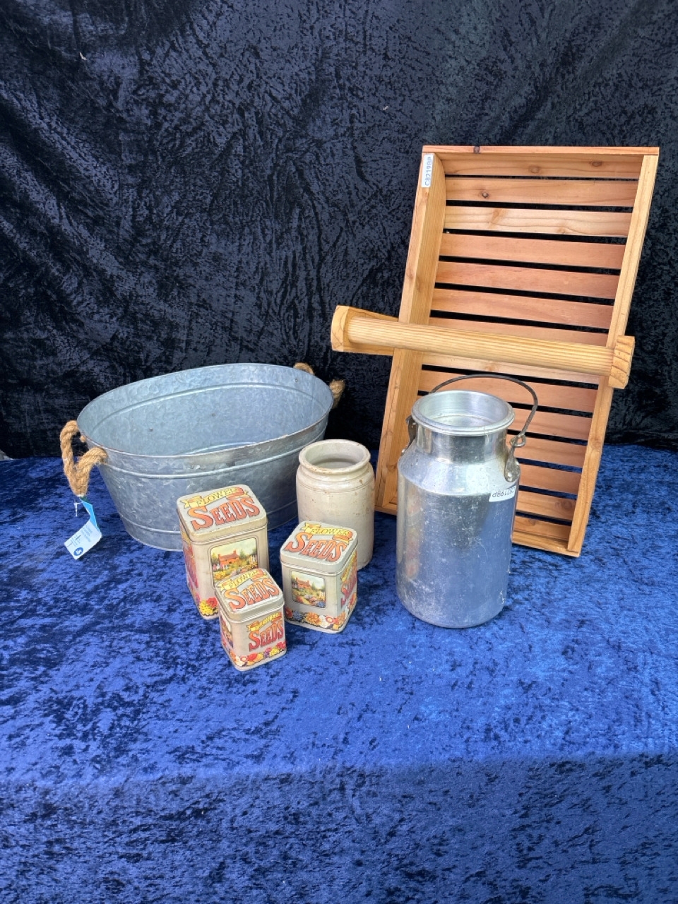 Lovely selection of garden interest items inc pretty seed tins, wooden trug, tub and fab vintage milk canister