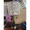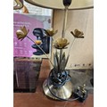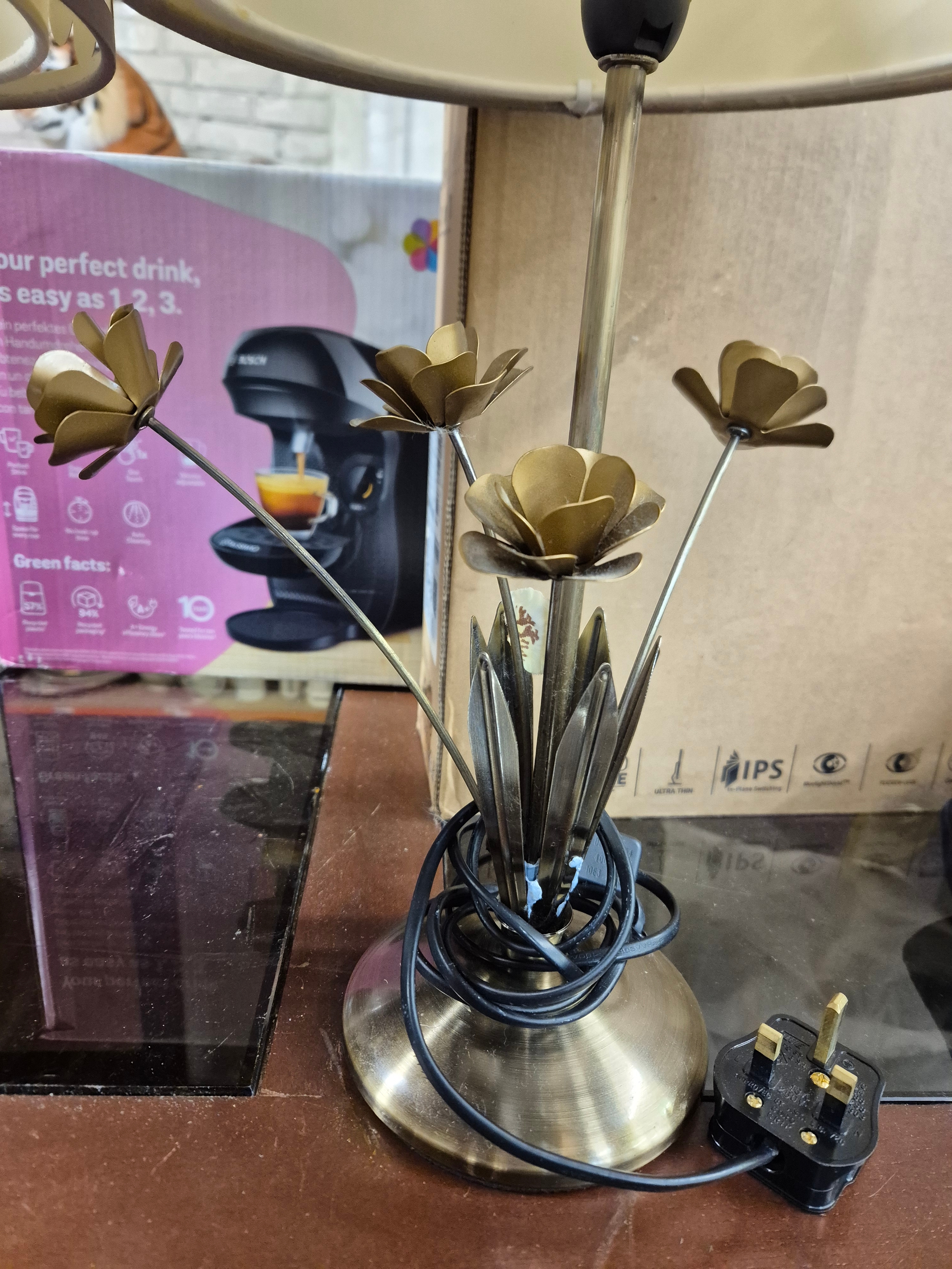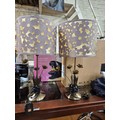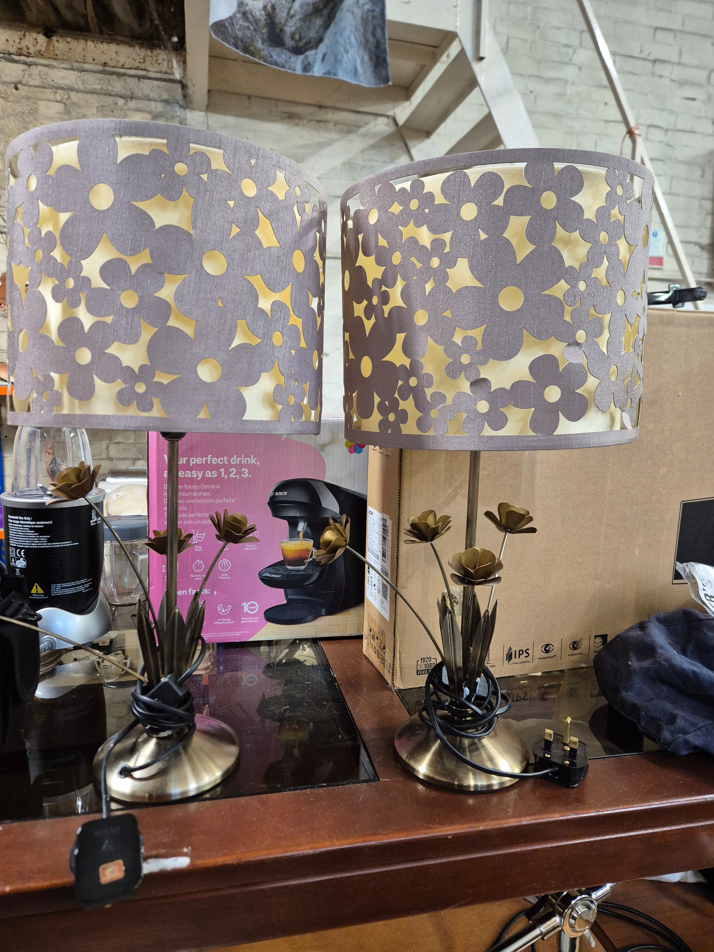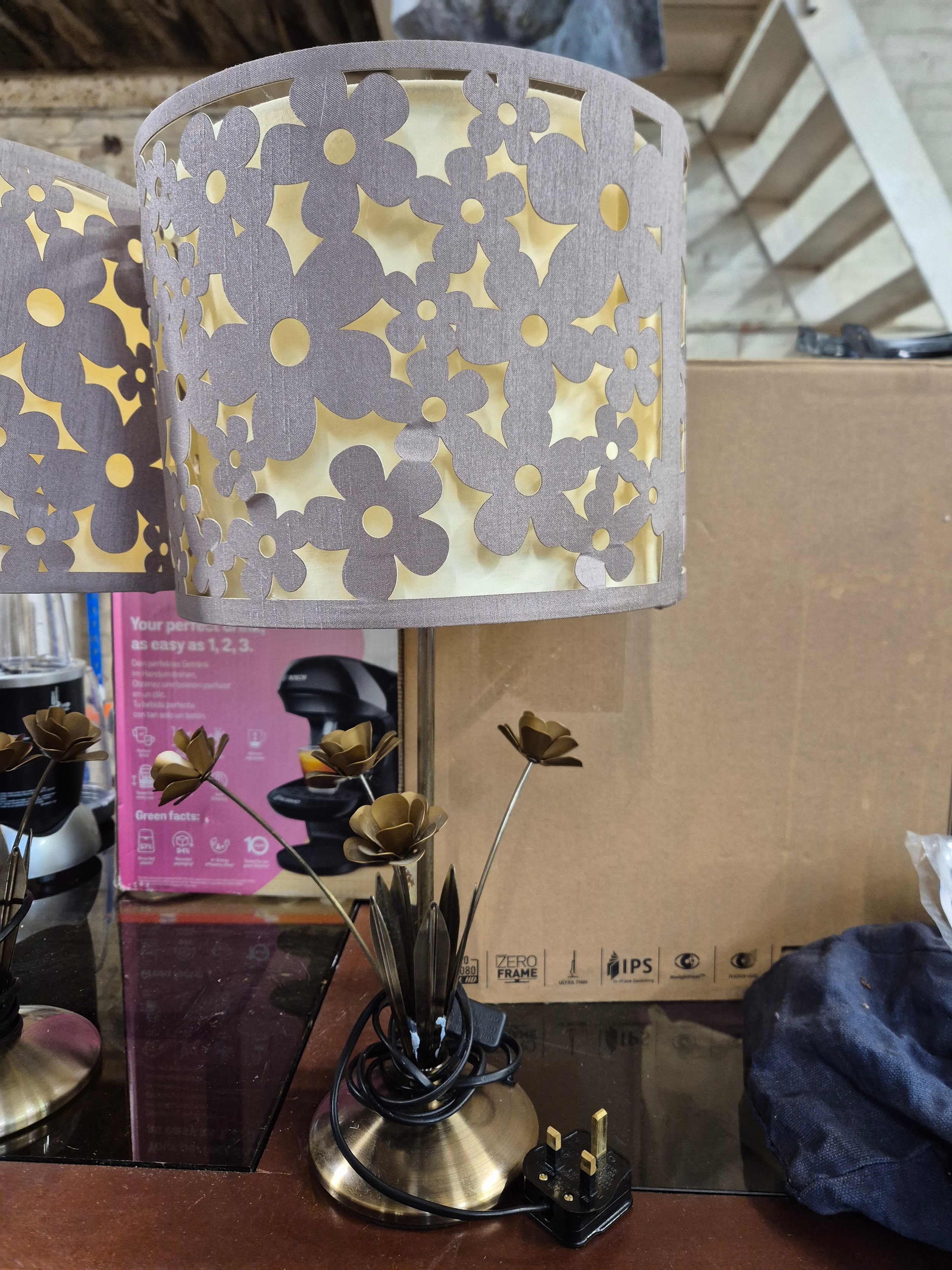 Pair of table lamps with a cut-out floral pattern shades and metal bases with decorative leaves.