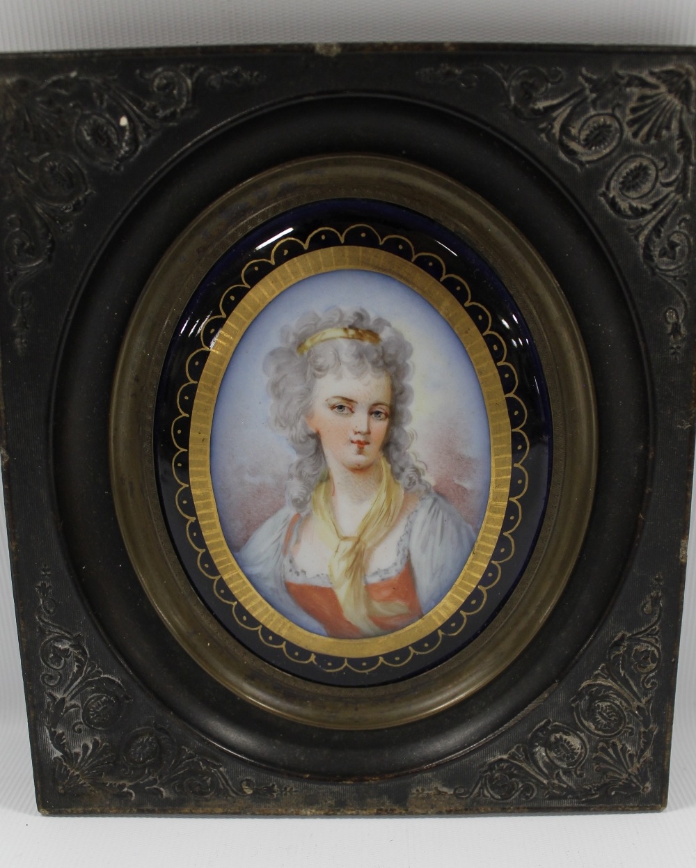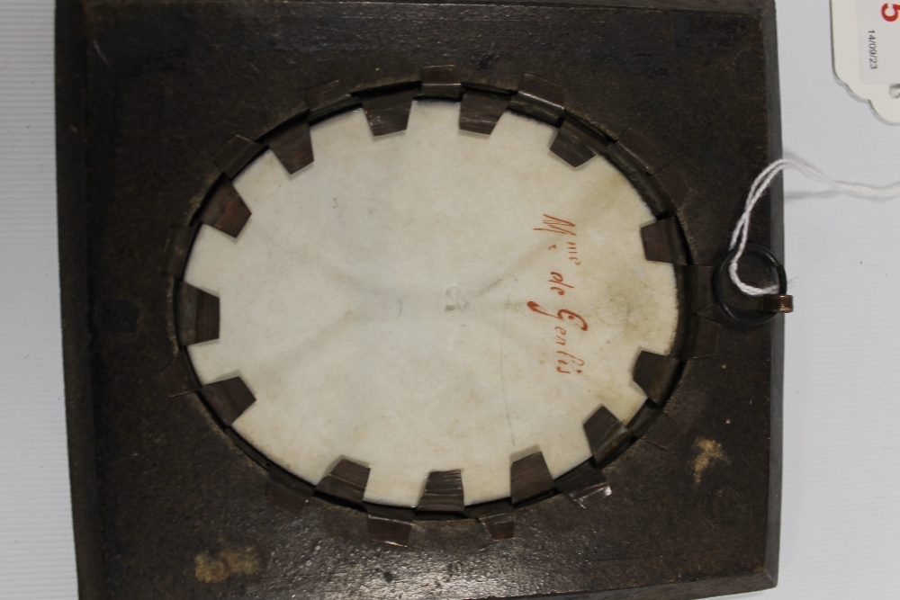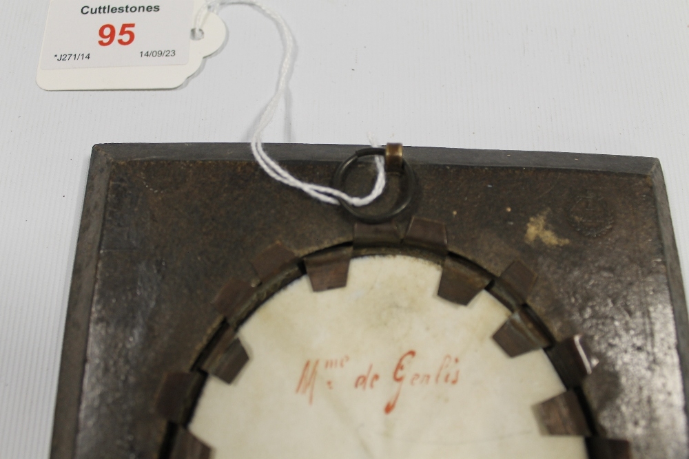 A 19TH CENTURY OVAL PORTRAIT STUDY OF MADAME DE GENLIS, (see verso), on ceramic panel, unsigned, framed in decorative frame, 7 x 5.5 cm