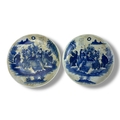 A Pair of antique Chinese Blue and White Porcelain Plates with Immortal Figures. Hand-painted cobalt blue and white glazed porcelain with scenic and calligraphic decoration. Marking on bases with central blue longevity symbol. General good condition with Age-related wear, light surface stains, and discoloration consistent with age; no visible cracks or major chips. Approximately 26.5cm diameter x 3.5cm height. Please see photos or request a condition report.