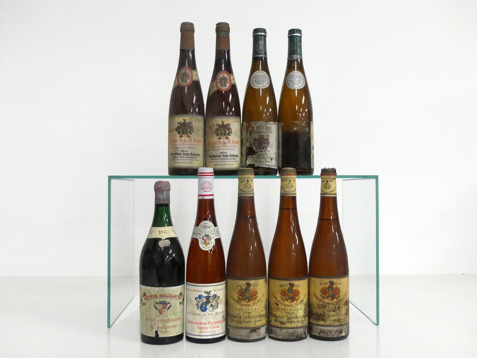 1 bt Arthur Hallgarten Assinannhaüser Spatburgunder 1957 bs, sl cdl 1 bt Bürklin-Wolf Deidesheimer Hohenmorgen Riesling Cabinet 1959 sl bs 3 bts Jacob Bamm Winkeler Jesuitengarten Riesling Auslese Cabinet 1964 bs, cdl 2 bts Dr. A Senster Niersteiner Rohr-Rehbach Riesling 1964 TBA bs 1 bt Schloss Vollrads Grünsilber Riesling 1978 bs, cdl, pt dis 1 bt believed Schloss Vollrads Grünsilber Riesling Vintage Unknown bs, cdl, dis Above 9 bottles